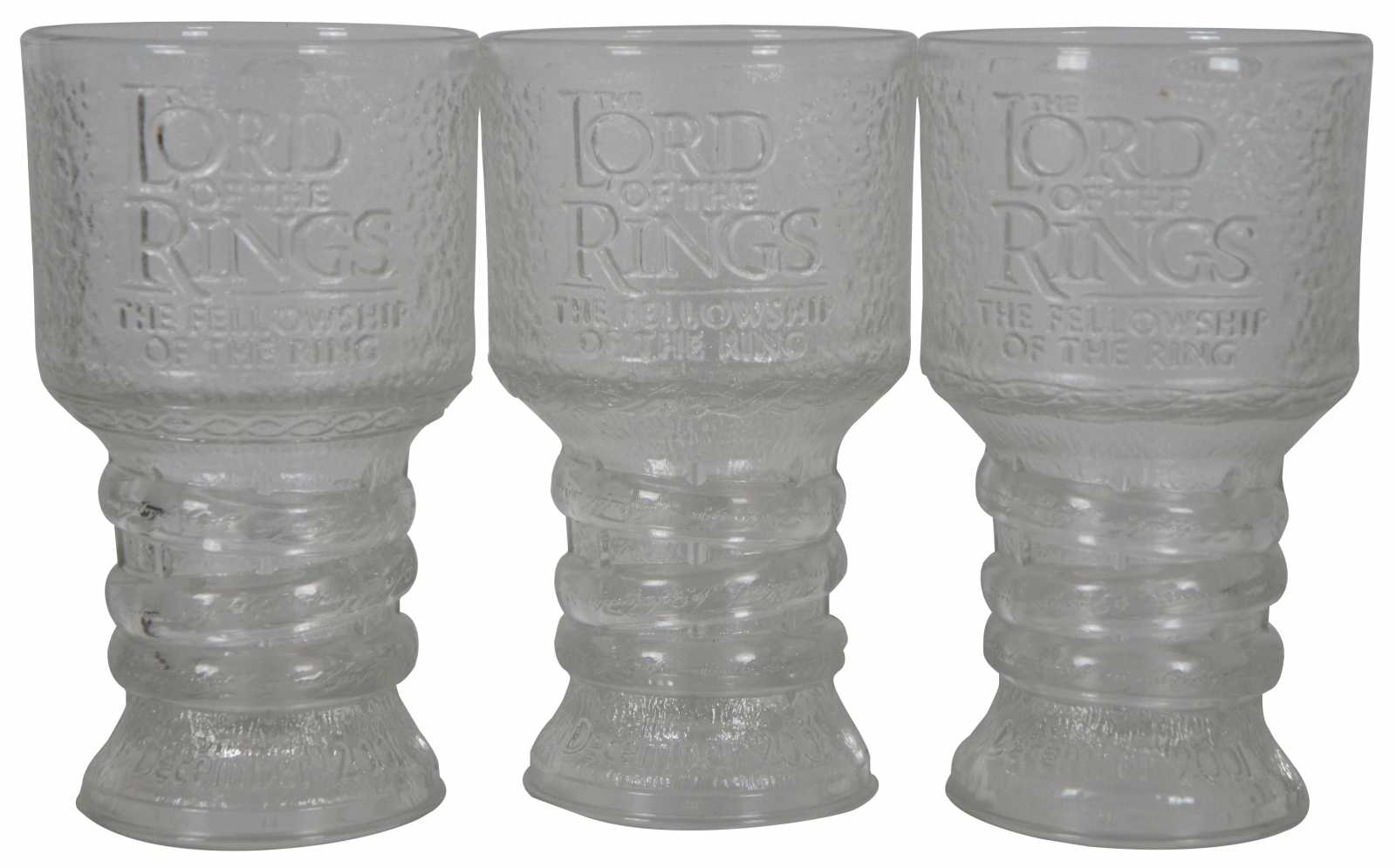 Set of 3 original Lord of the Rings: The Fellowship of the Ring promotional, collectible glass goblets with illuminated bases and original packaging, produced for Burger King in December 2001. Set includes Frodo, Arwen and Strider (Aragorn)