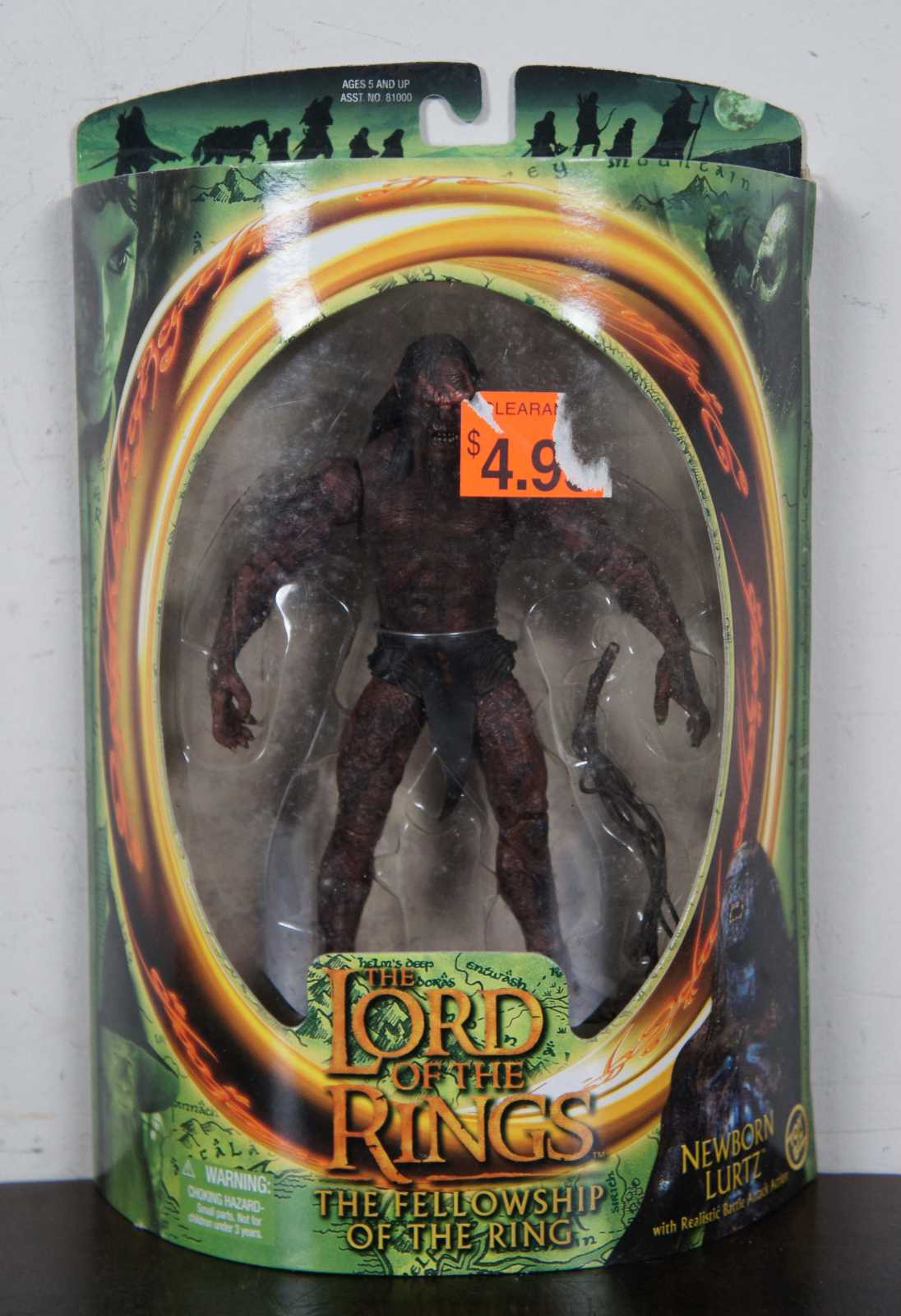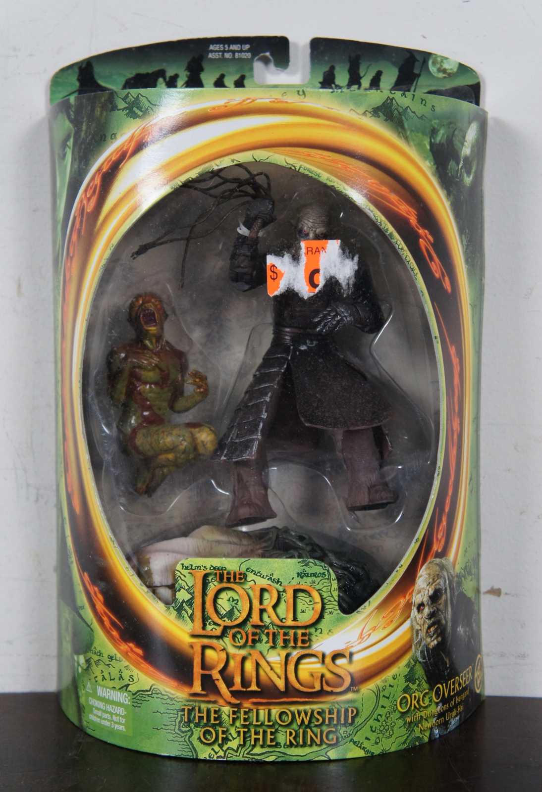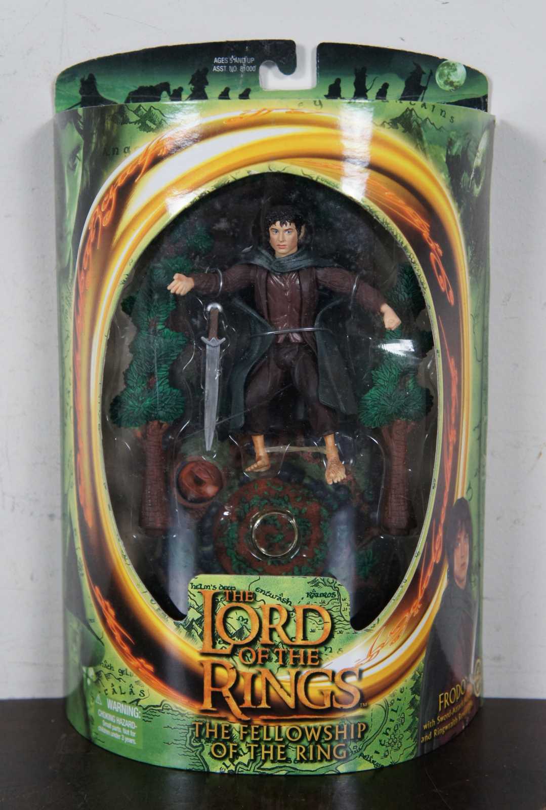 Set of eight vintage 2001 Toy Biz Lord of the Rings: The Fellowship of the Ring action figures with accessories in sealed boxes. Lot includes Aragorn, Legolas, Saruman, Newborn Lurtz, Orc Overseer, Frodo, Gimli, and Gandalf.