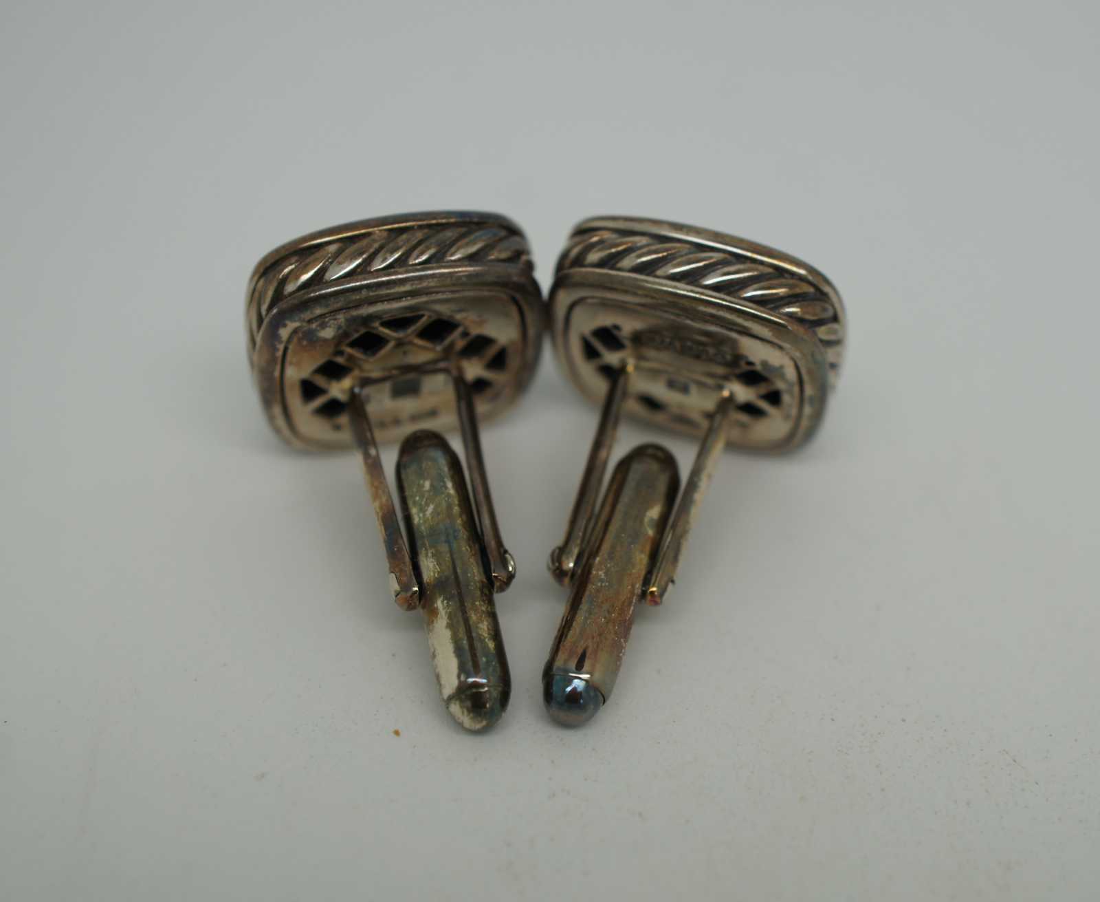 Vintage David Yurman sterling silver cufflinks with rope twist cable edges and square onyx center. Includes original bag.