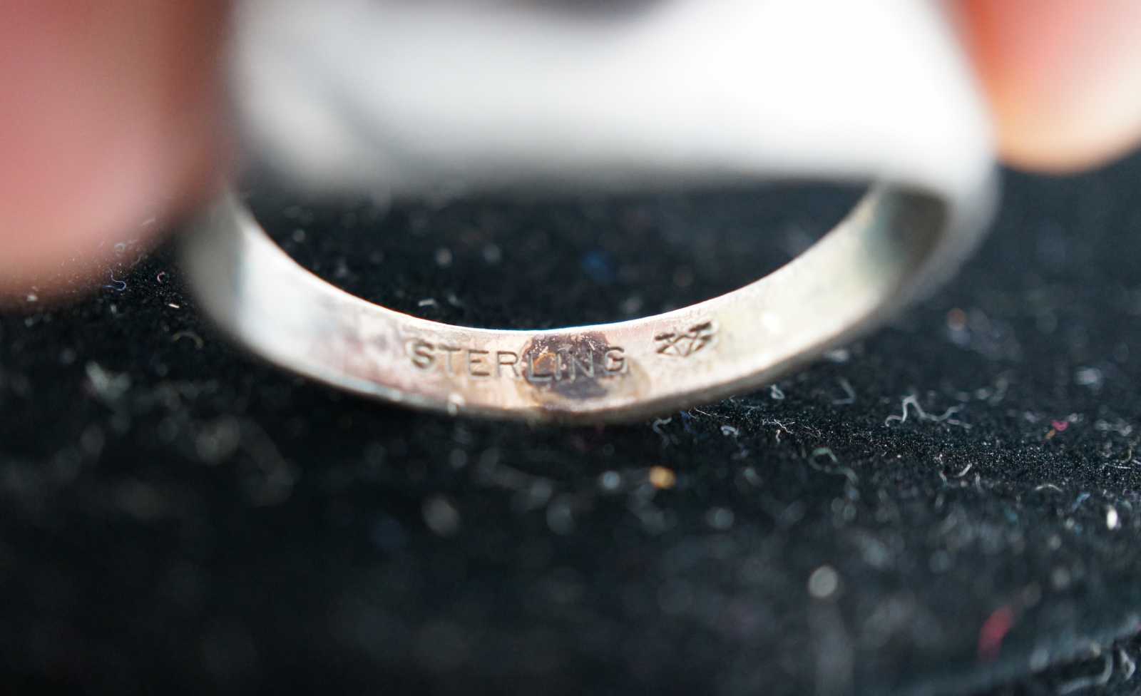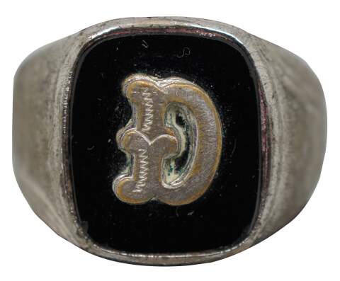 Mid century sterling silver signet ring by Vargas with the initial “D” in a Gothic font set on a black onyx surface.