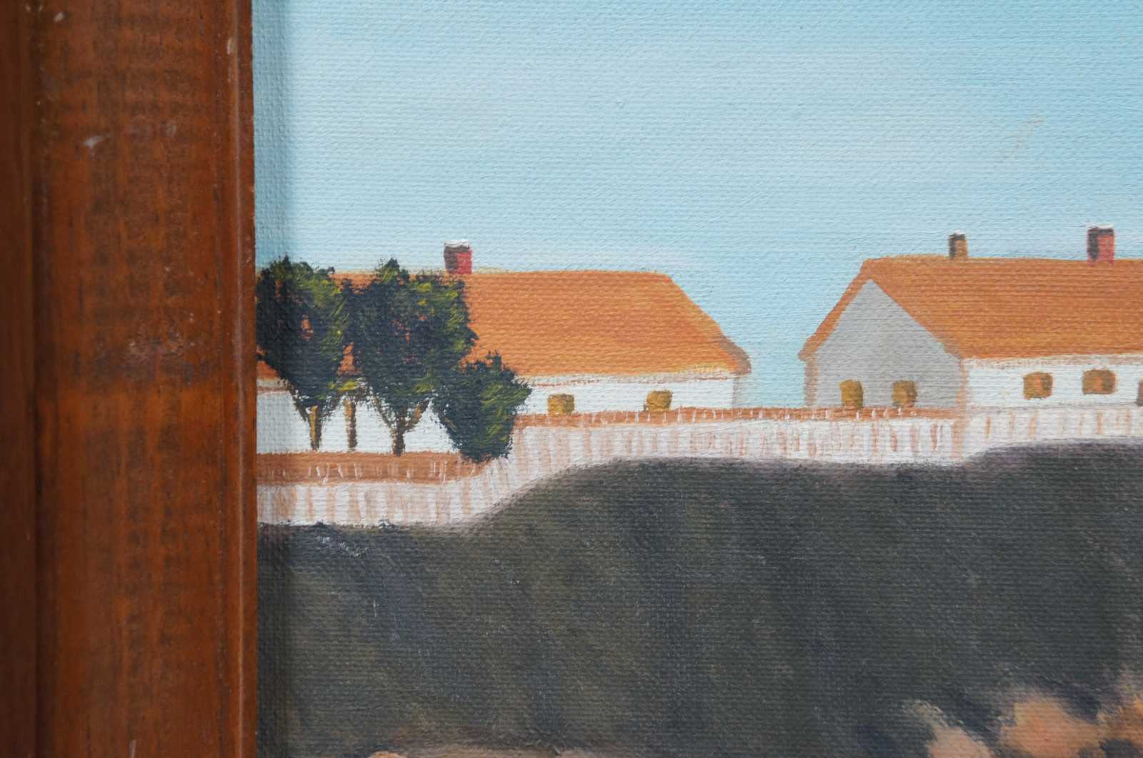 Vintage 1983 oil on canvas board coastal landscape painting of a lighthouse by Flo Evans.