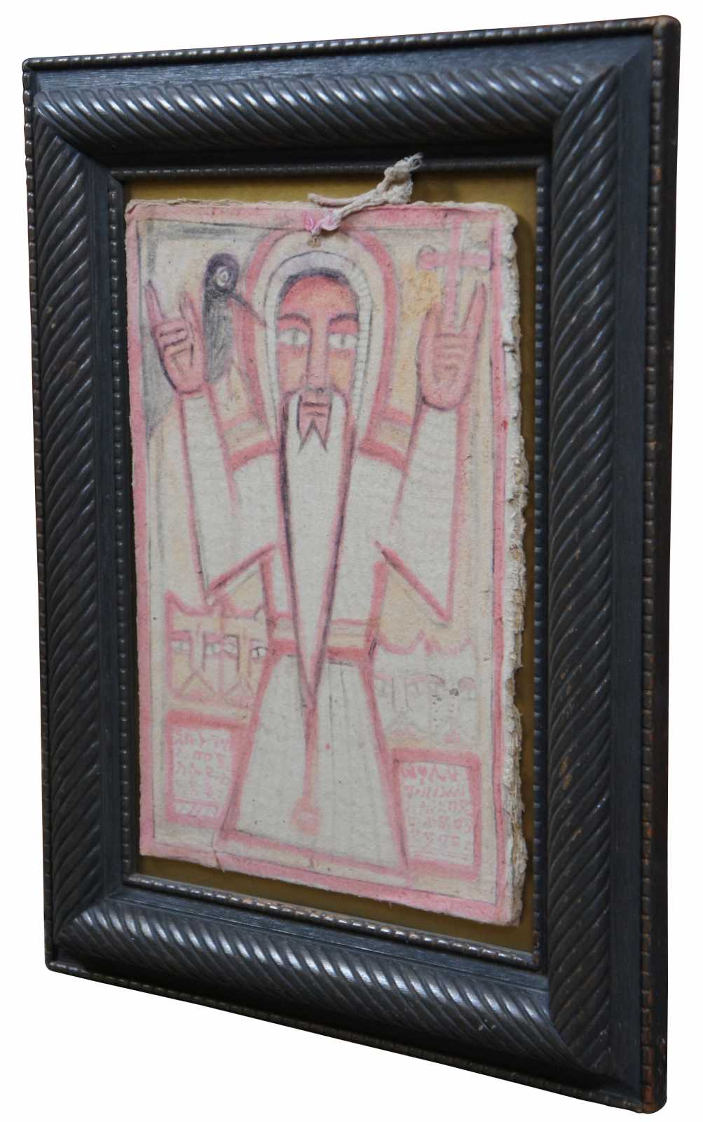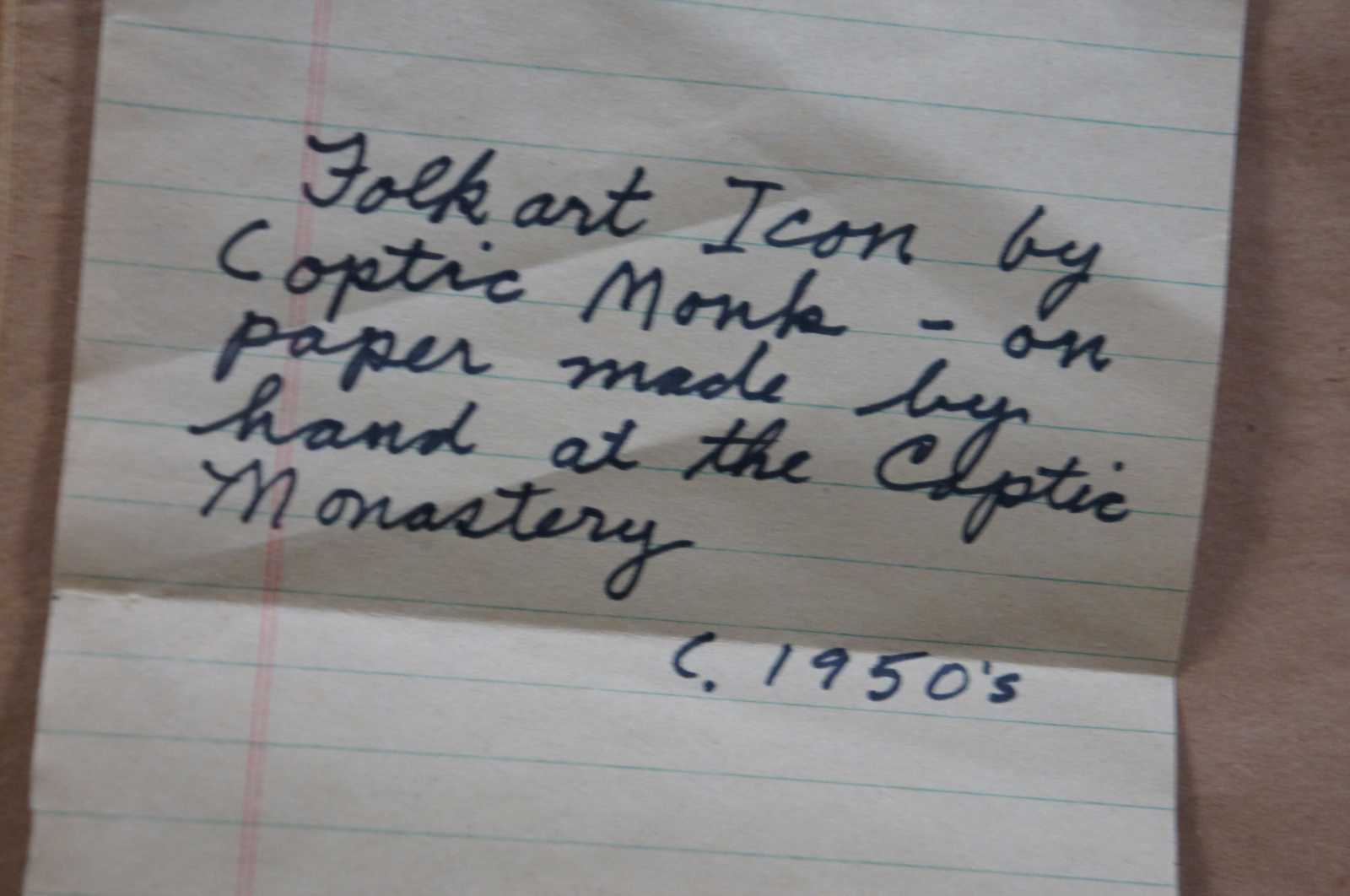 Vintage hand painted folk art icon of a saint painted by a Coptic monk in the 1950’s.