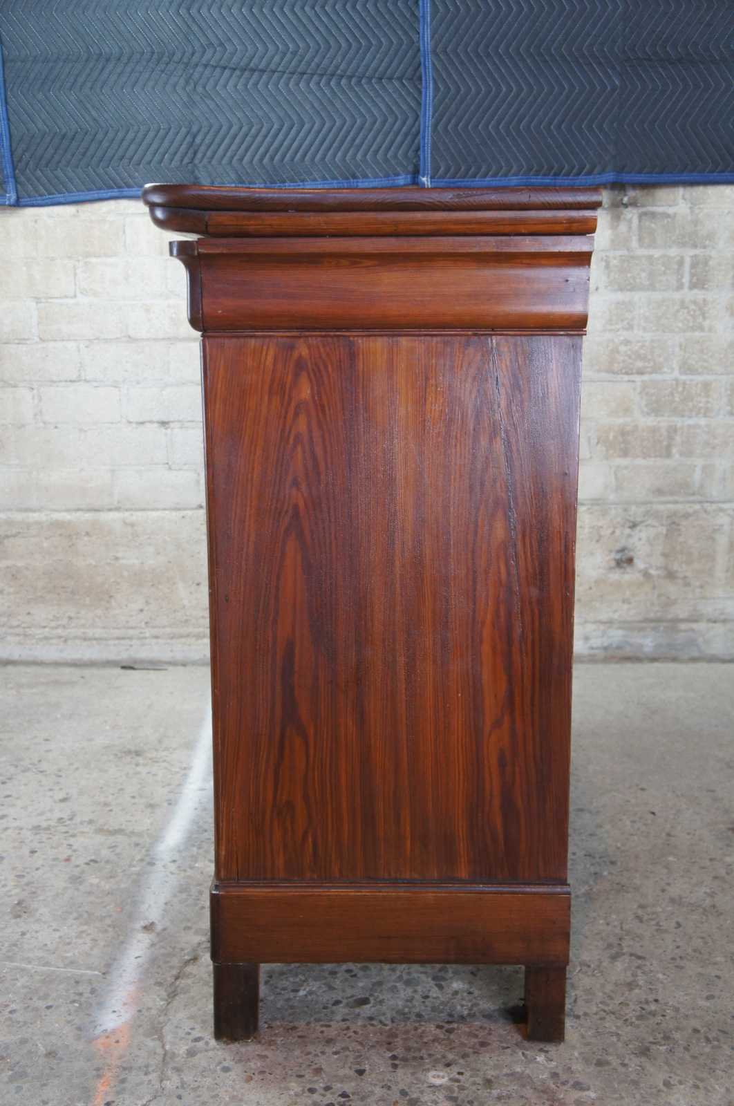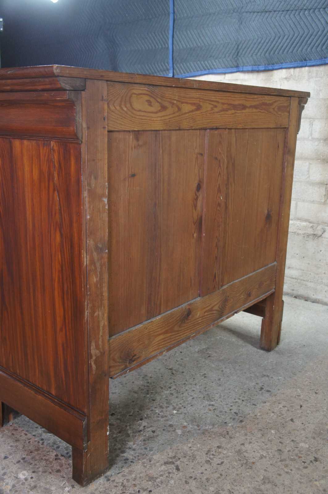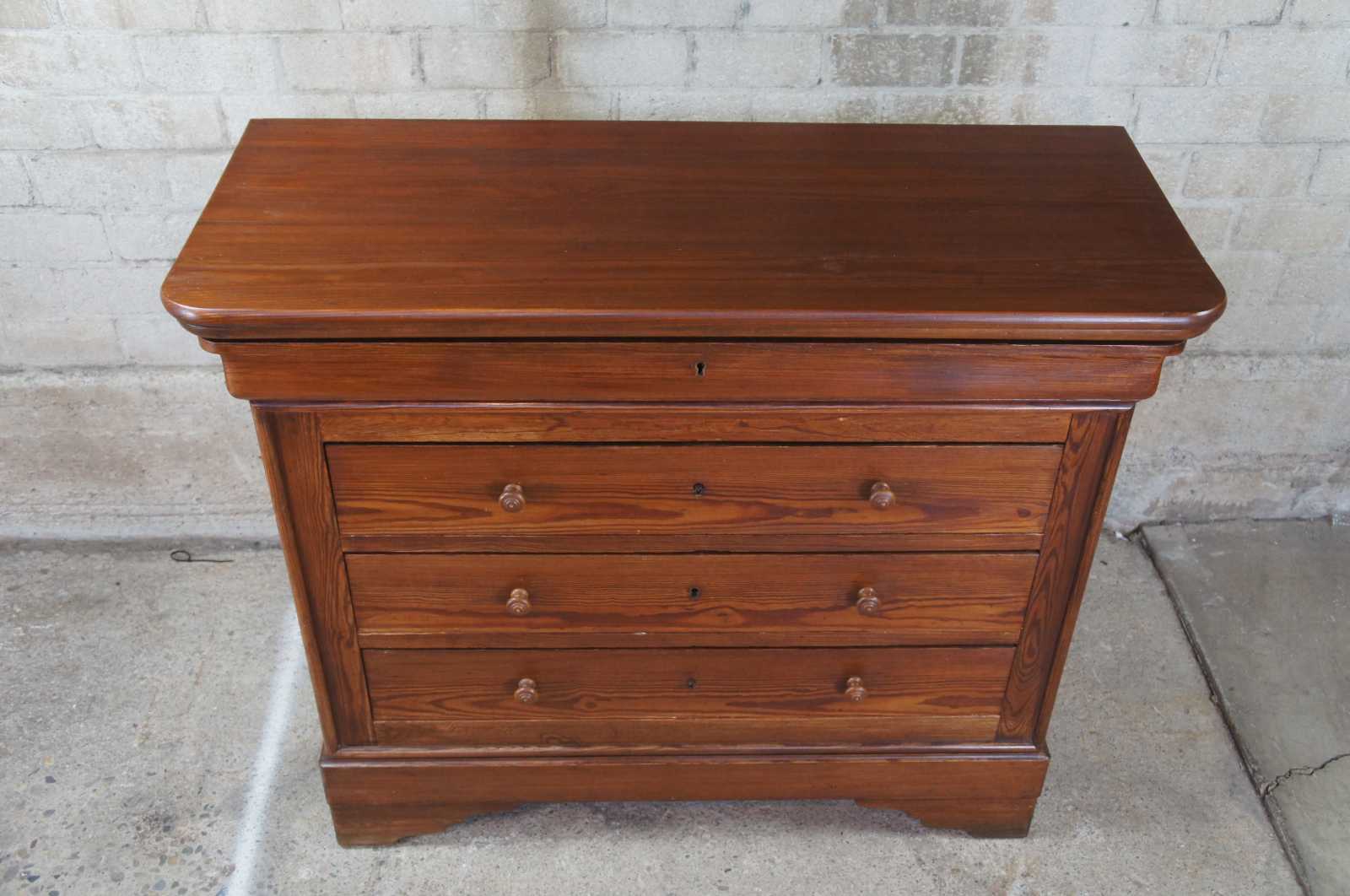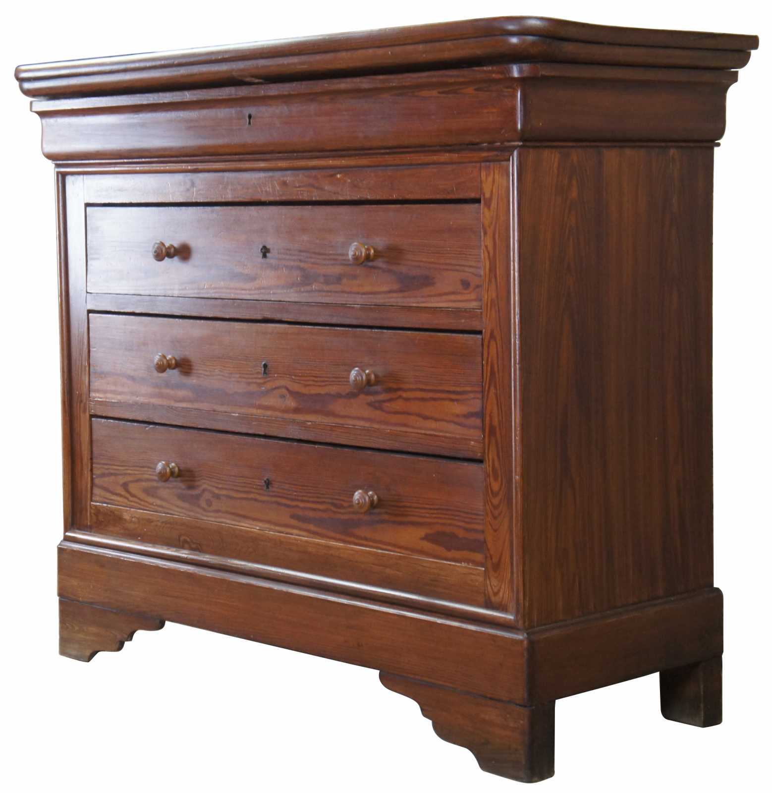 Late 19th century Louis Philippe Commode. A rectangular form crafted from pine with three drawers in addition to an upper cornice drawer.