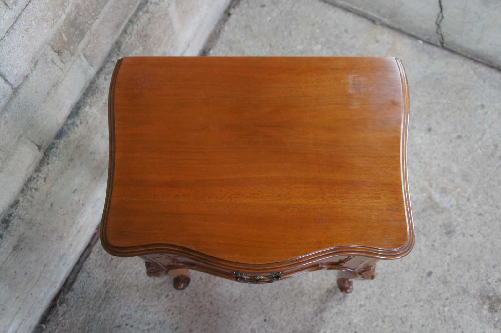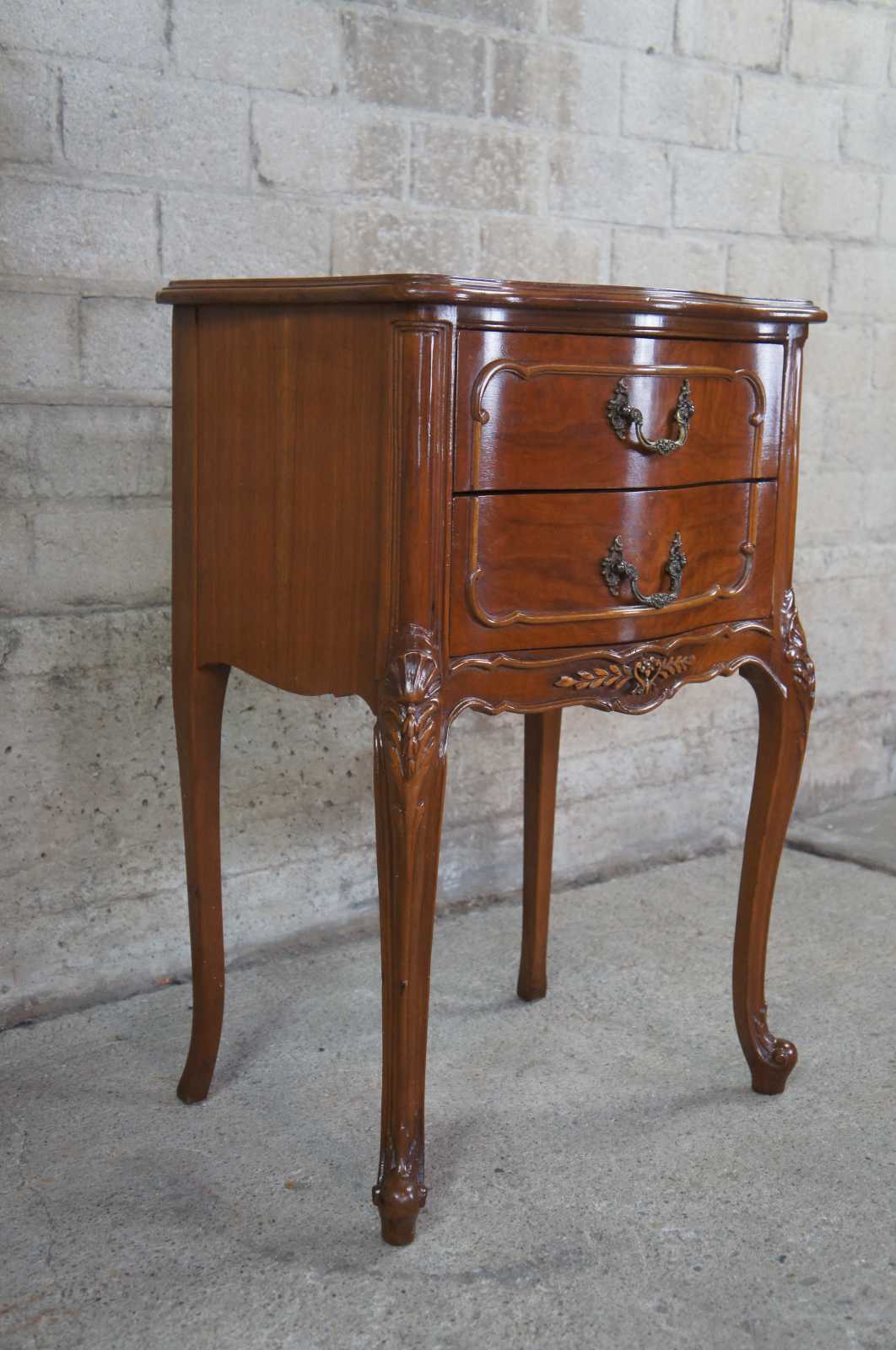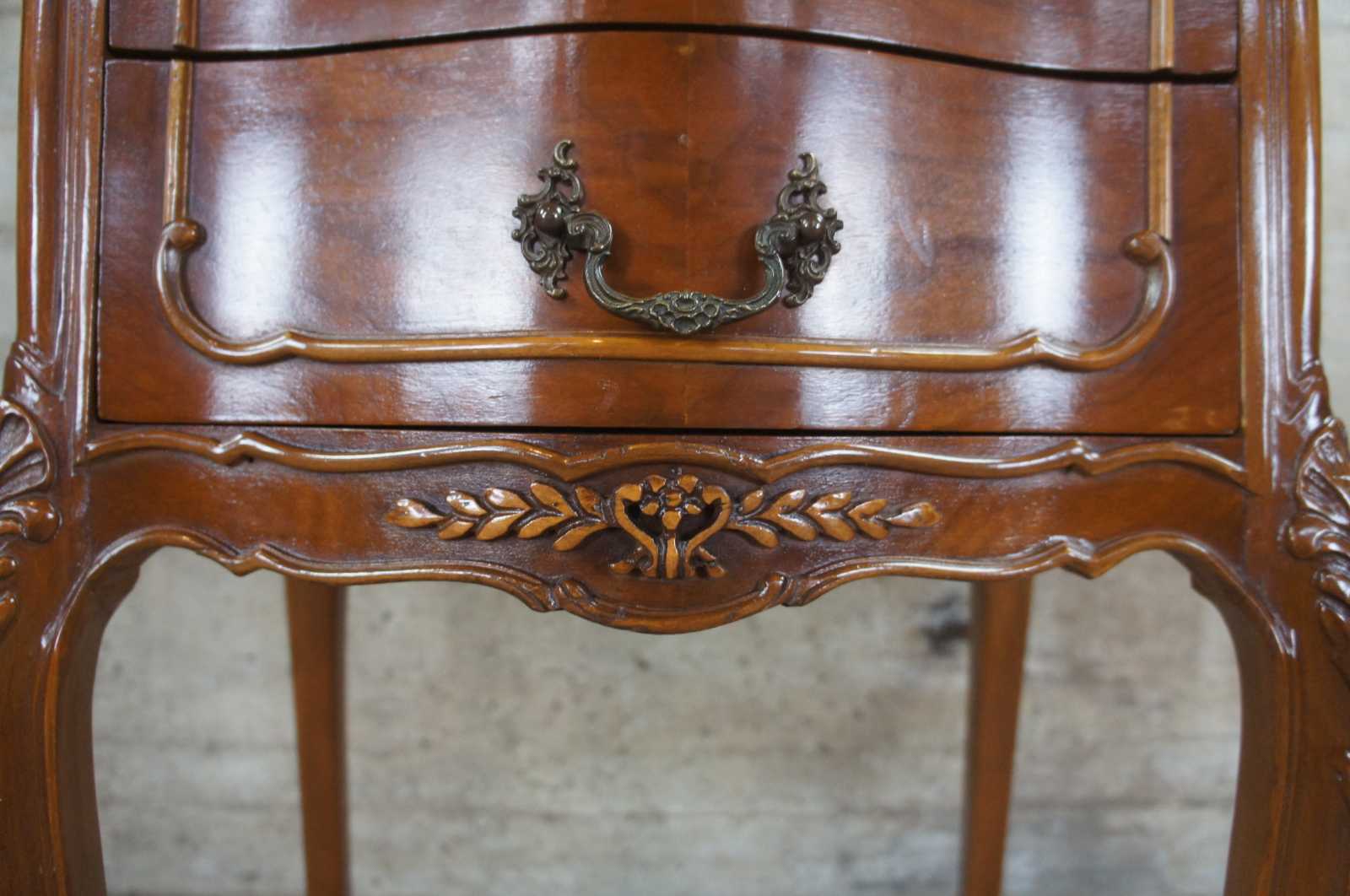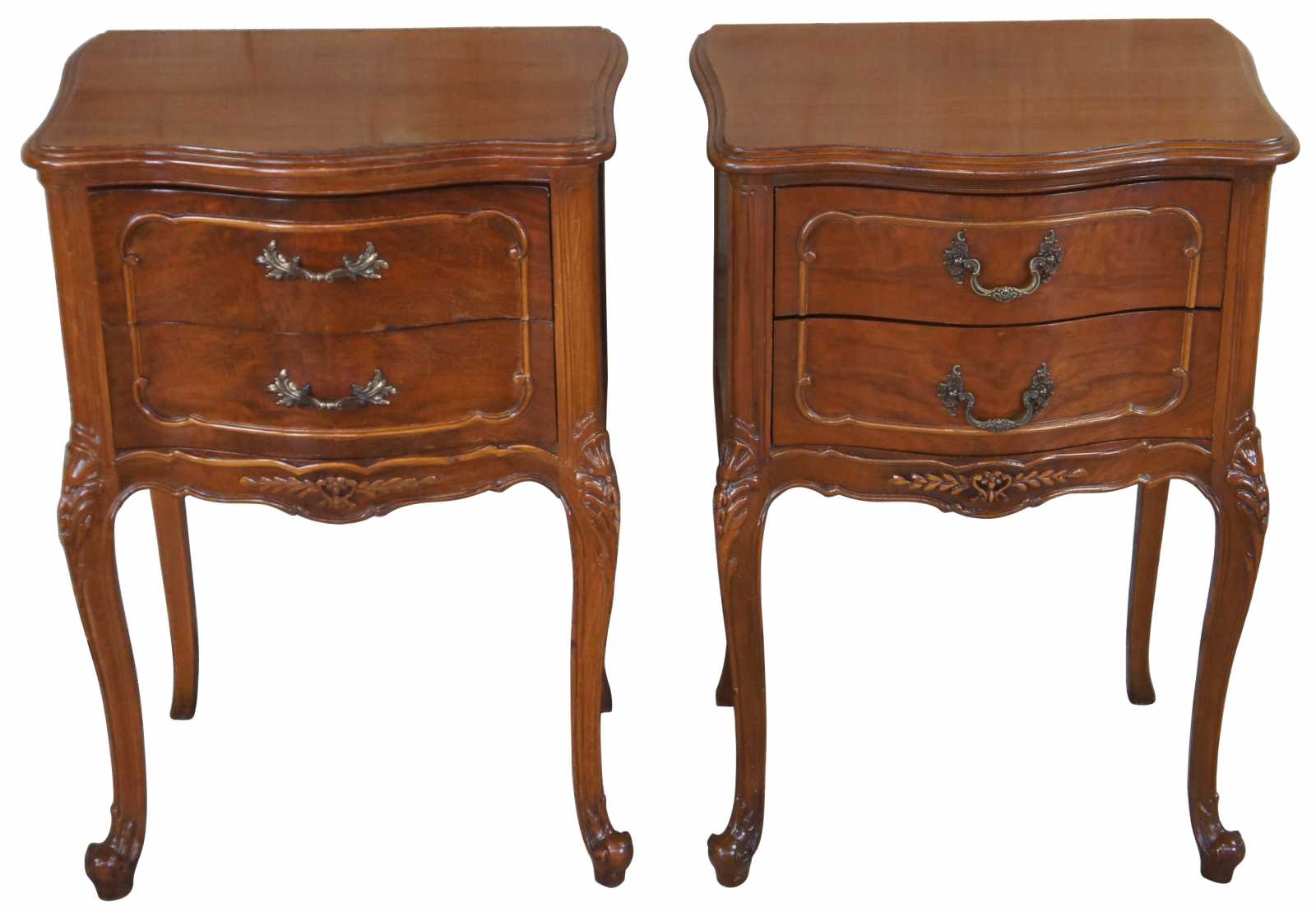 Circa 1940s French nightstands or end tables. Made from walnut with a serpentine front and crotch veneered drawers. Features carved accents, scalloped brass hardware, cabriole legs and glass tops.