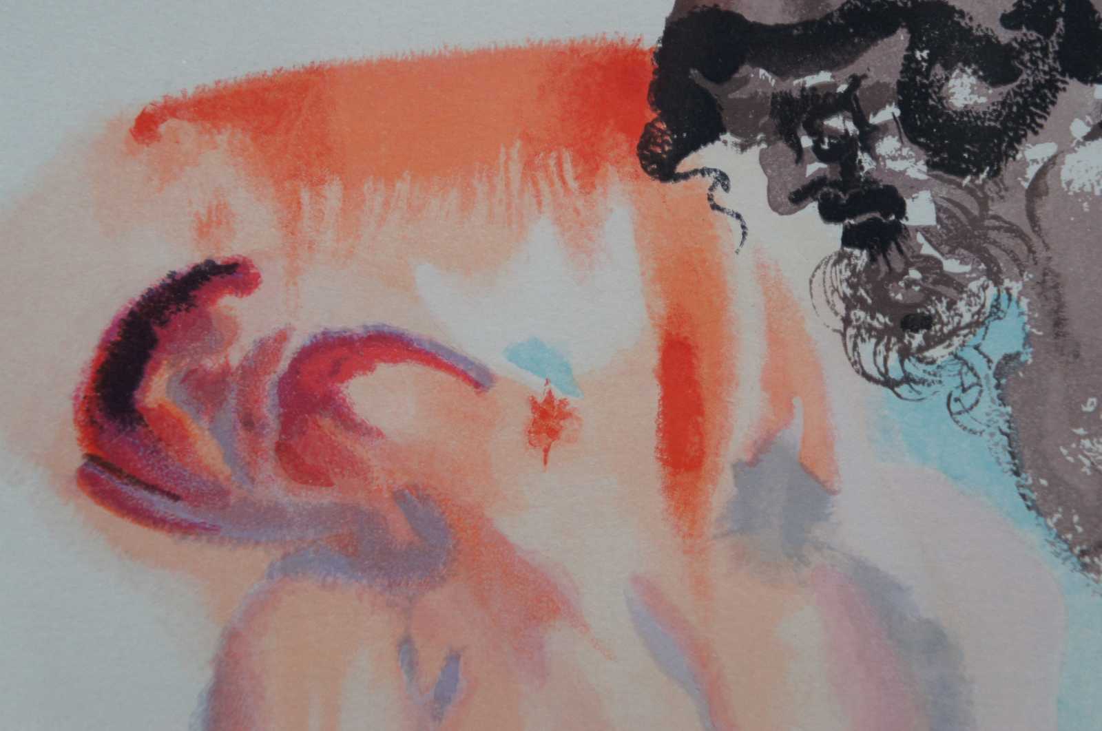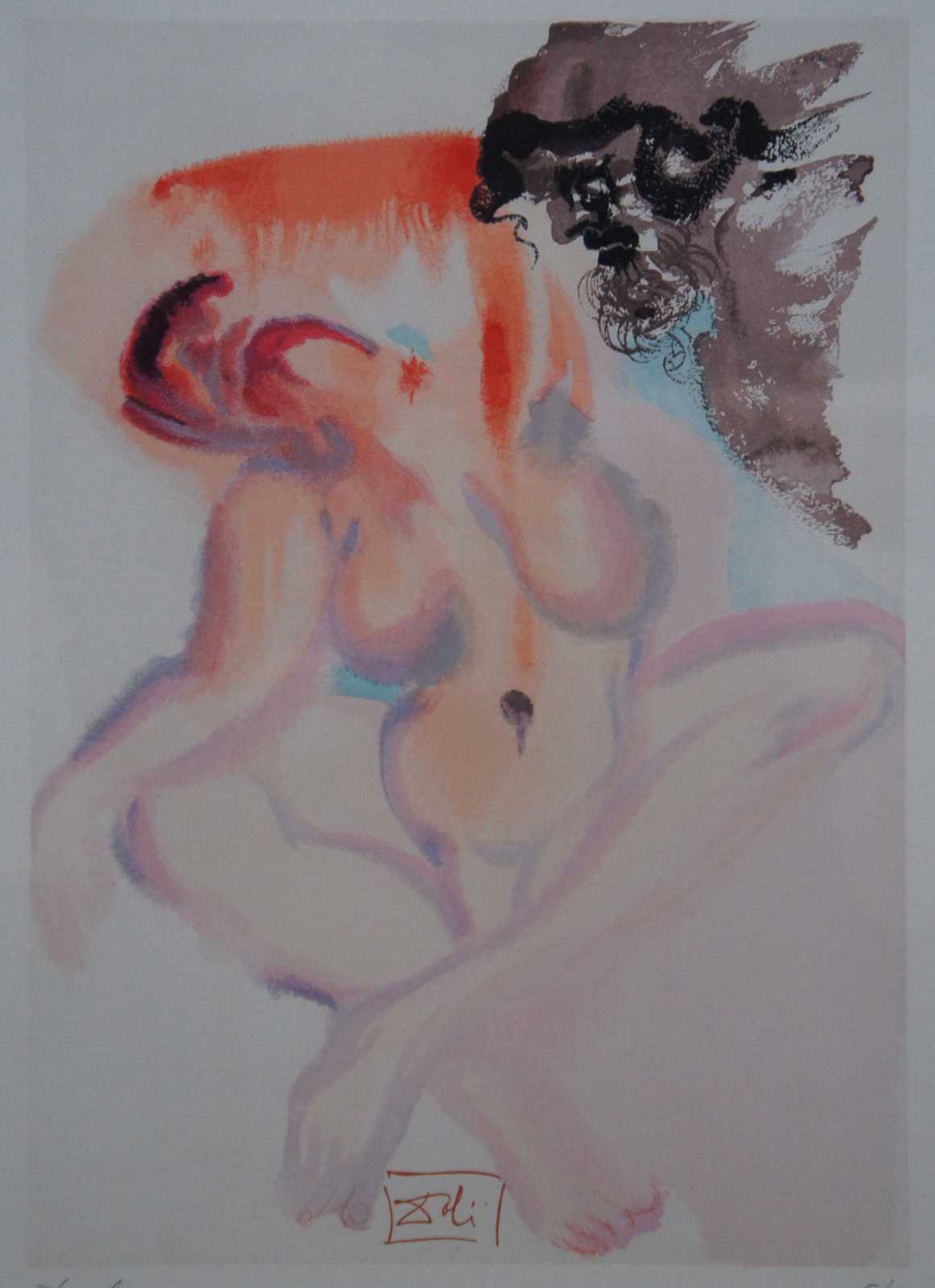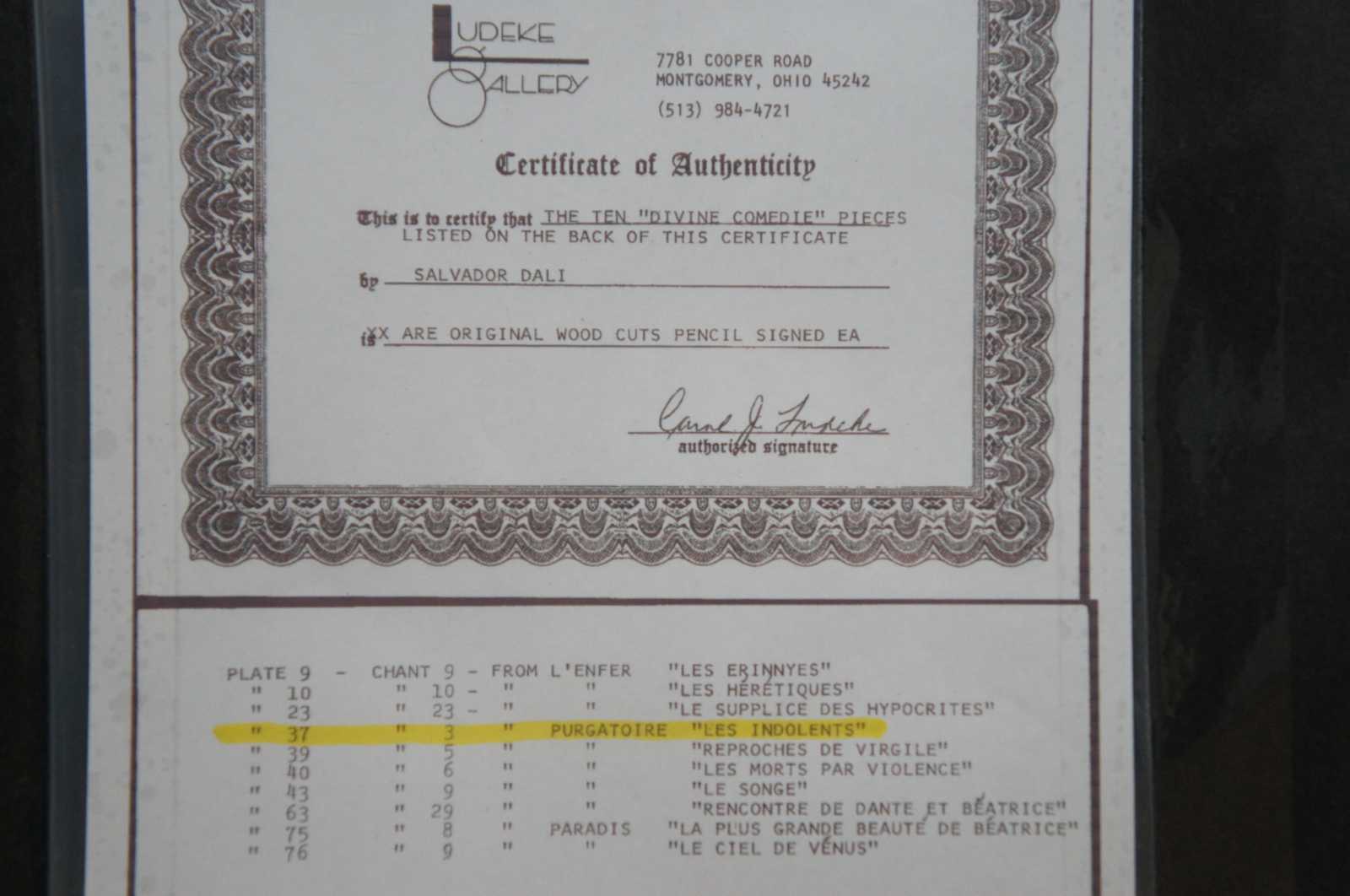 Framed original woodcut artist’s proof print on BFK Rives paper, pencil signed lower left by Salvador Dali – Plate 37 – Chant/Canto 3 – from Le Purgatoire (Purgatory) – “Les Indolents” (The Indolents) from the “Divine Comedie” series. Original certificate of authenticity covered 10 separate prints – photocopy included.