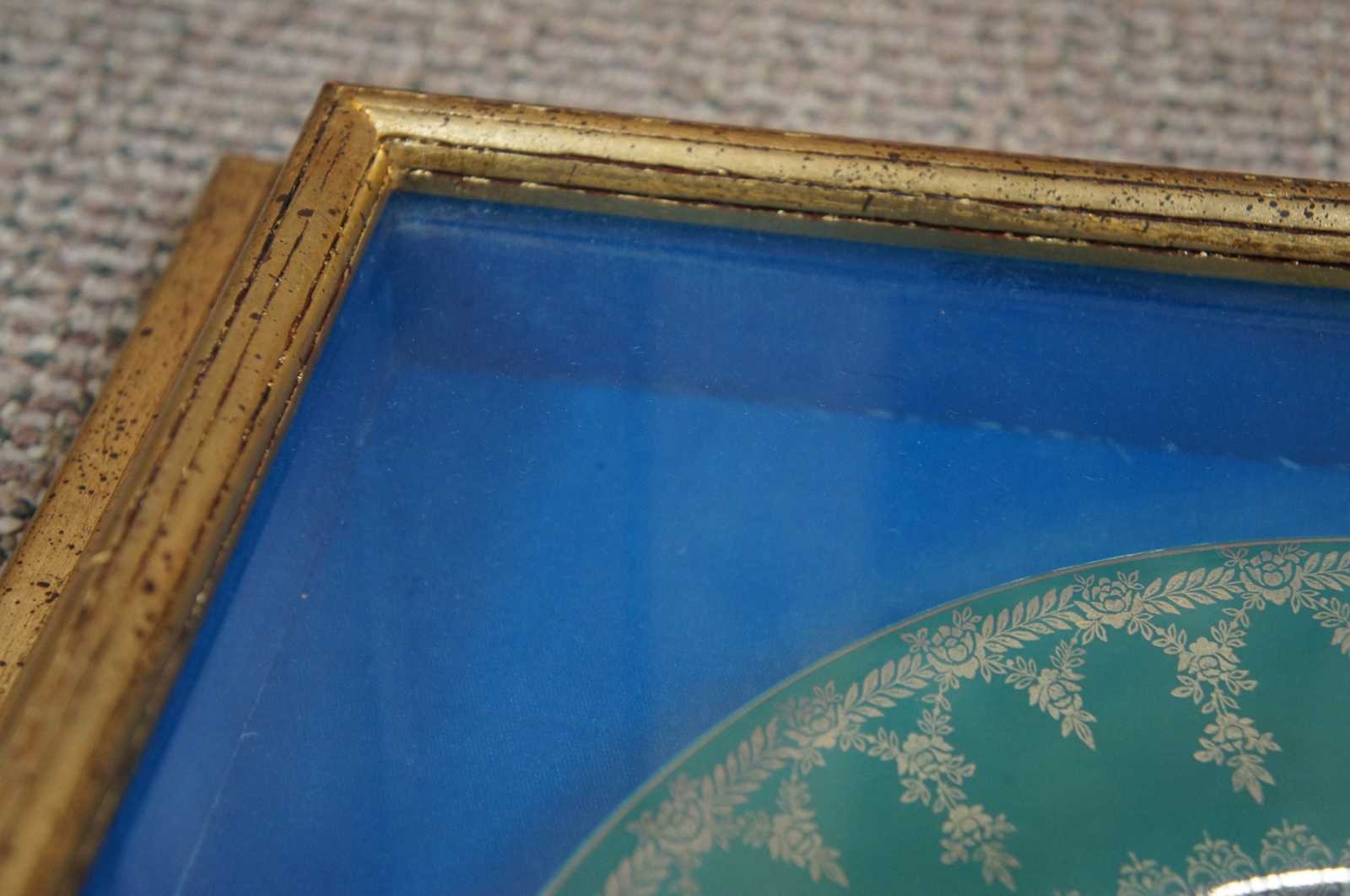 Framed antique 19th century Royal Vienna style plate by Hutschenreuther with beehive mark, in green and gold with a central reproduction of Elisabeth Vigee Le Brun’s 1789 Self Portrait with Her Daughter Julie.