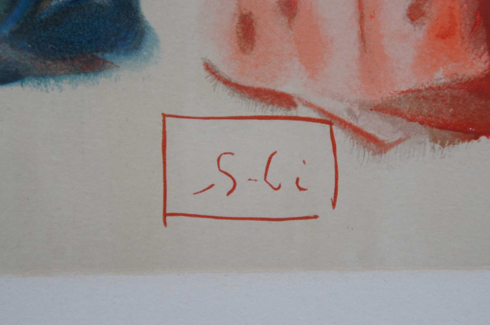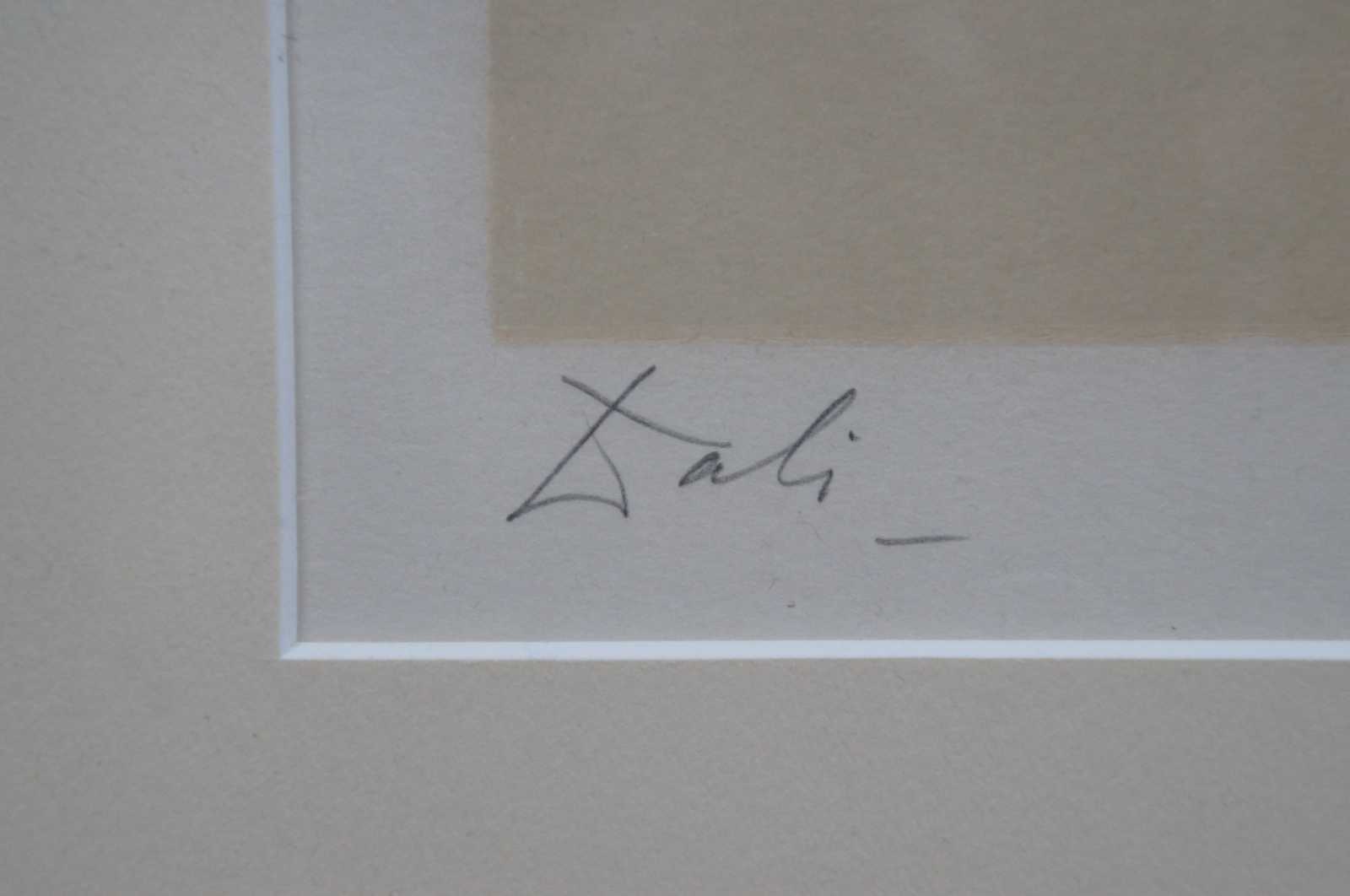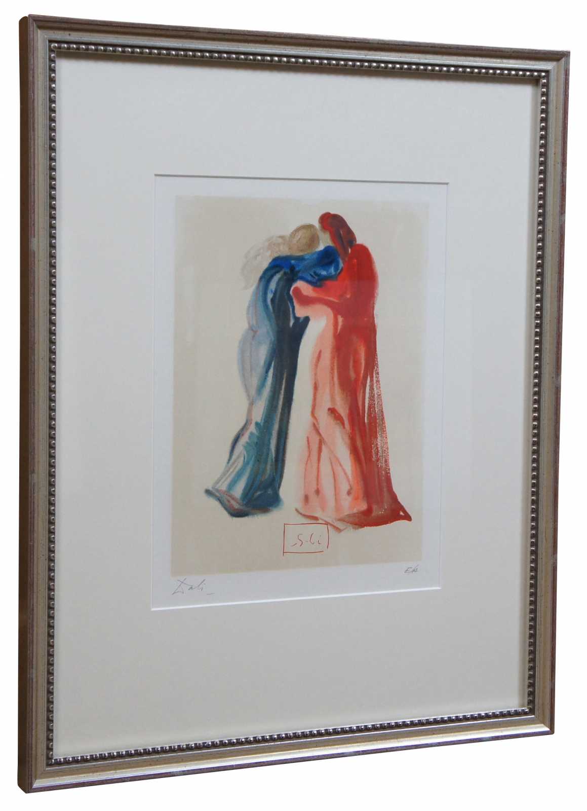 Framed original woodcut artist’s proof print on BFK Rives paper, pencil signed lower left by Salvador Dali – Plate 63 – Chant/Canto 29 – from Le Purgatoire (Purgatory) – “Rencontre de Dante et Beatrice” (Meeting of Dante and Beatrice) from the “Divine Comedie” series. Original certificate of authenticity covered 10 separate prints – photocopy included.