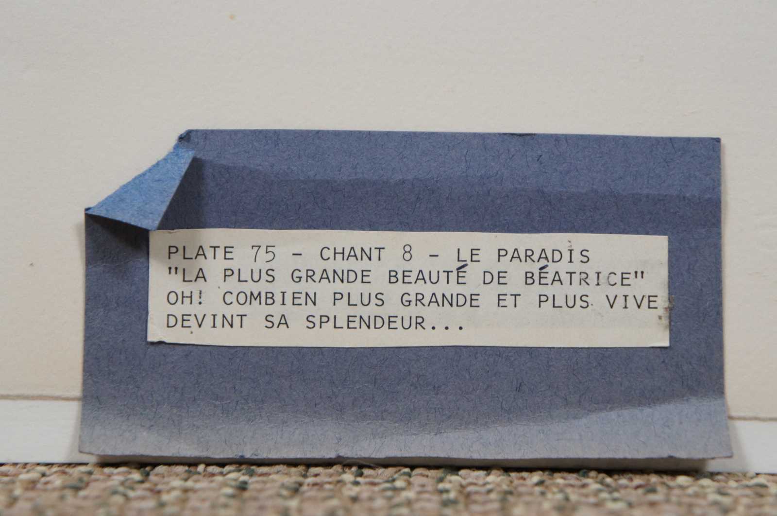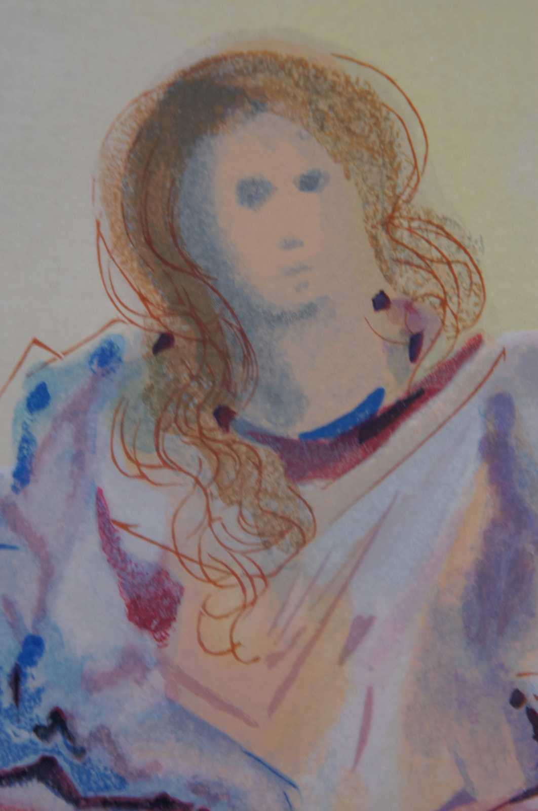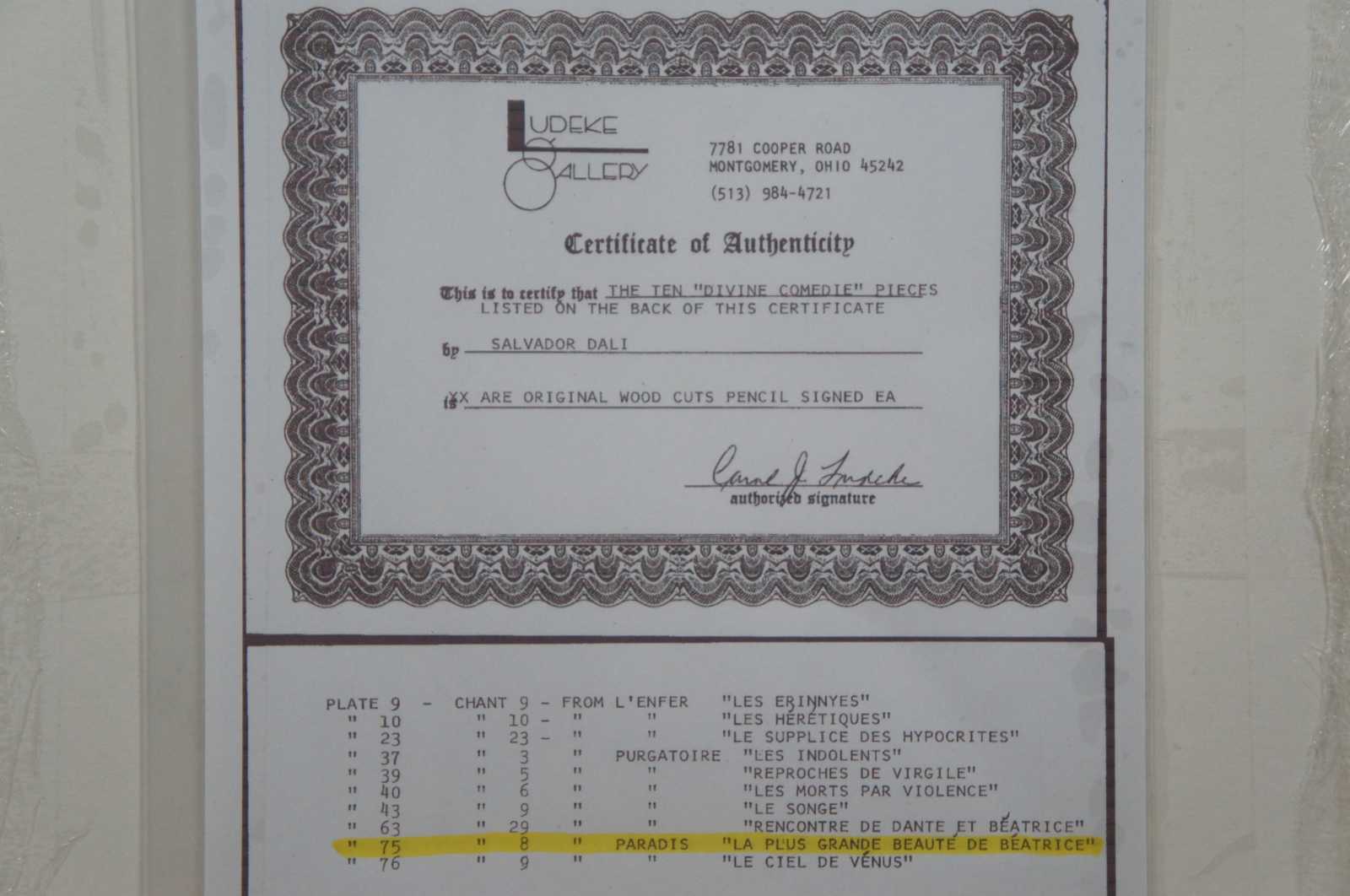 Original woodcut artist’s proof print, pencil signed by Salvador Dali – Plate 75 – Chant/Canto 8 – from Le Paradis (Paradise) – “La Plus Grande Beaute de Beatrice” (The Greatest Beauty of Beatrice) from the “Divine Comedie” series. Original certificate of authenticity covered 10 separate prints – photocopy included.