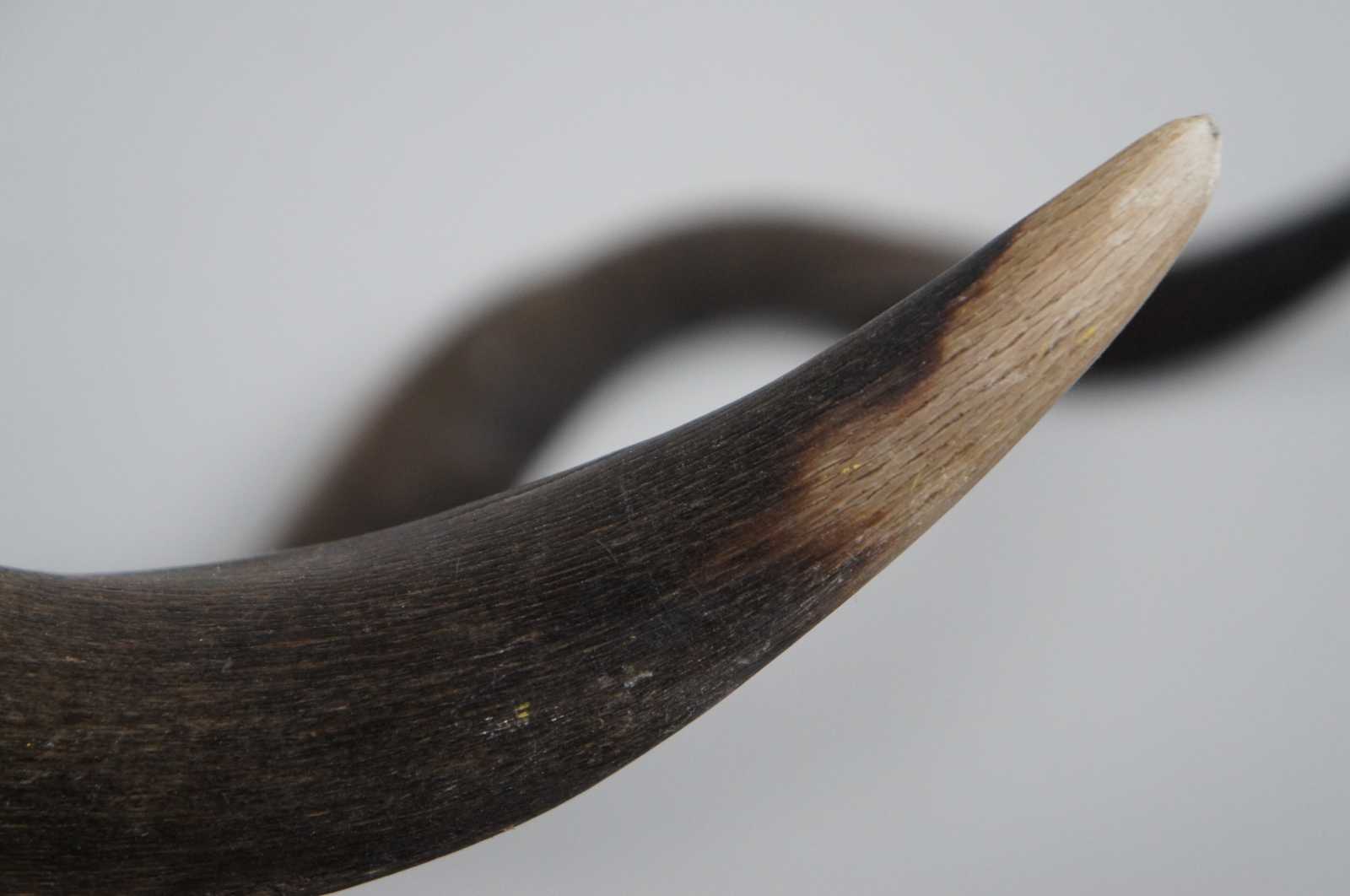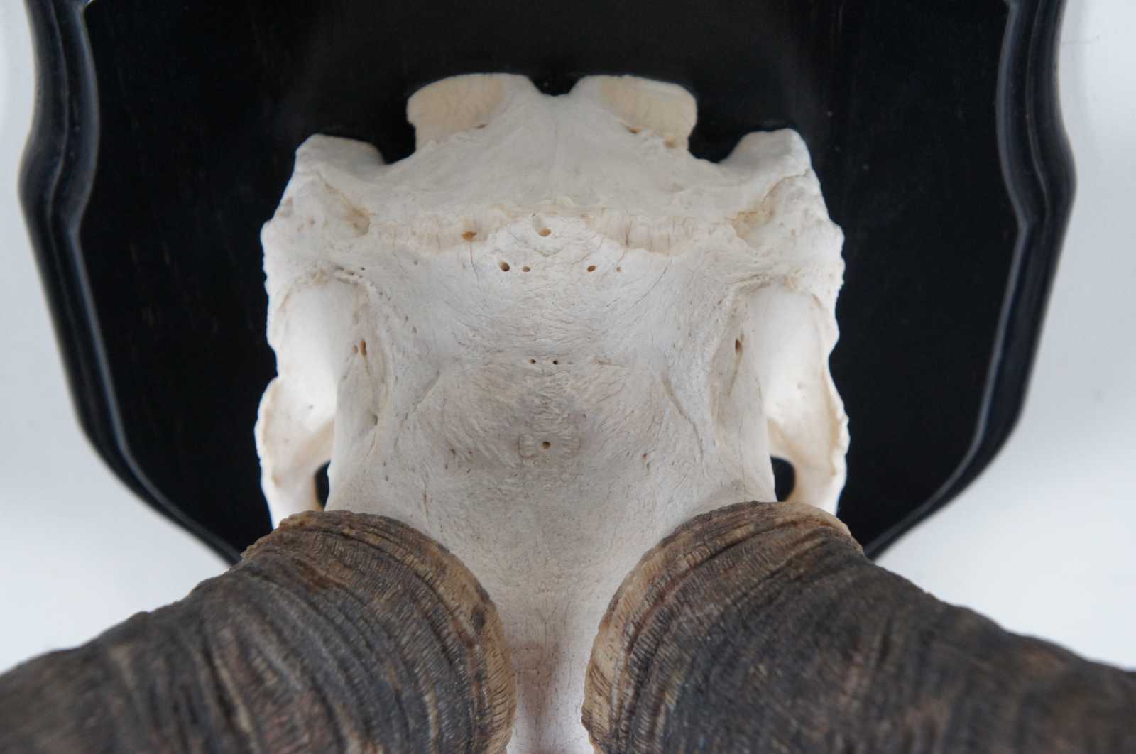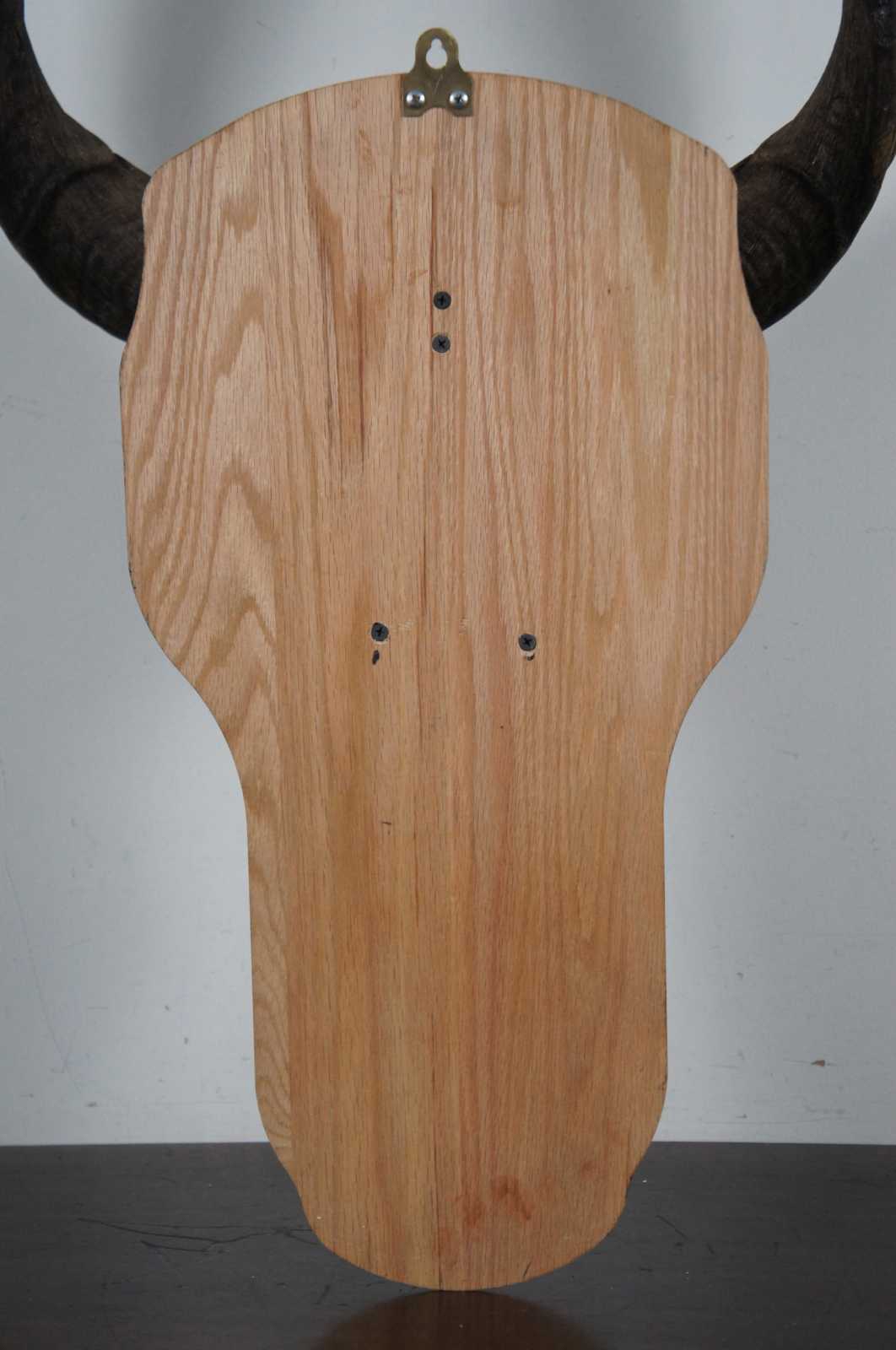 Natural kudu skull with horns mounted on a black wood plaque.