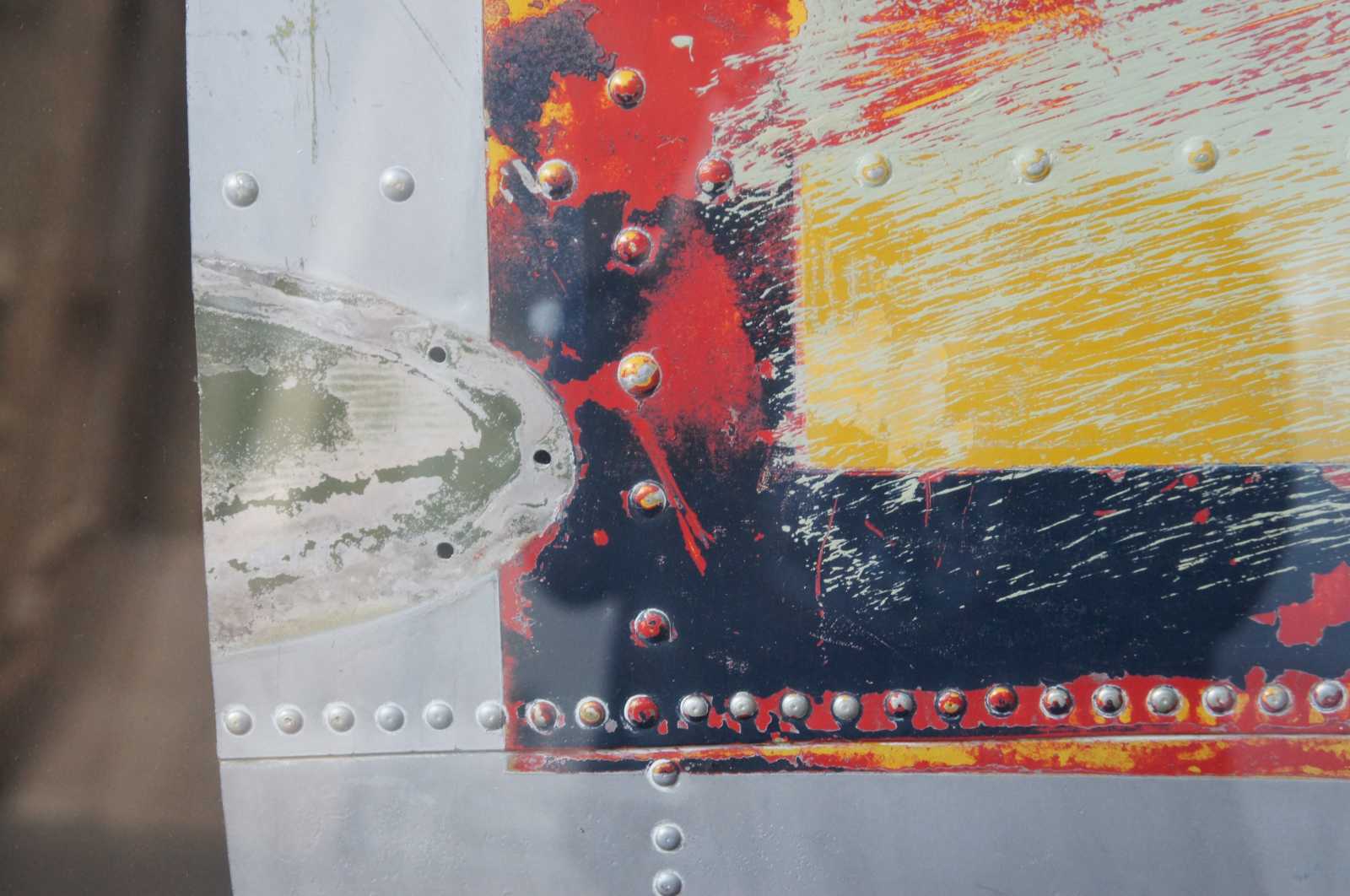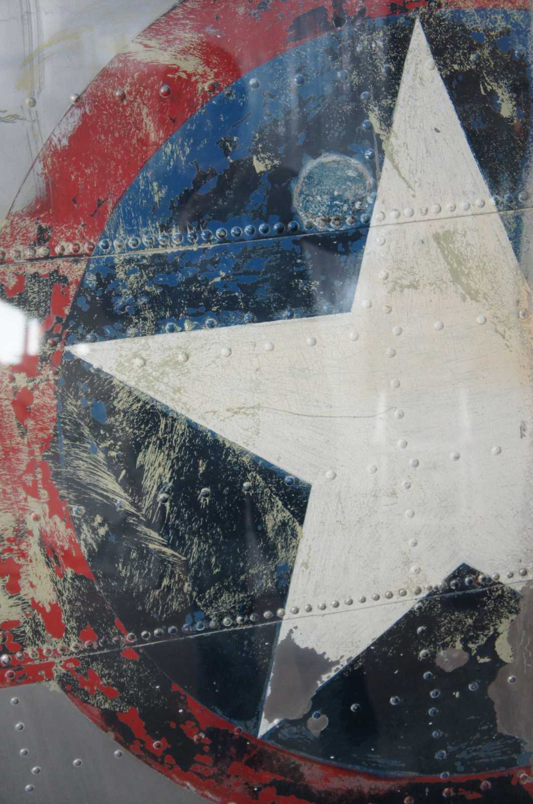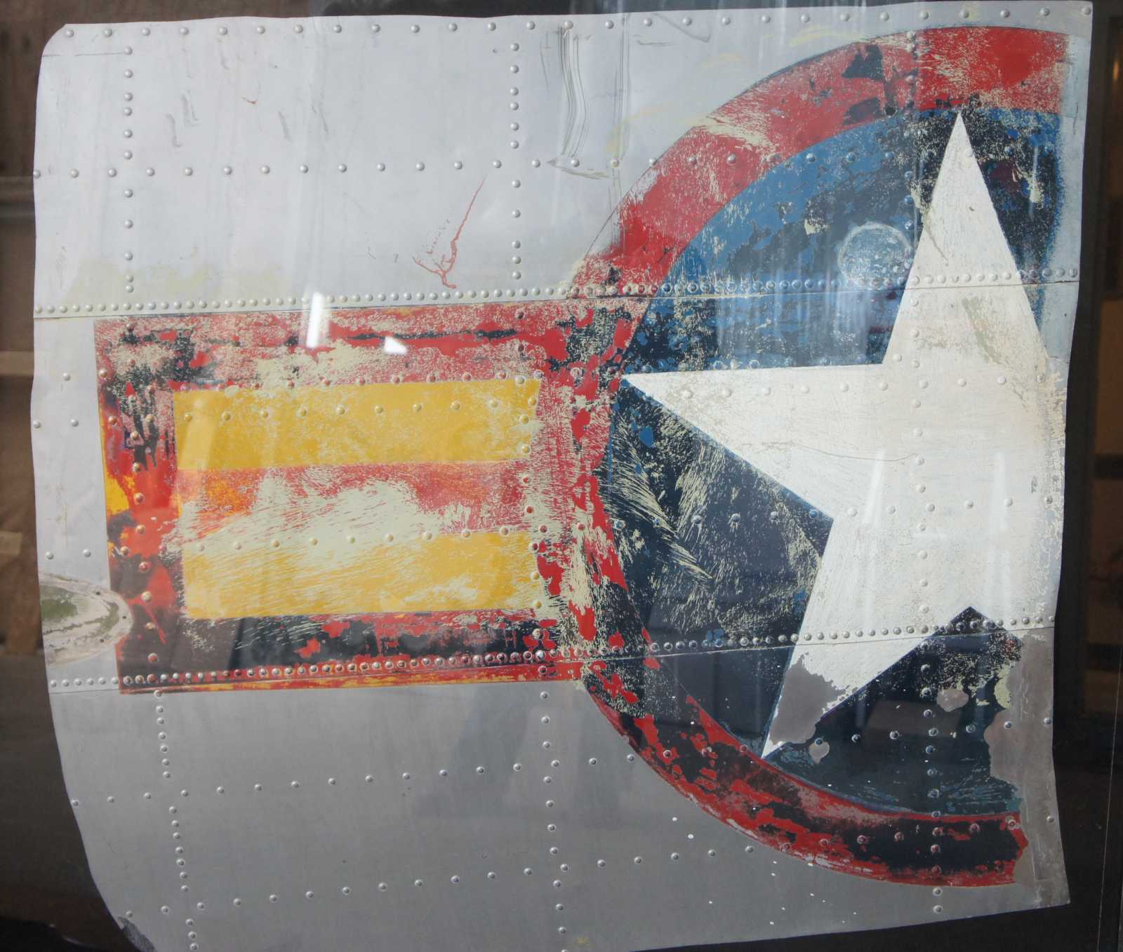 Antique World War II era United States Army Air Force airplane fuselage segment, mounted in a shadowbox frame and featuring the stars and bars decal insignia.
