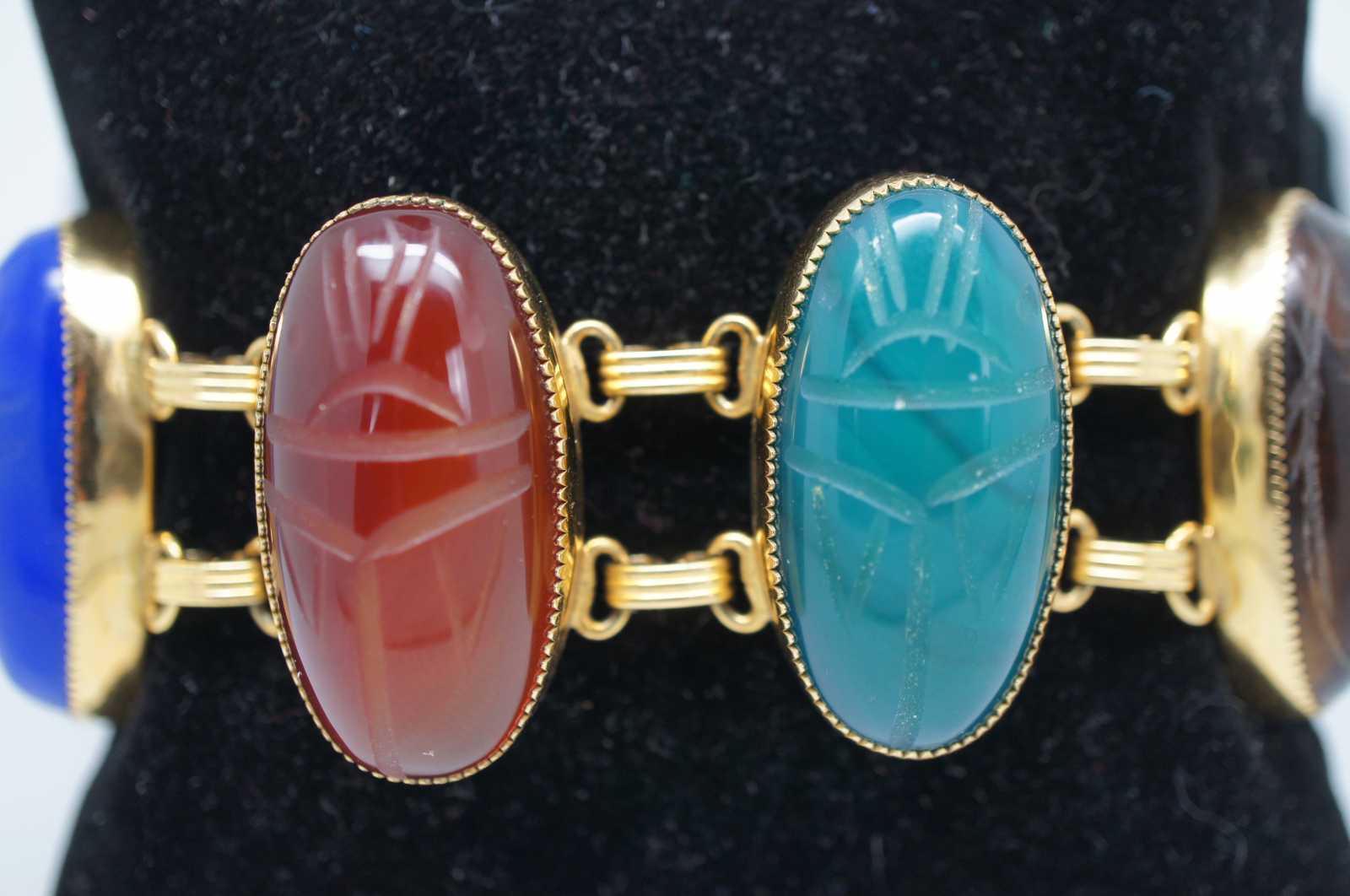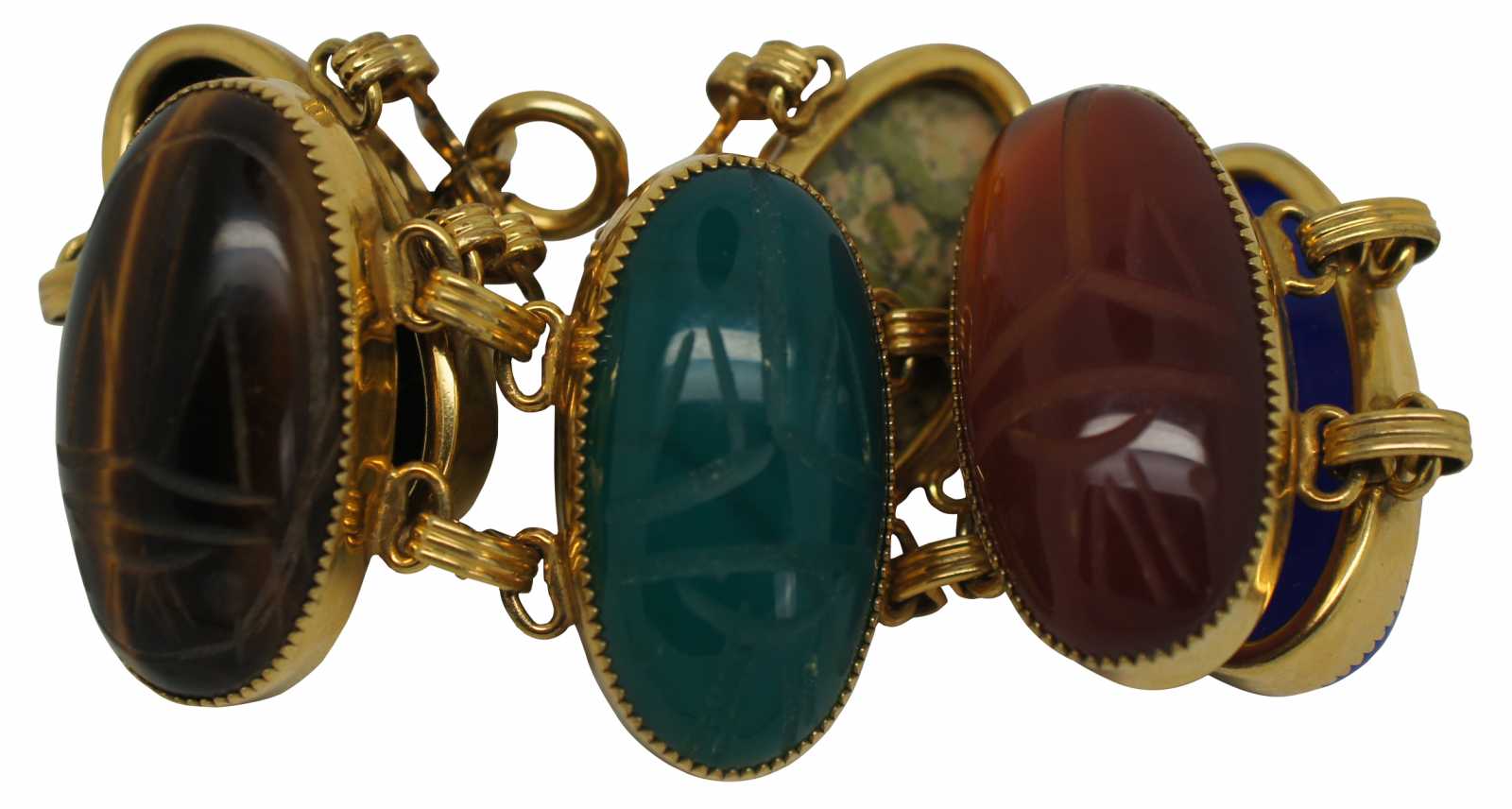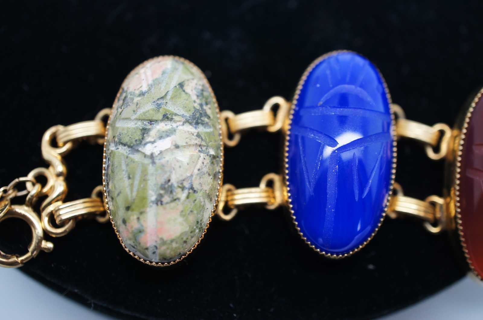 Vintage carved gemstone scarab beetle bracelet with 1/20-12K gold filled chain. Features lapis, bloodstone, chatoyance (tigers eye) , onyx, carnelion and jadeite.