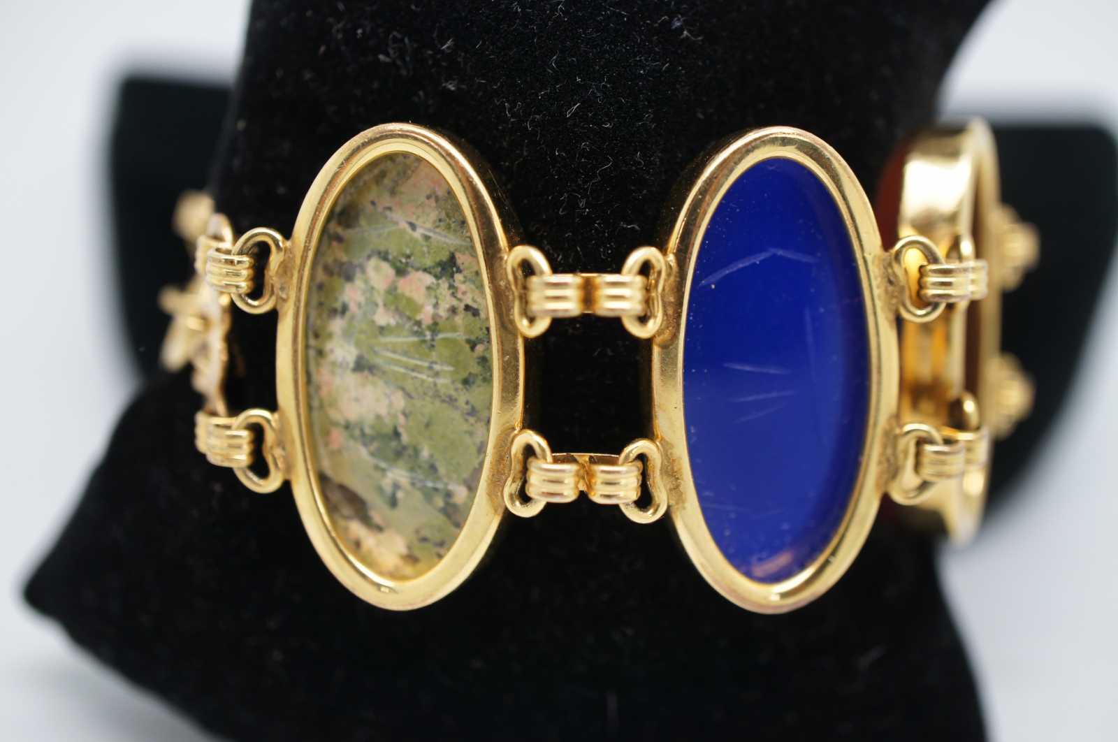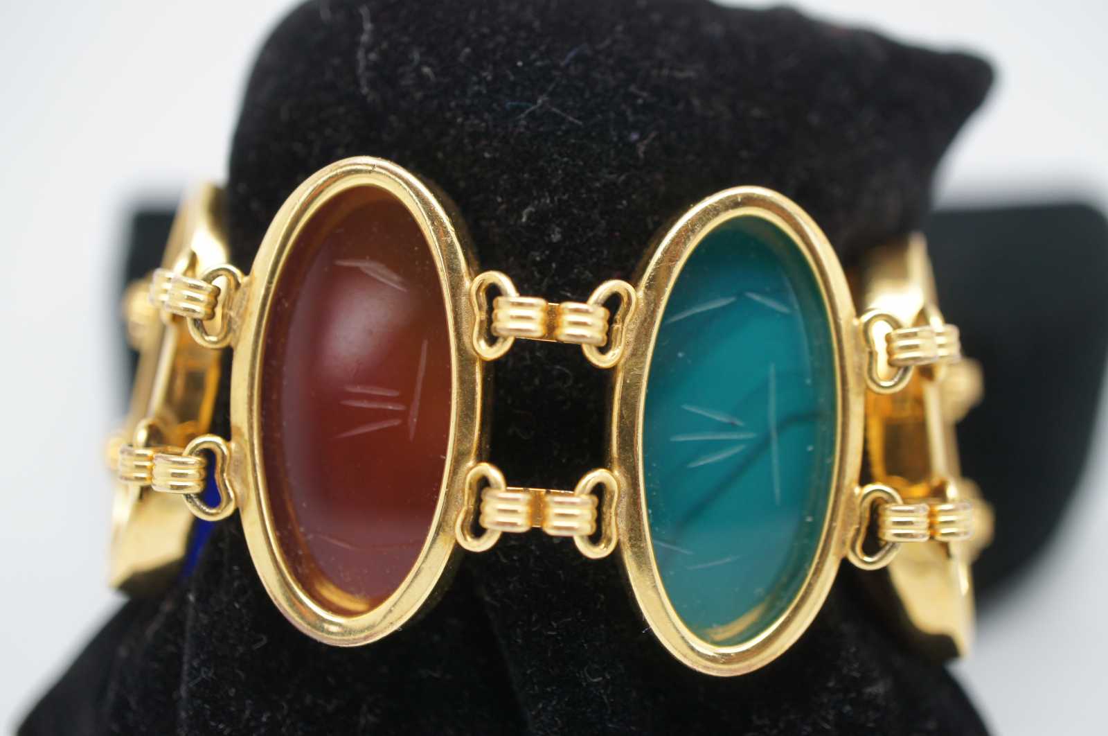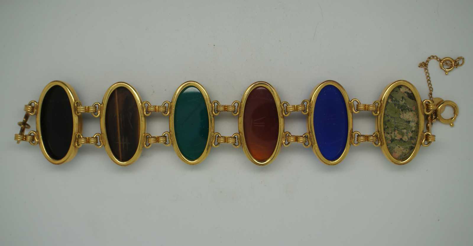 Vintage carved gemstone scarab beetle bracelet with 1/20-12K gold filled chain. Features lapis, bloodstone, chatoyance (tigers eye) , onyx, carnelion and jadeite.