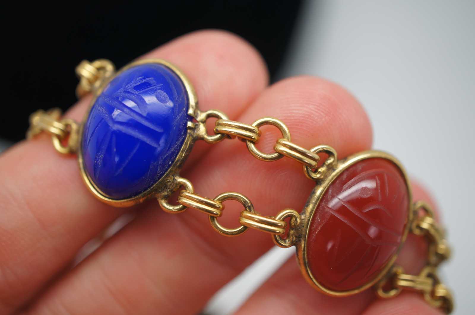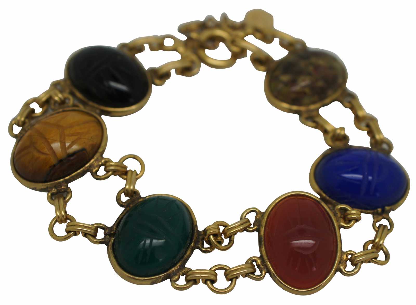 Vintage carved gemstone scarab beetle bracelet with 1/20-12K gold filled chain. Features lapis, bloodstone, chatoyance (tigers eye) , onyx, carnelion and jadeite.