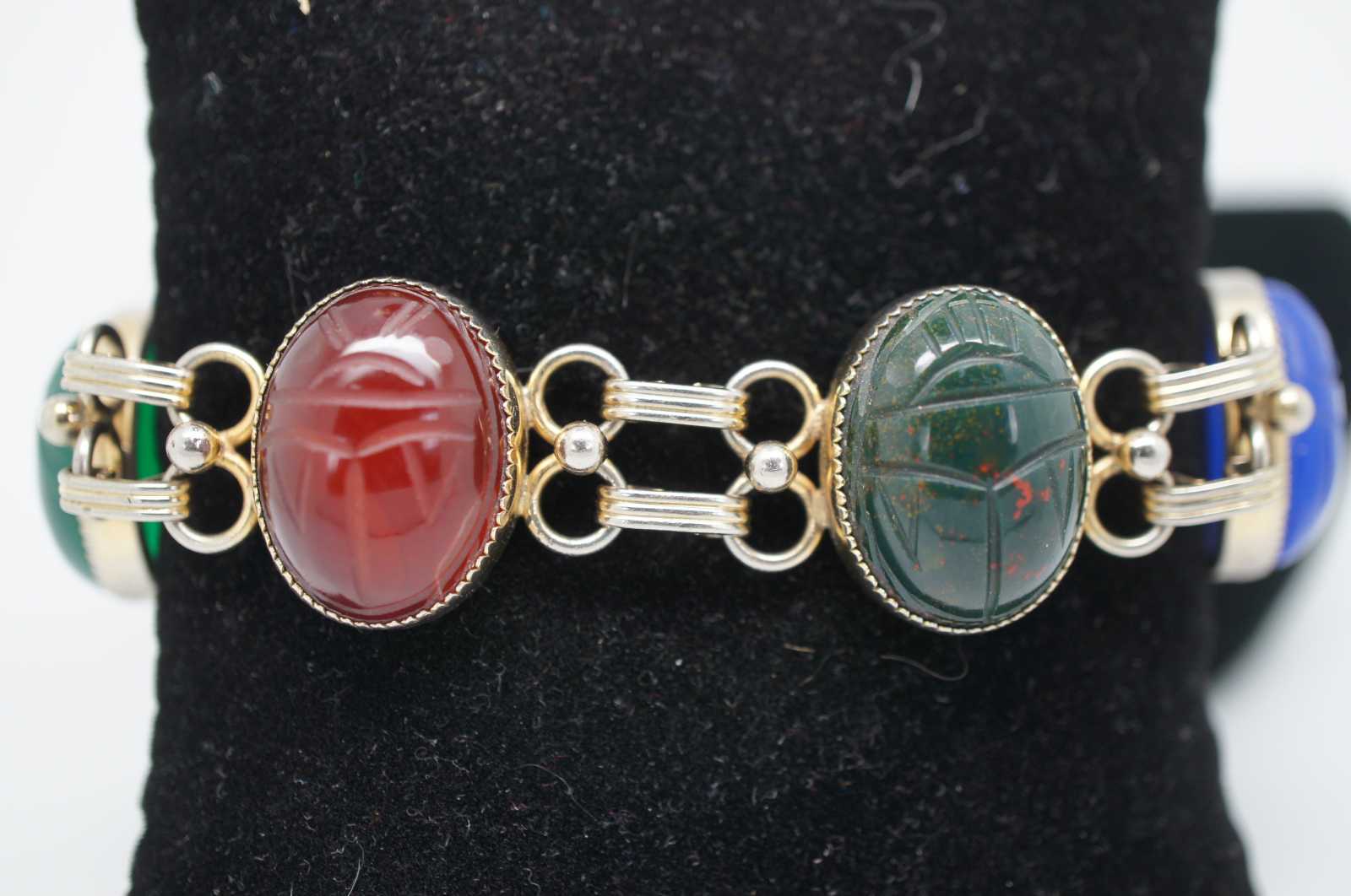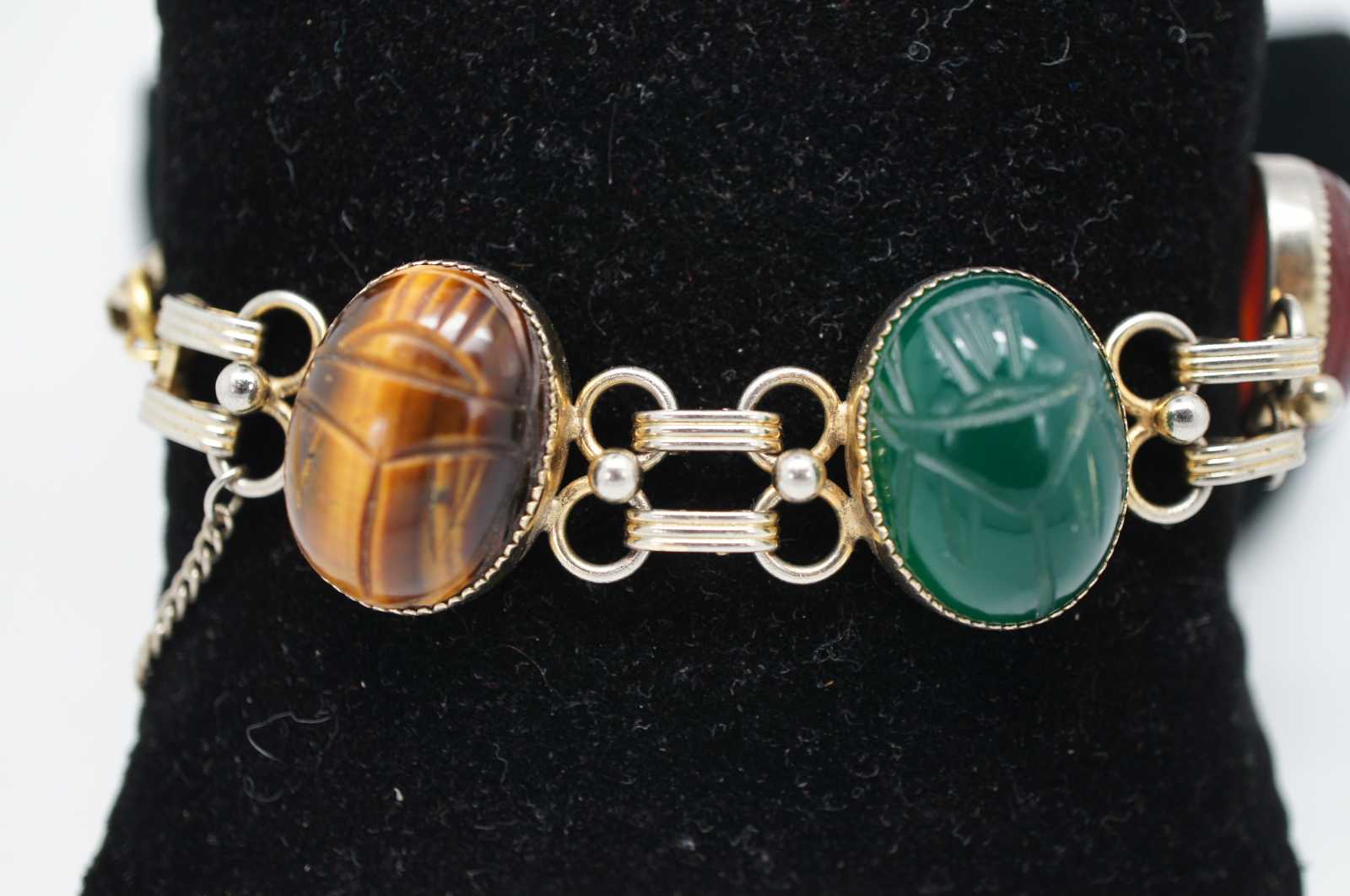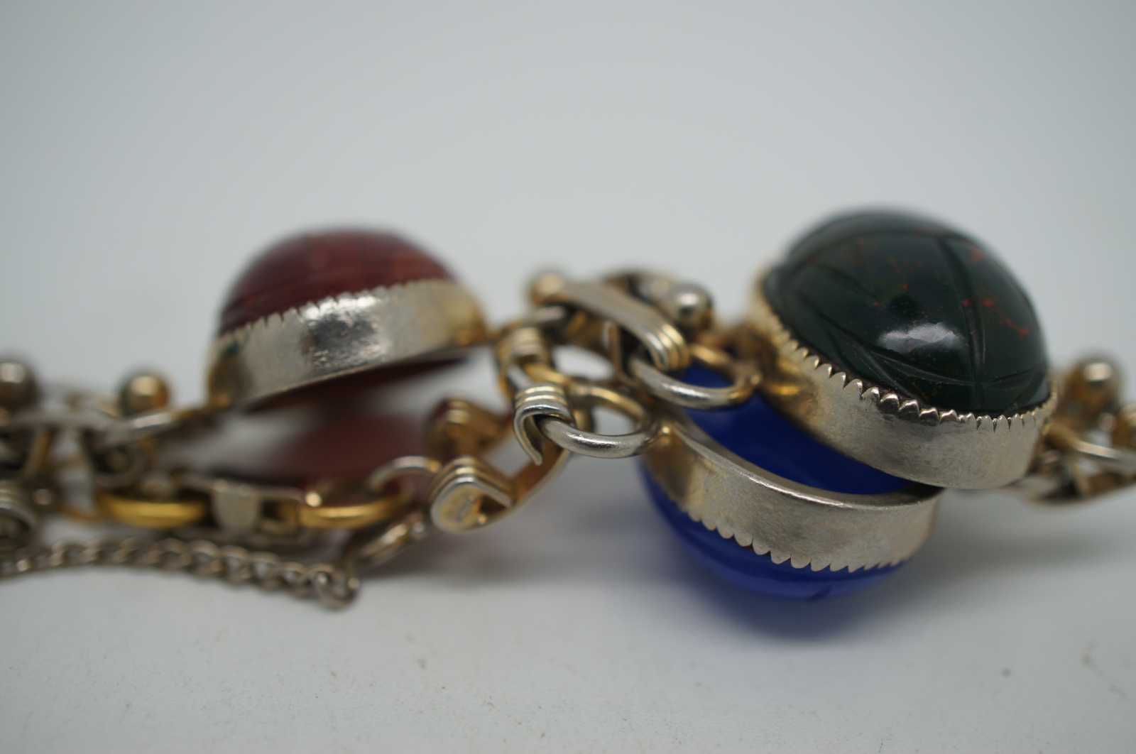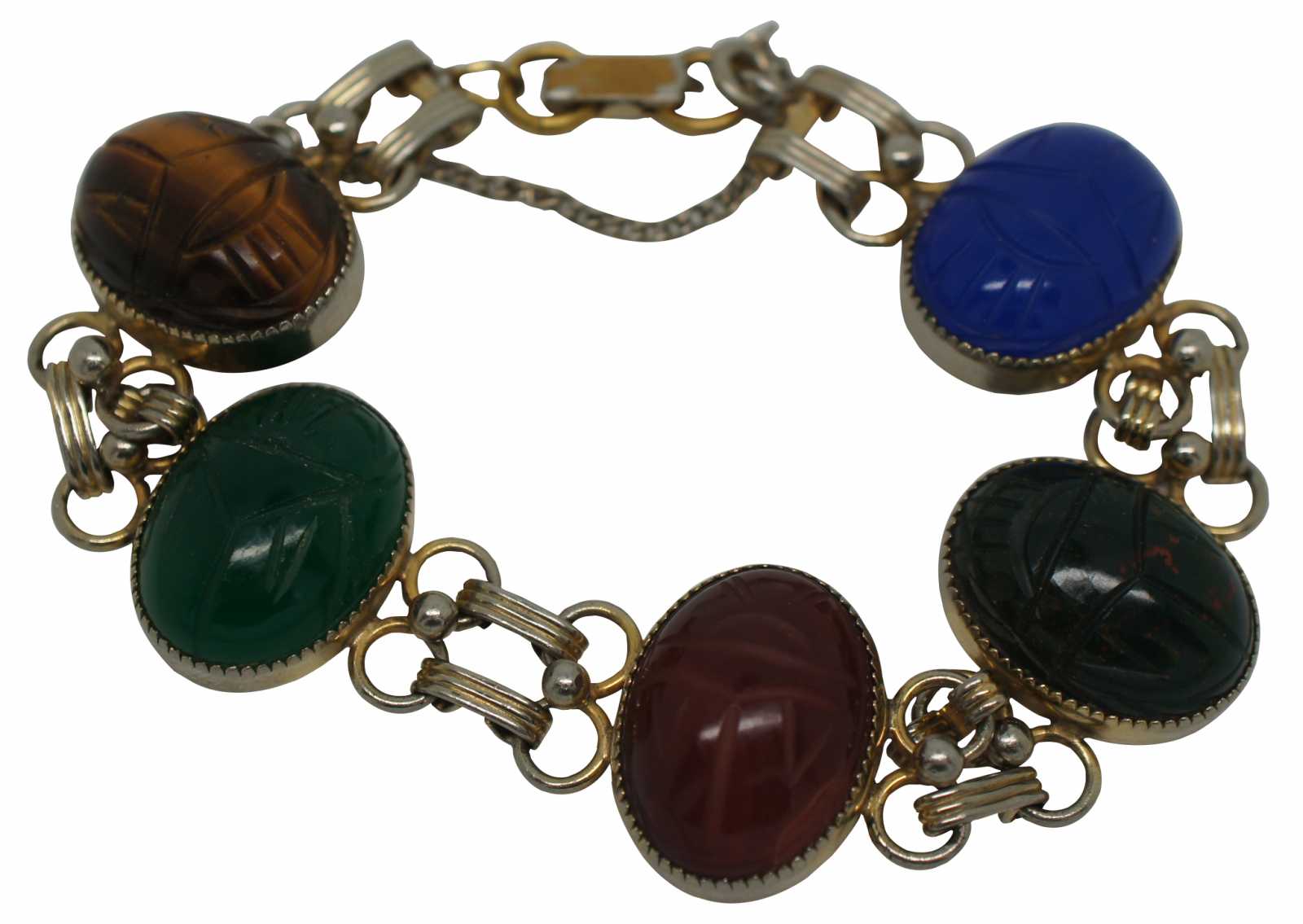 Vintage Star brand carved assorted gemstone scarab beetle bracelet with a silver/gold tone plated chain. Features jadite, lapis, carnilion, bloodstone and chatoyance (tigers eye).