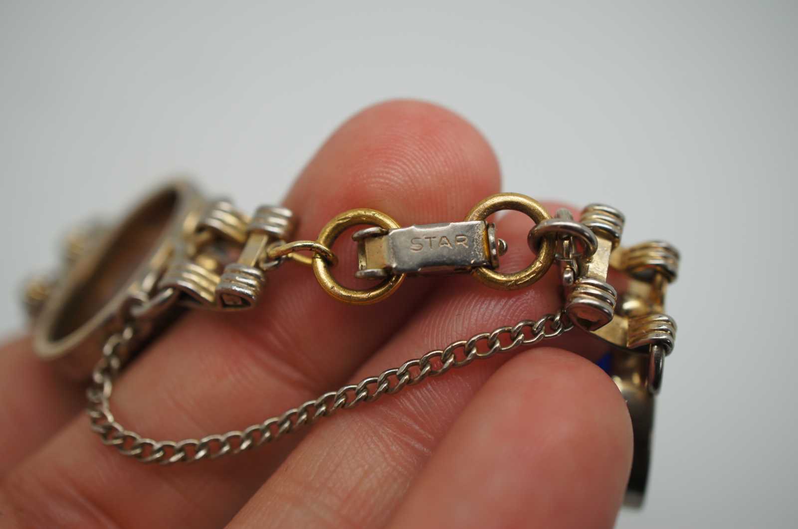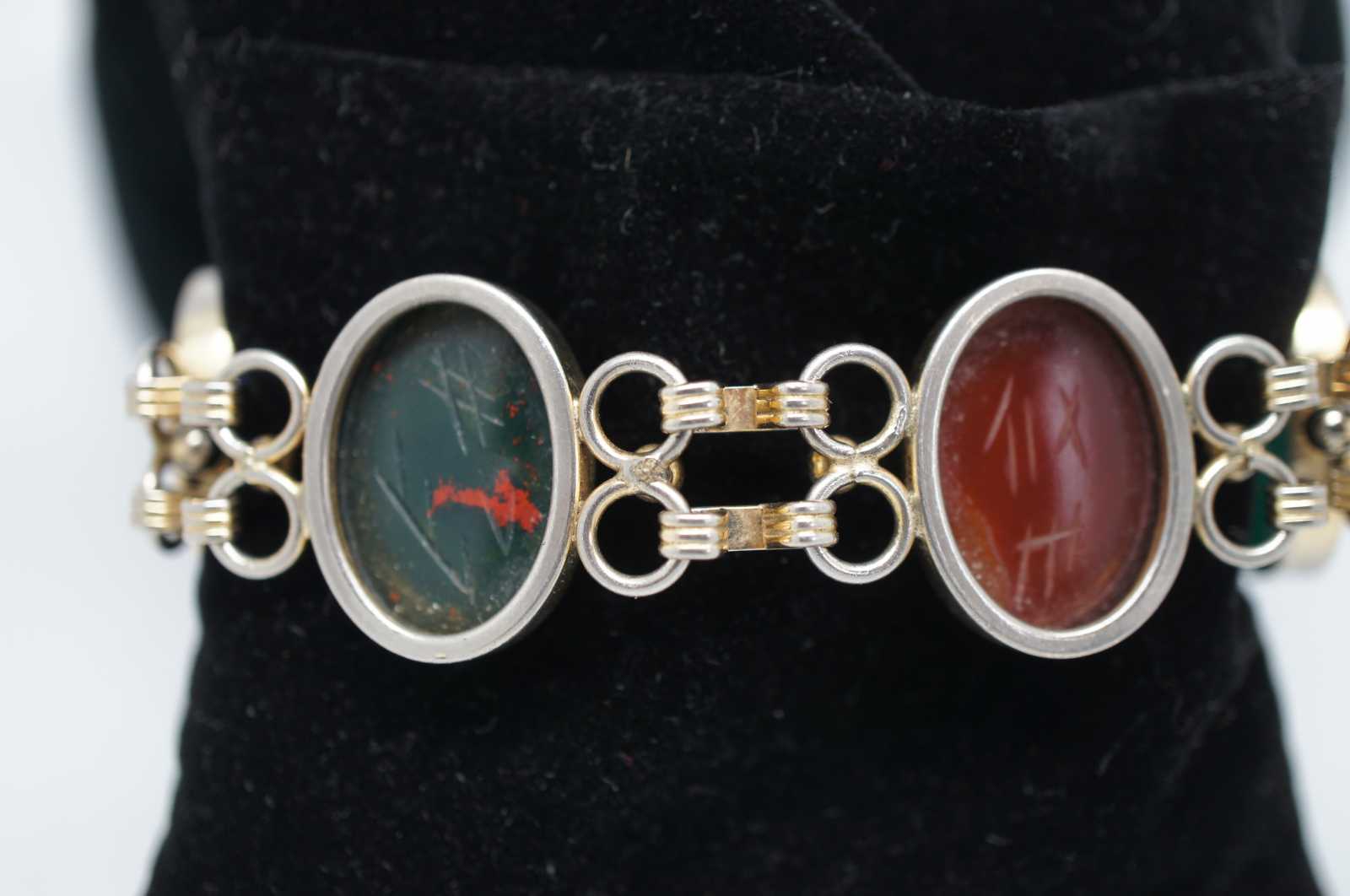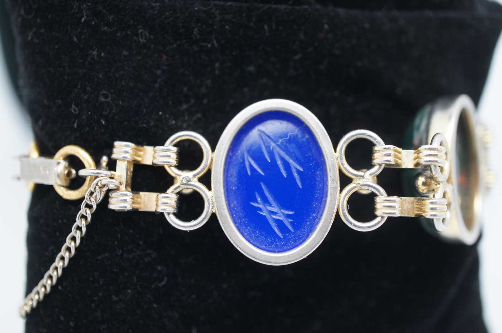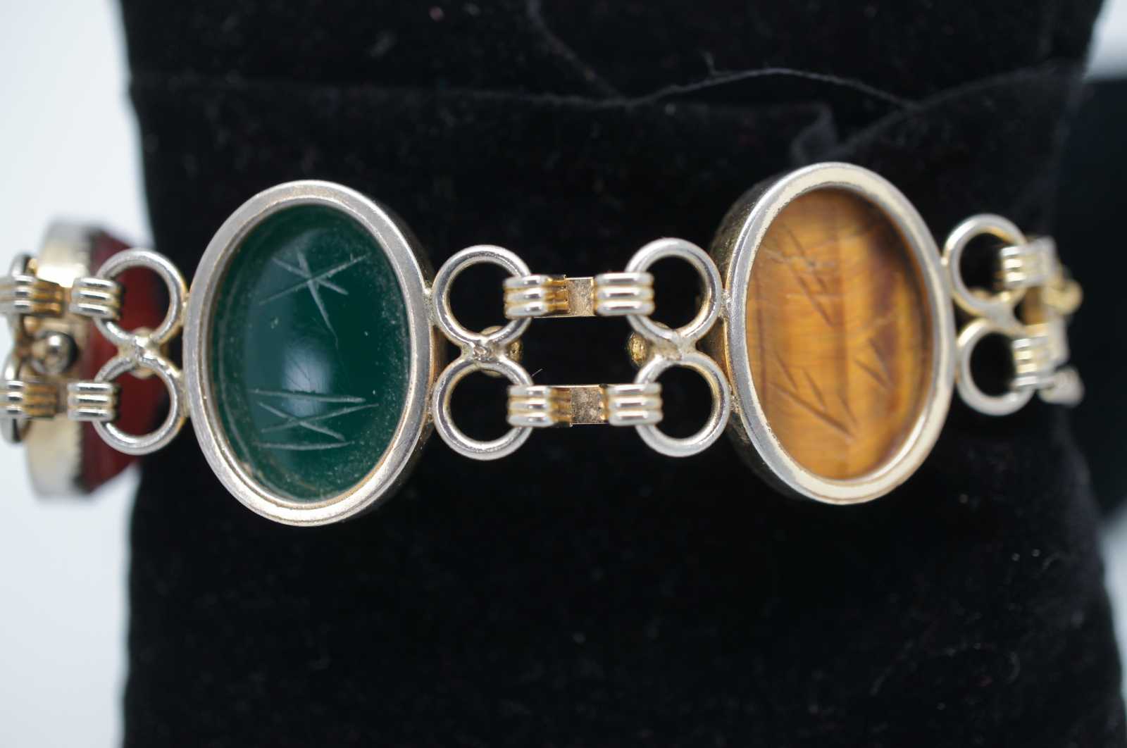 Vintage Star brand carved assorted gemstone scarab beetle bracelet with a silver/gold tone plated chain. Features jadite, lapis, carnilion, bloodstone and chatoyance (tigers eye).