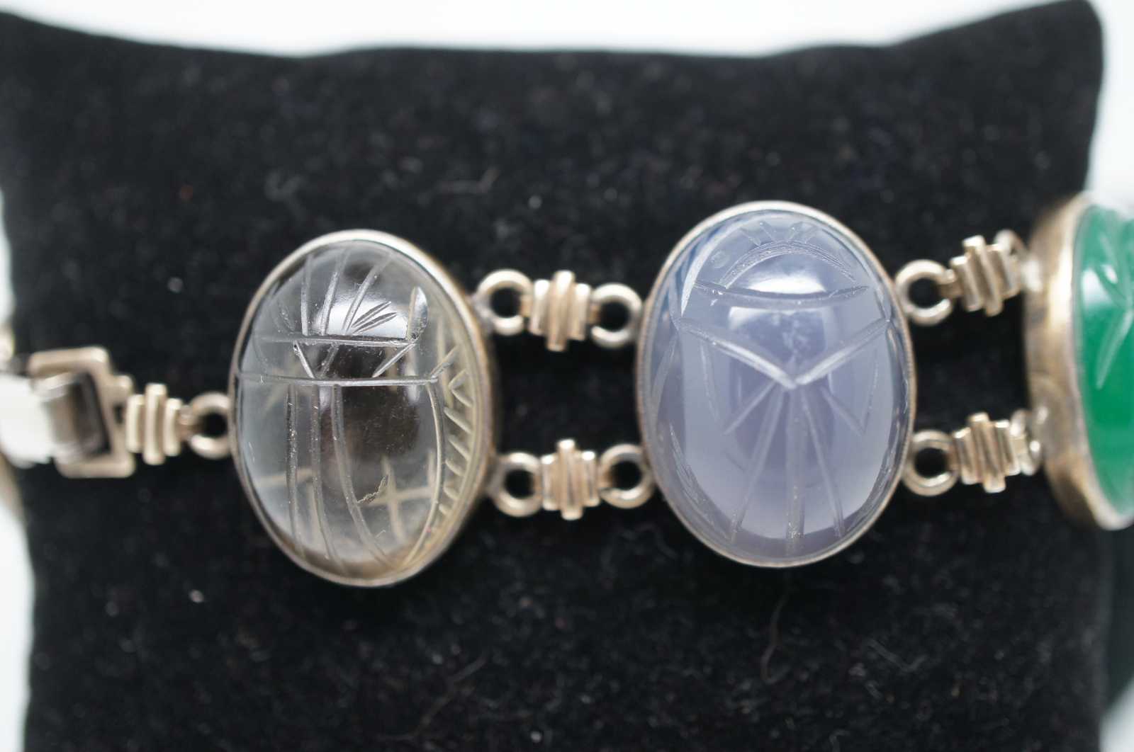 Vintage carved scarab gemstone double link beetle bracelet with Symmetalic sterling silver 925 and 1/20-14K gold chain. Features clear and white/smokey quartz crystal, onyx, jadite, carnilion, lapis, chatoyance (tigers eye)