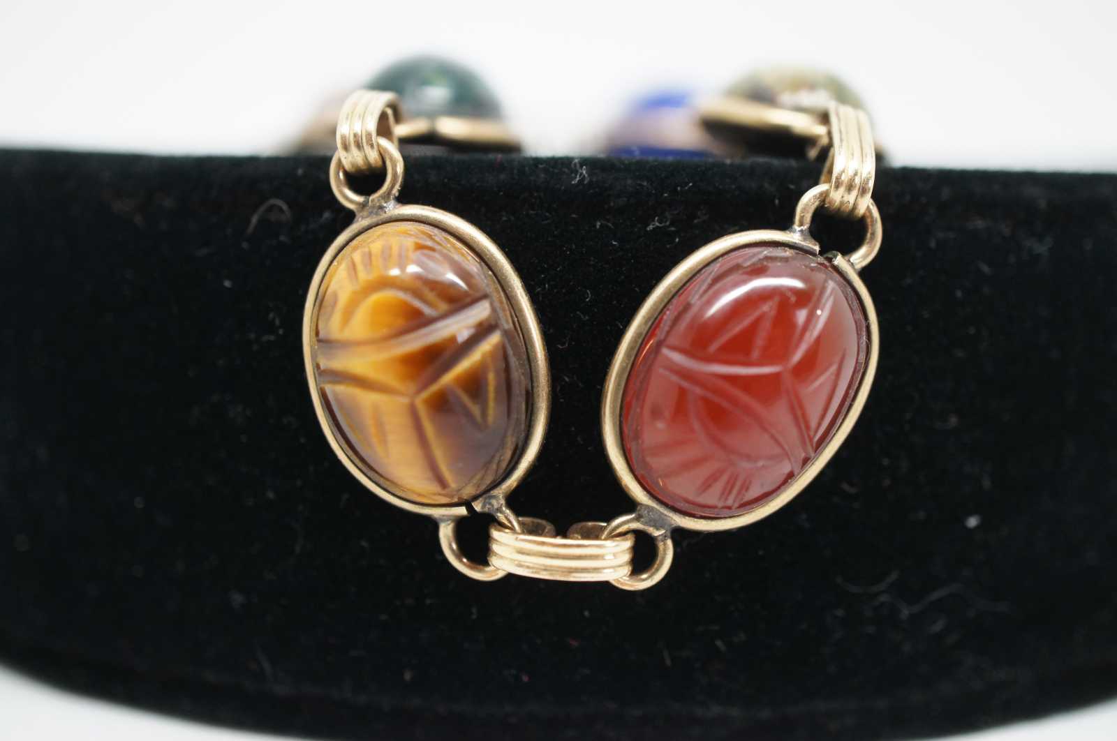 Vintage carved assorted gemstone scarab beetle bracelet with gold tone/plated chain. Features chatoyance (tigers eye), carnilion, jadite, lapis, bloodstone, and clear quartz.