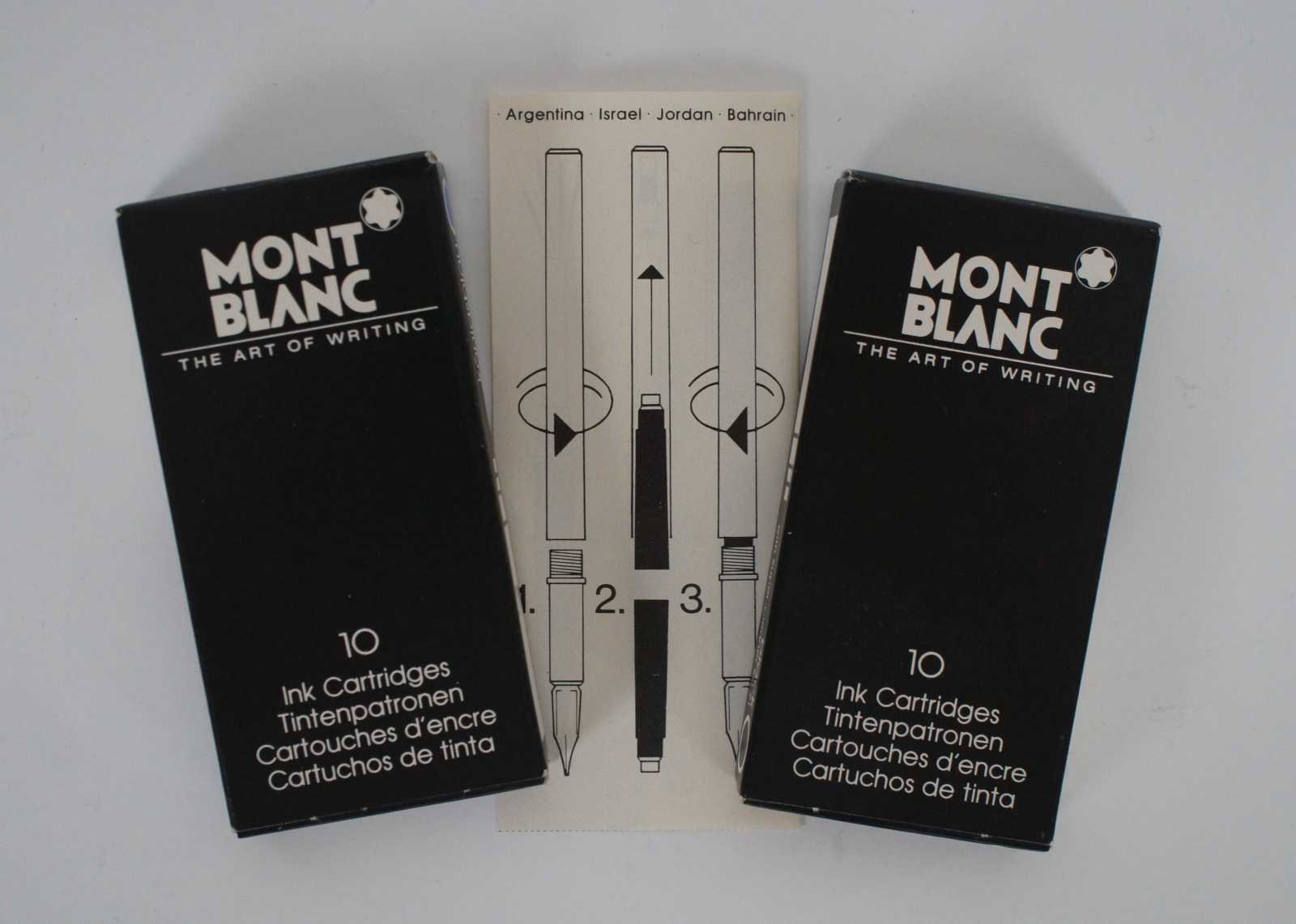 Vintage Montblanc Meisterstuck No 144 cartridge fountain pen in Bordeaux red with 4810 14K gold 585 nib; black and royal blue 10 piece replacement cartridge packages included.