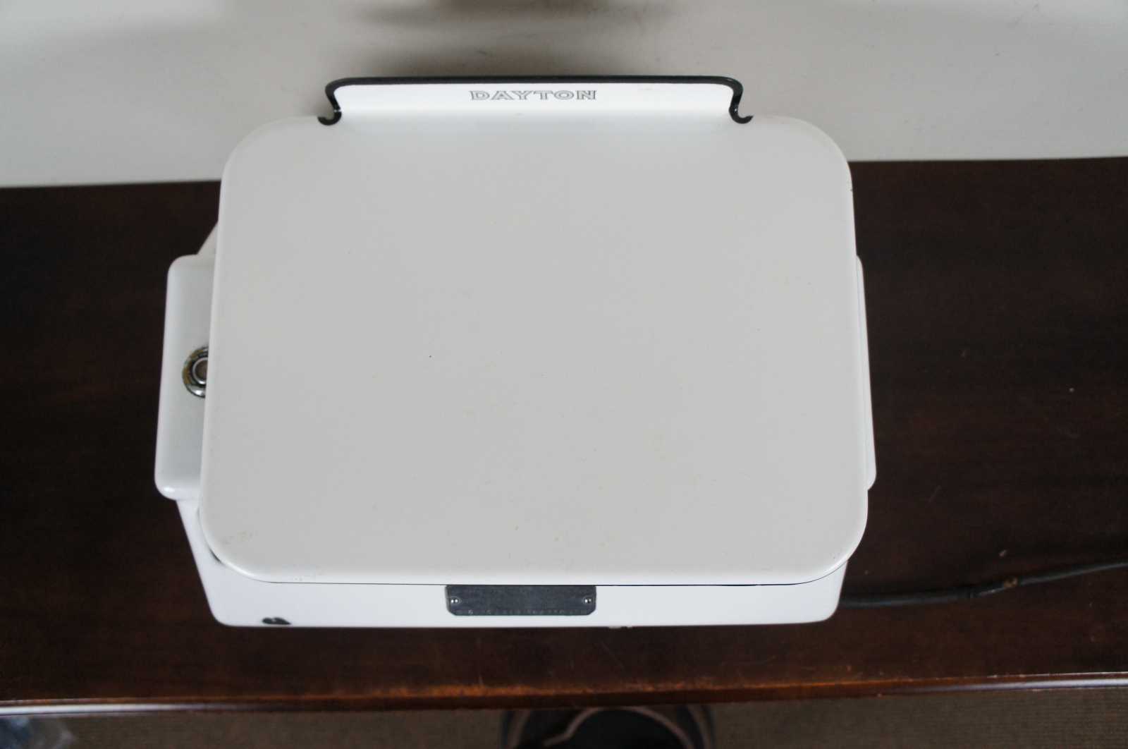 Vintage white enameled Dayton Scale Division meat scale, made at the Hobart Manufacturing Company, style 970, 30lb capacity.