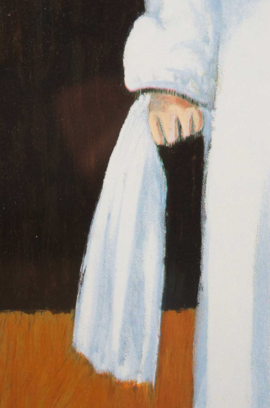 Pencil signed and numbered 340/595 lithograph print of a French waiter carrying a tray with iced Champagne and a vase of flowers.