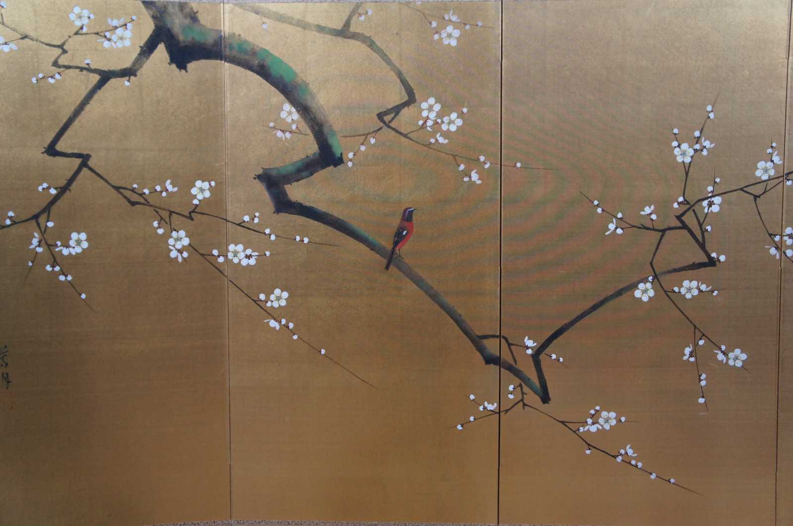 Vintage hand painted Japanese byobu room screen featuring a bird perched on a flowering tree branch on a gold background.