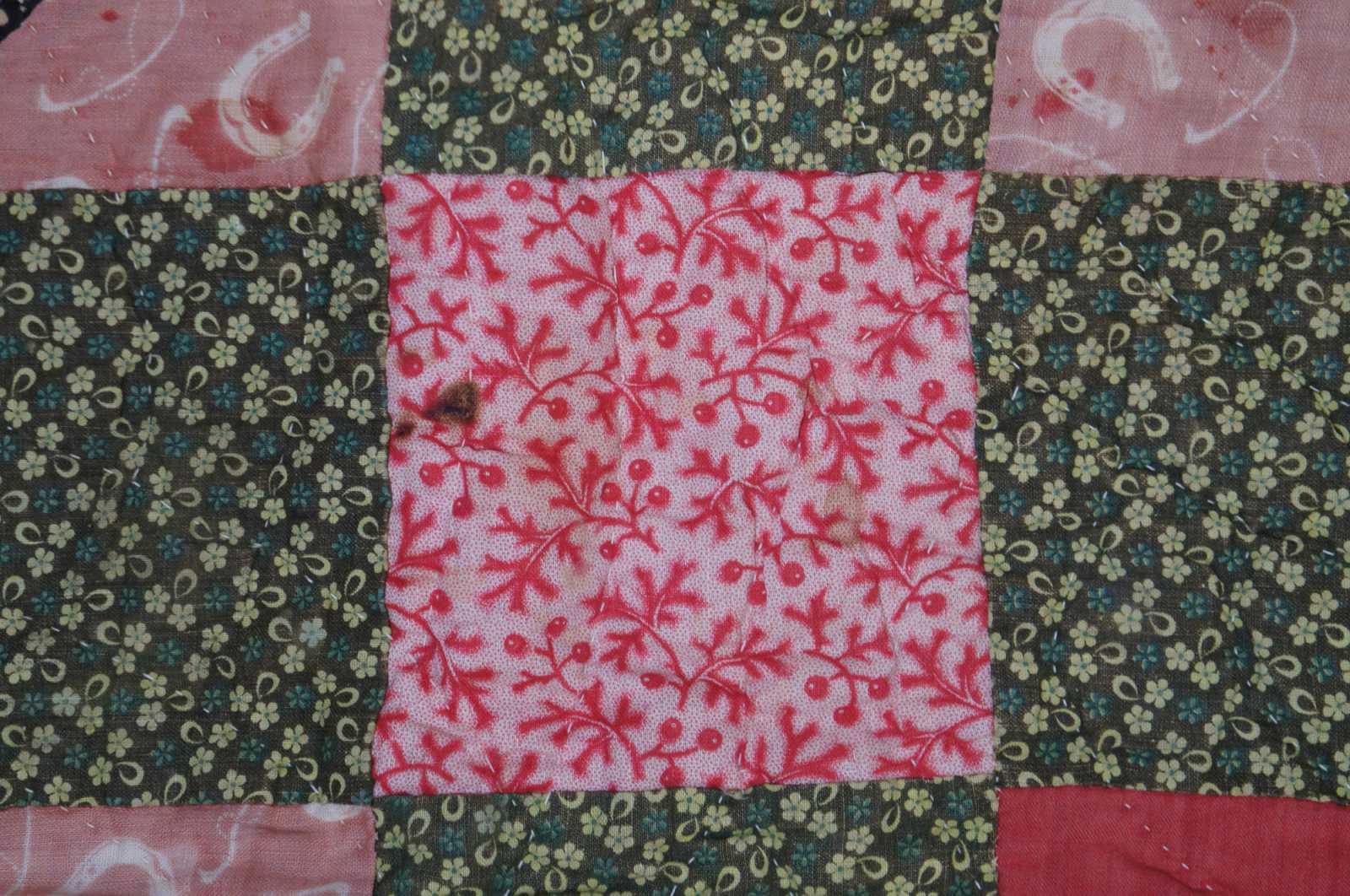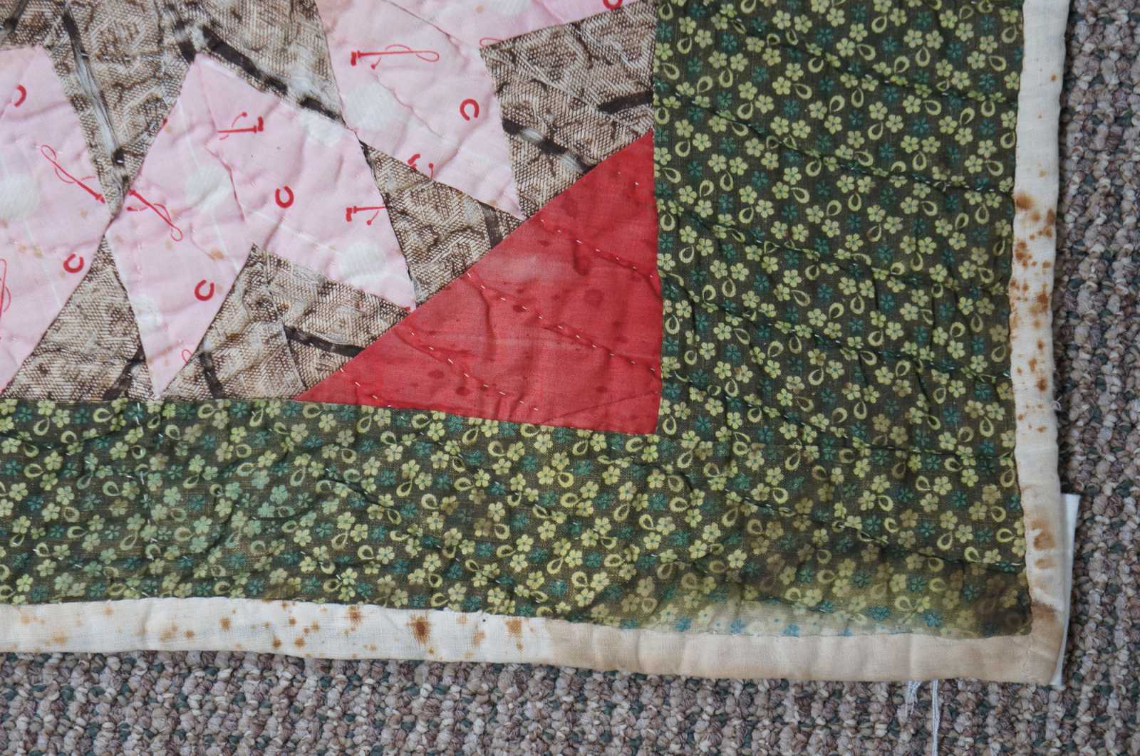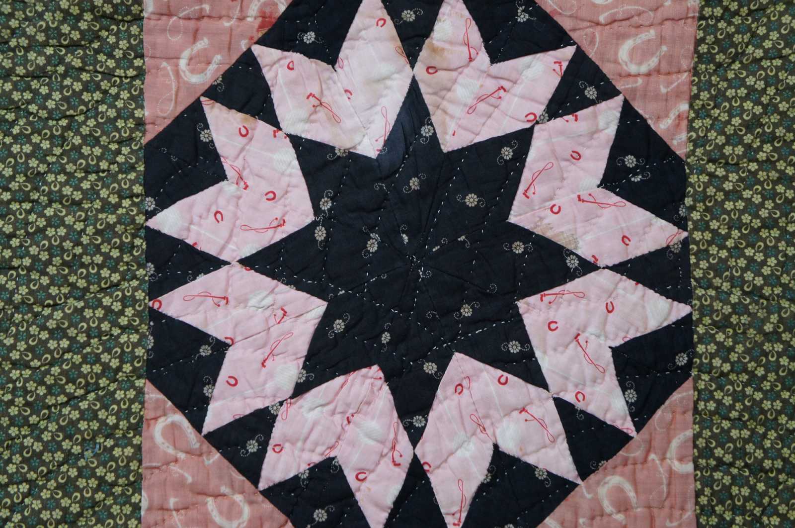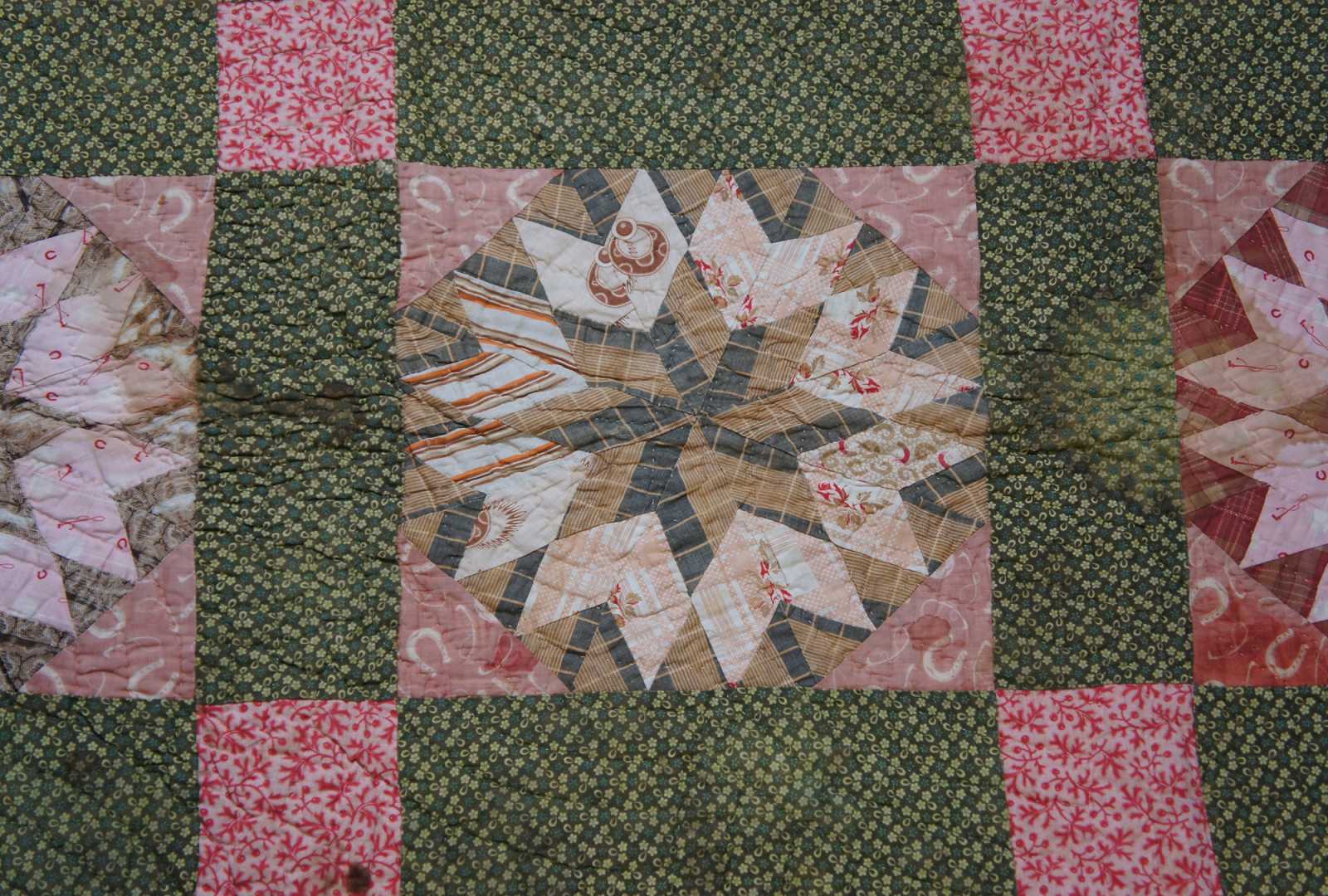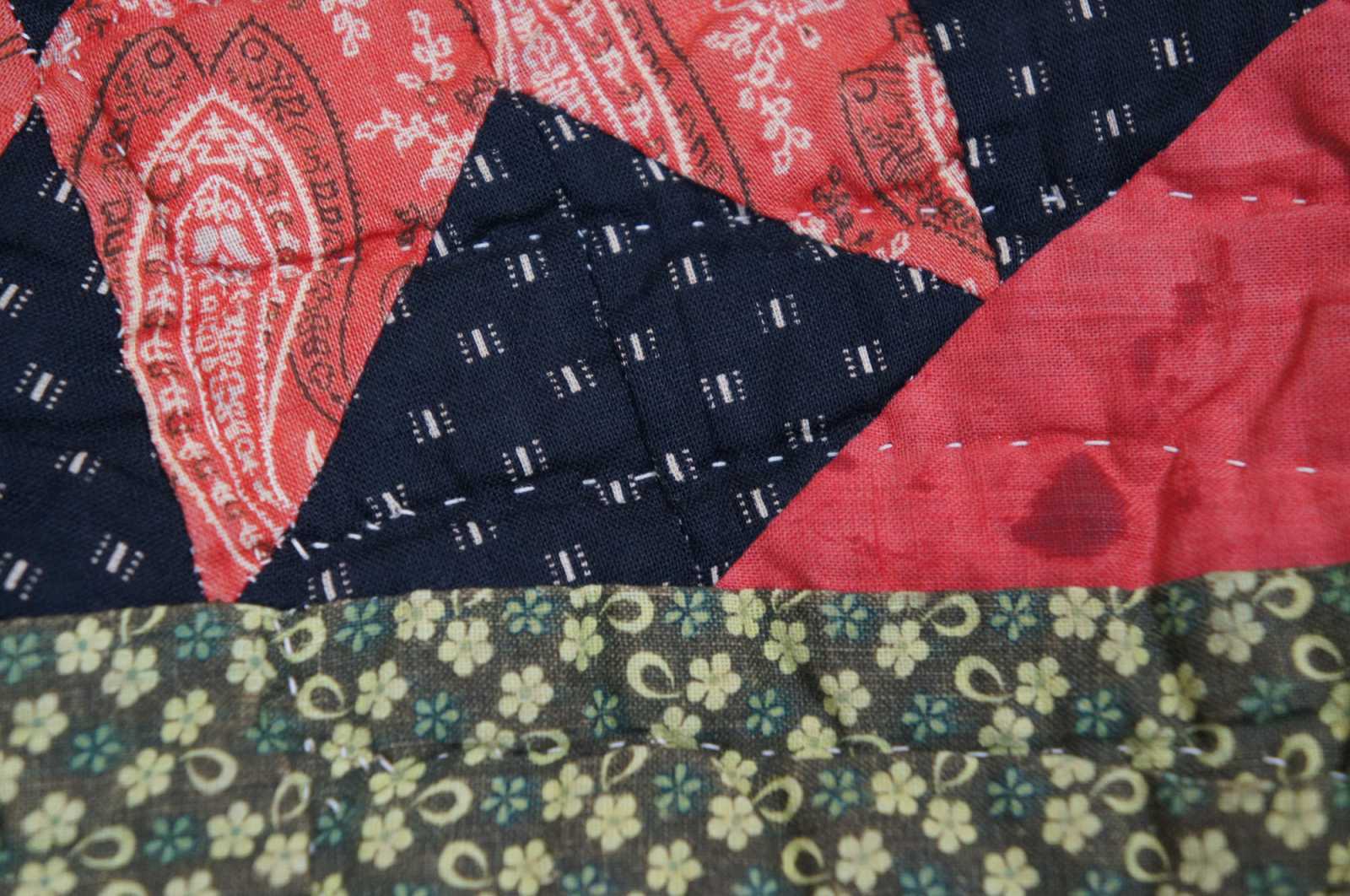Circa 1940s hand crafted folk art style patchwork quilt in green and pink with proken stars pattern. Reverse also has loops along two different sides so the quilt could be hung on a rod as wall décor.