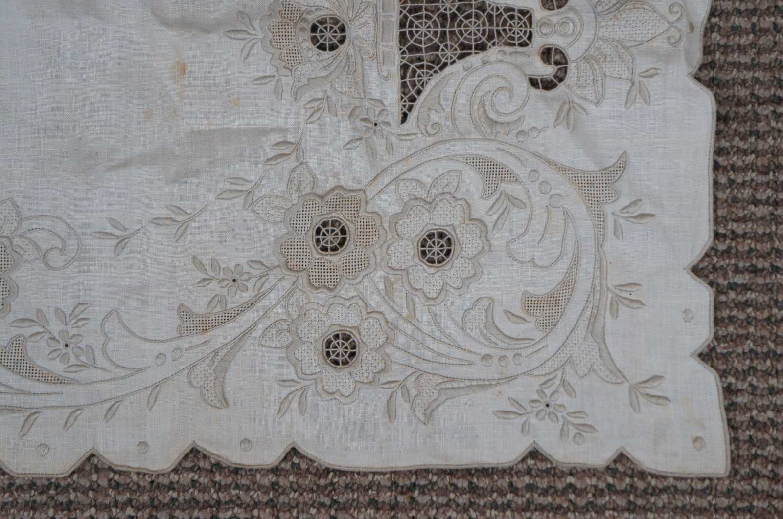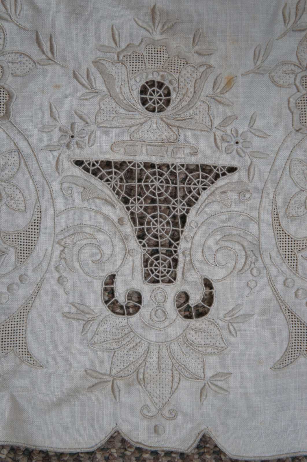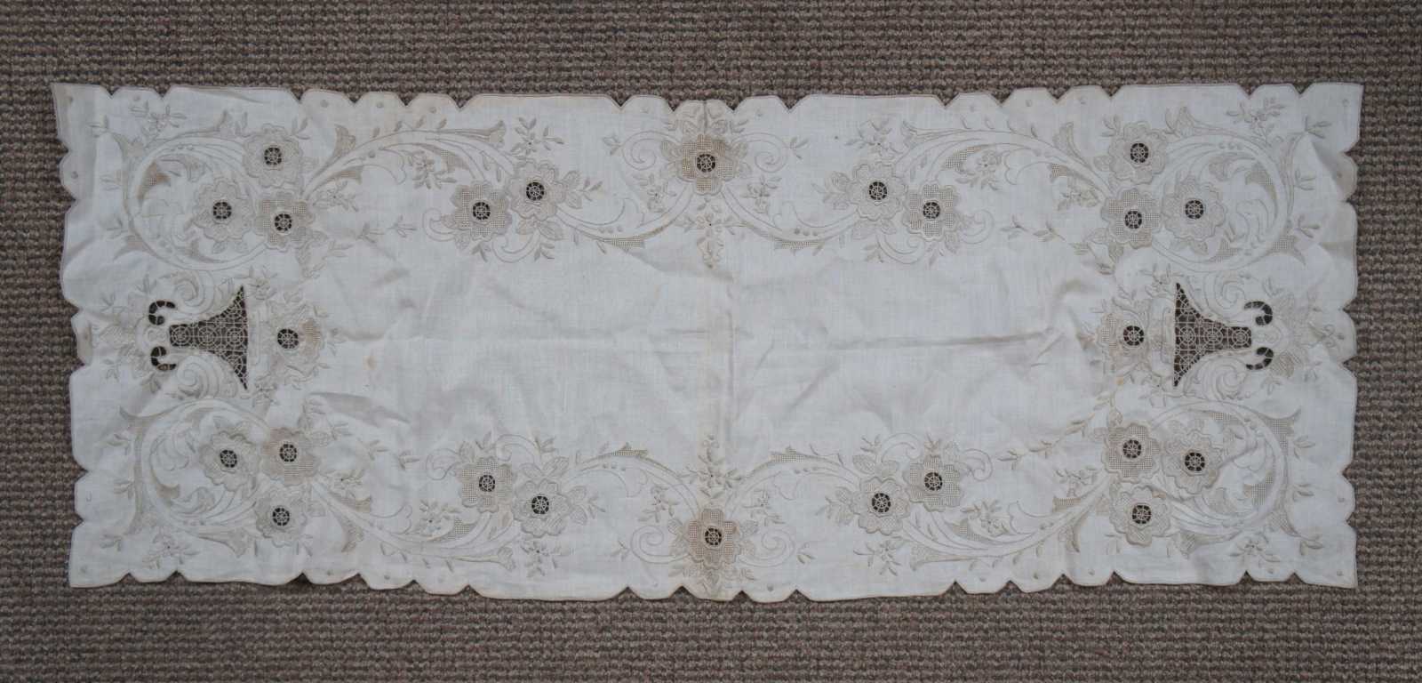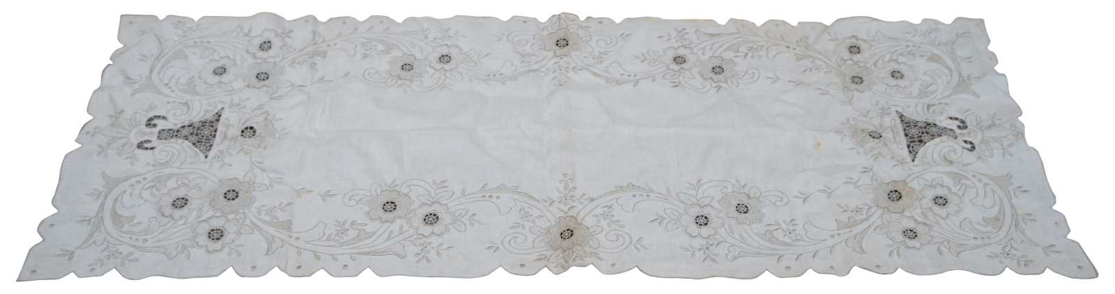 Antique white linen table runner with scalloped edge, beige embroidered flowers and reticulated lace accents.