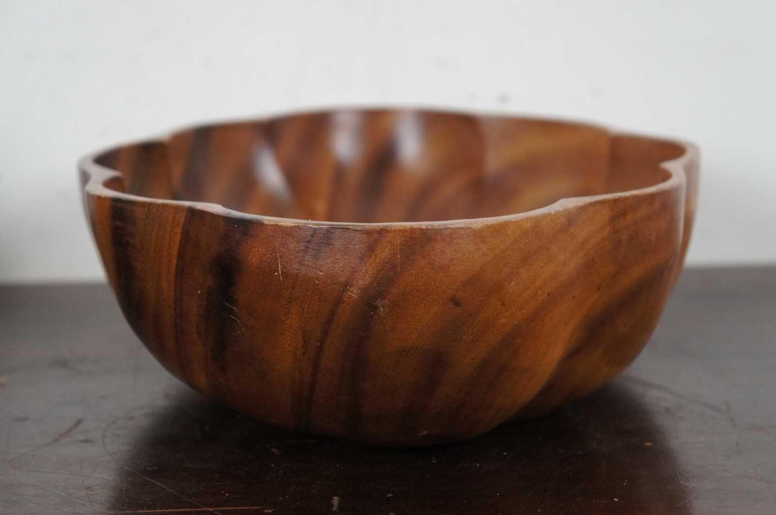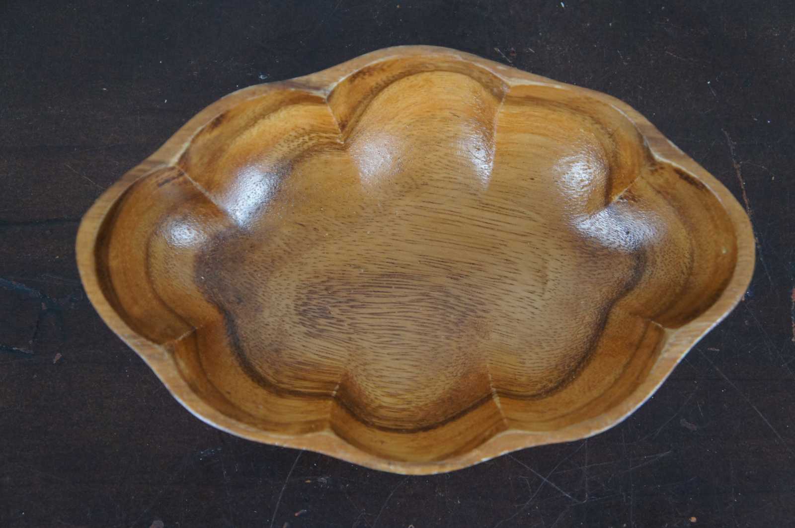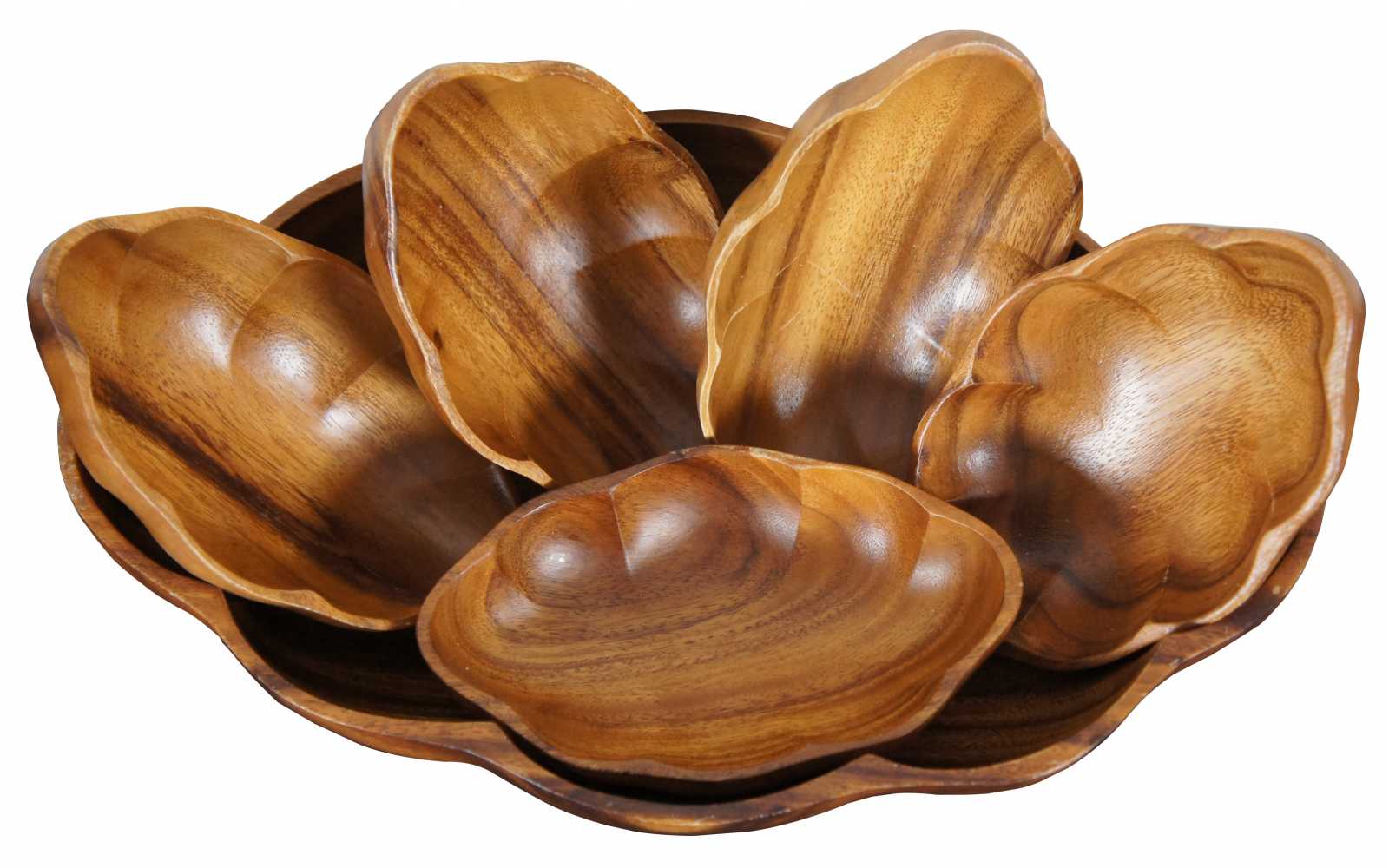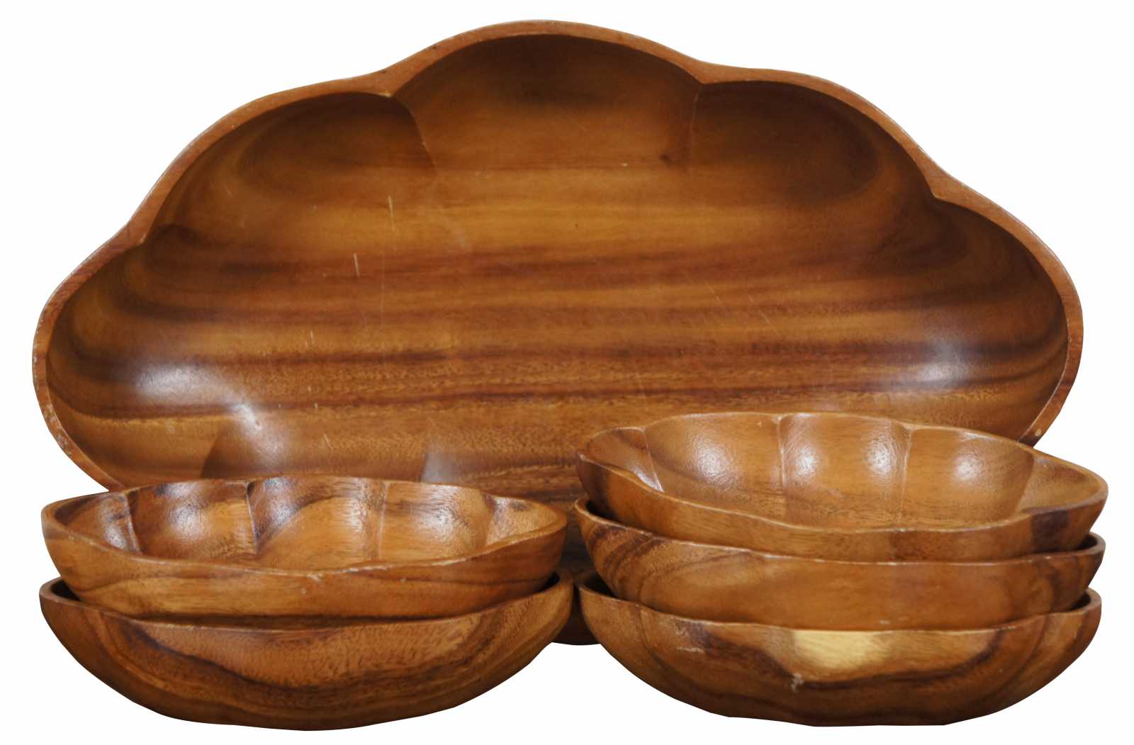 Vintage hand carved wooden salad bowl set with scalloped edges. Includes serving dish and five personal bowls.