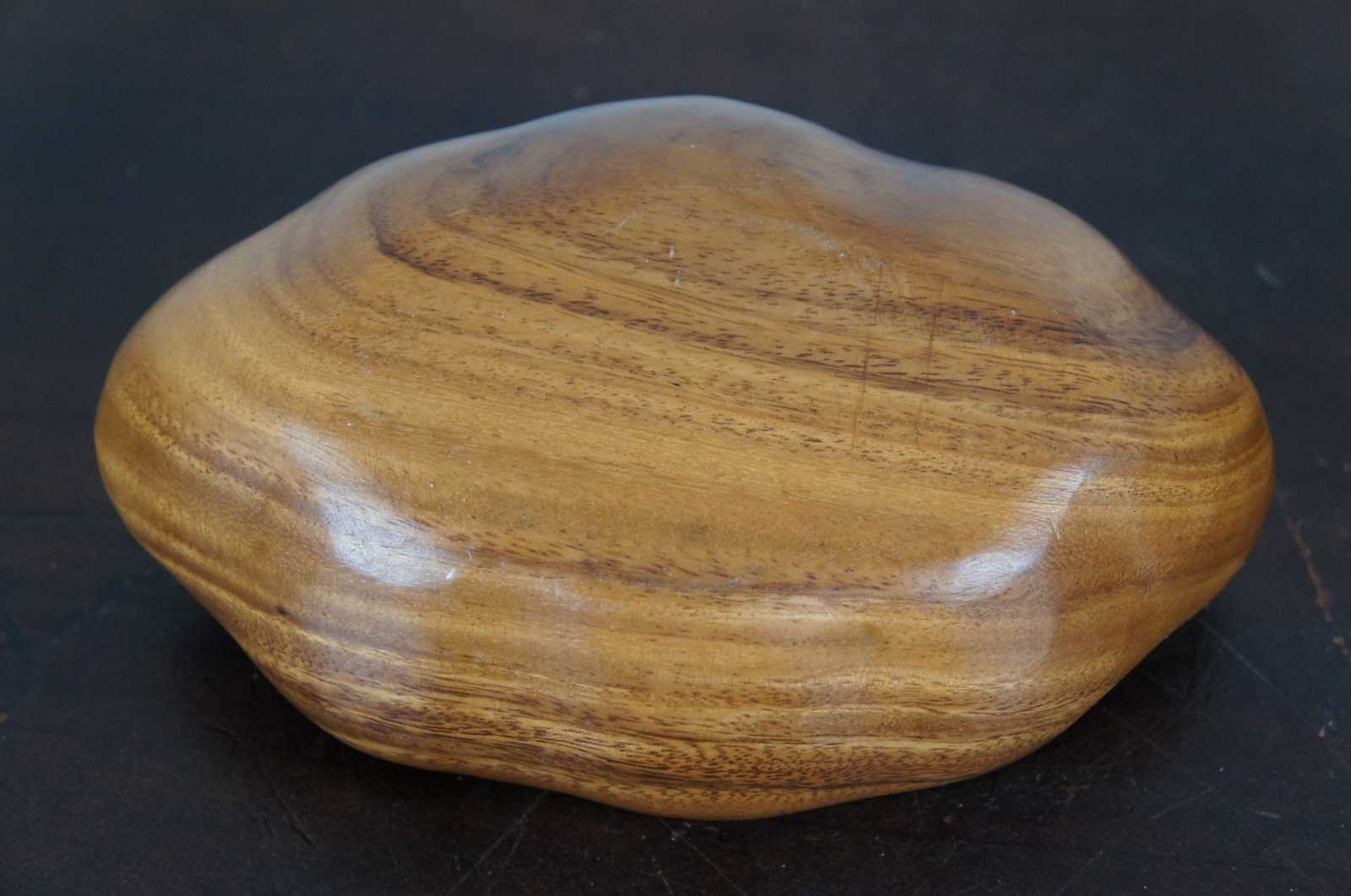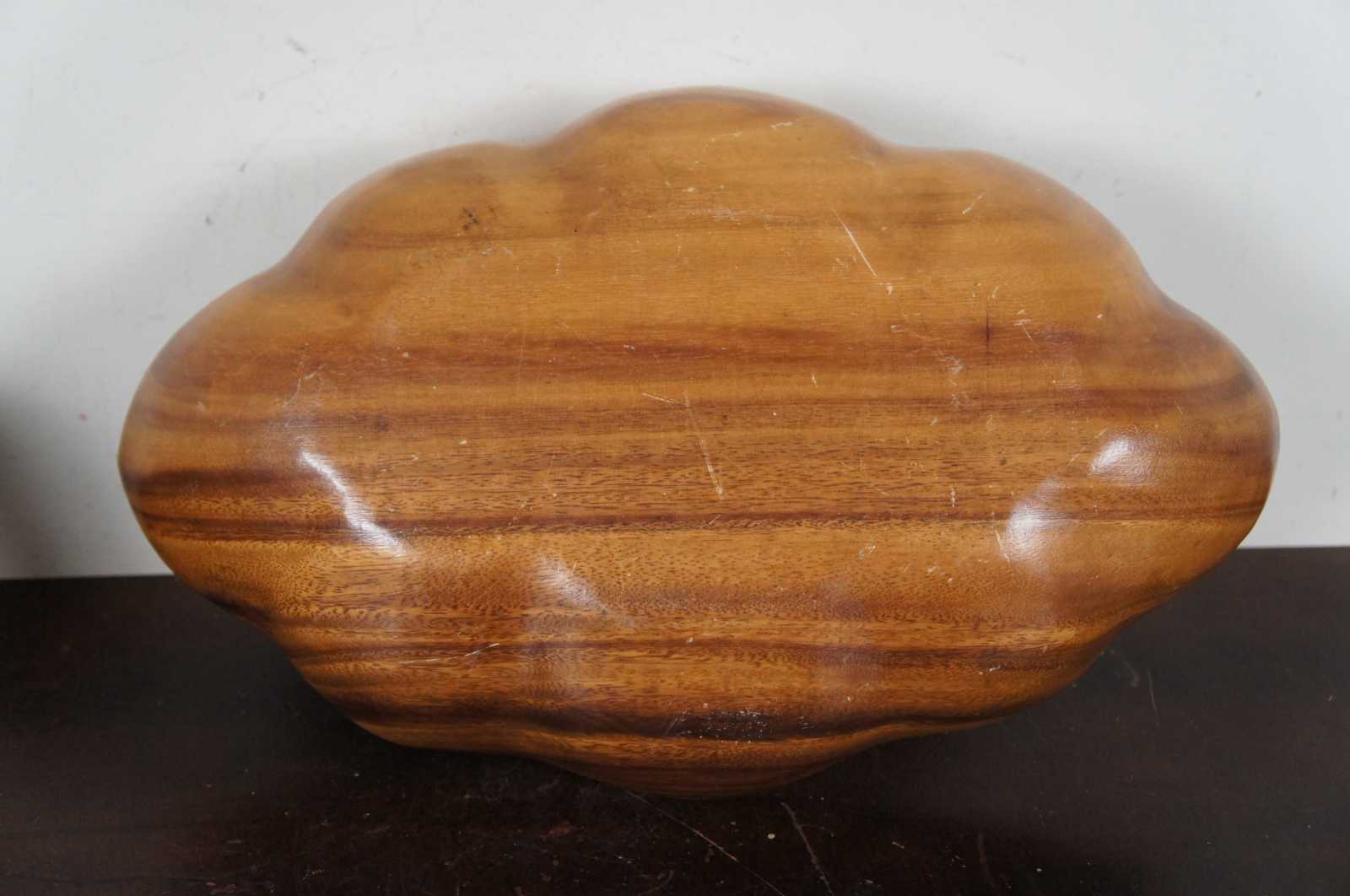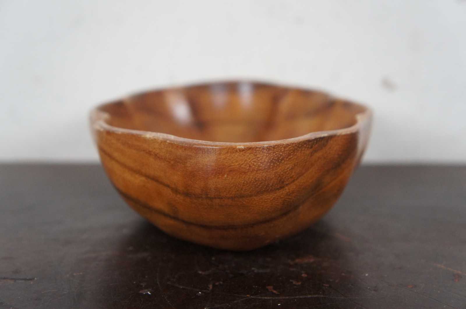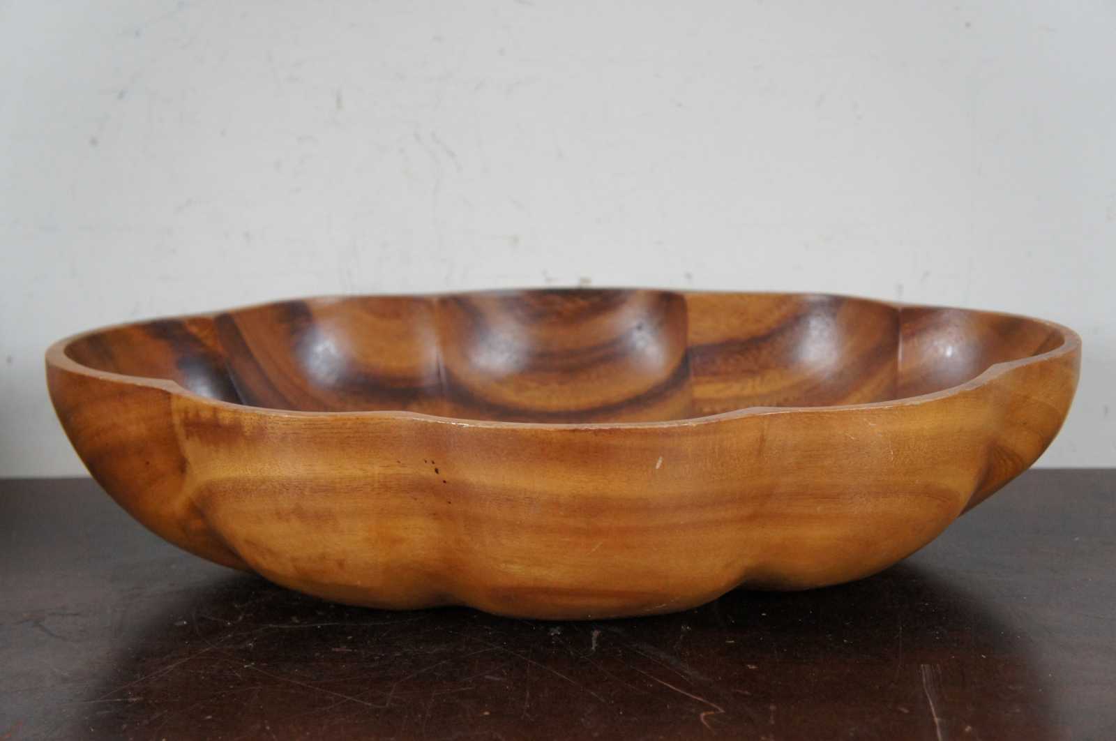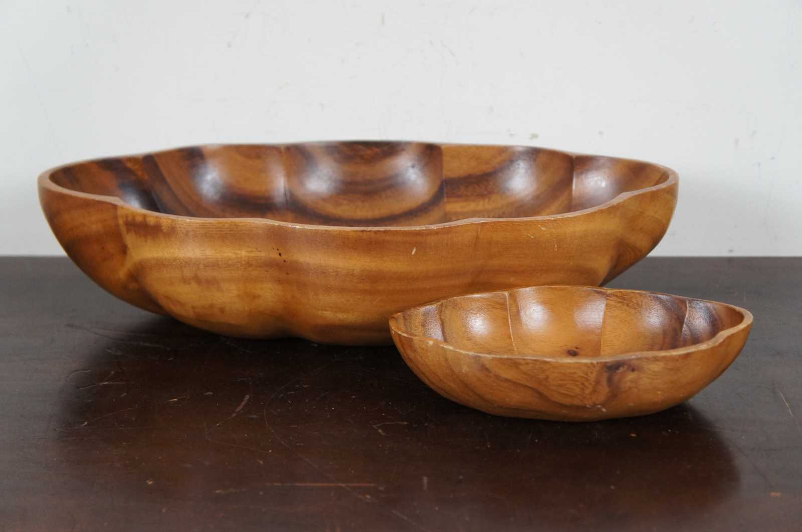 Vintage hand carved wooden salad bowl set with scalloped edges. Includes serving dish and five personal bowls.