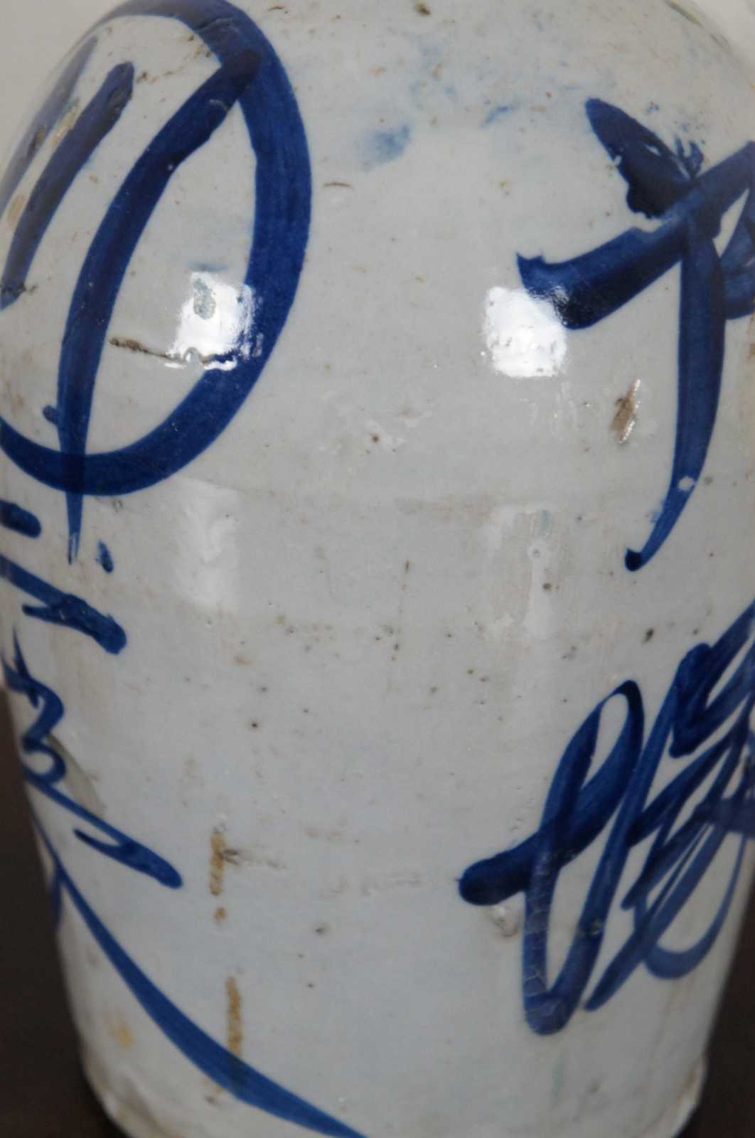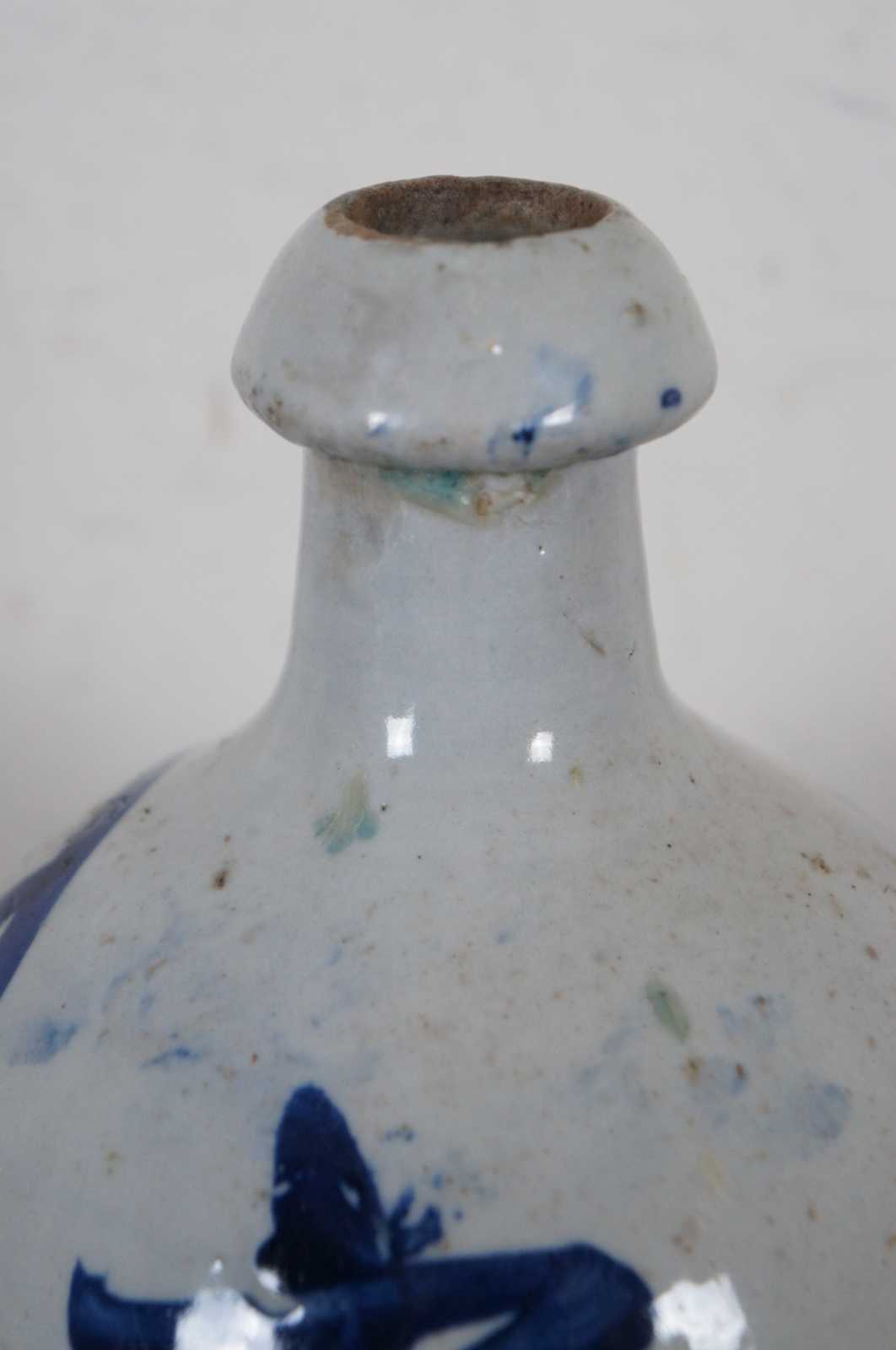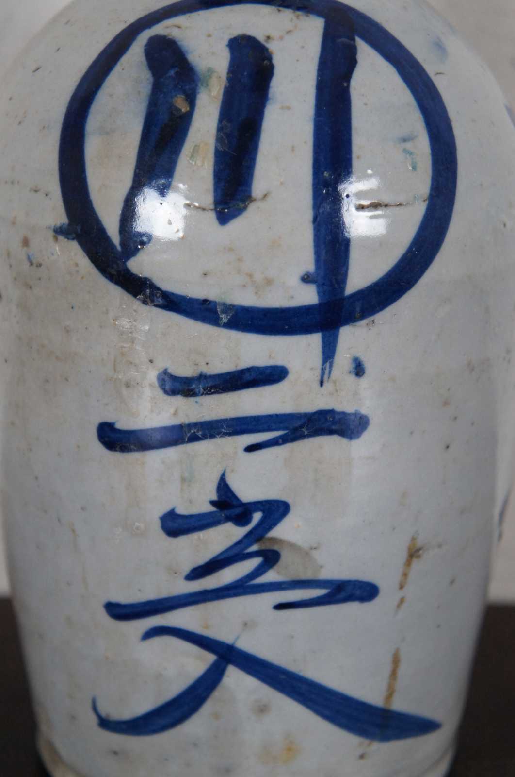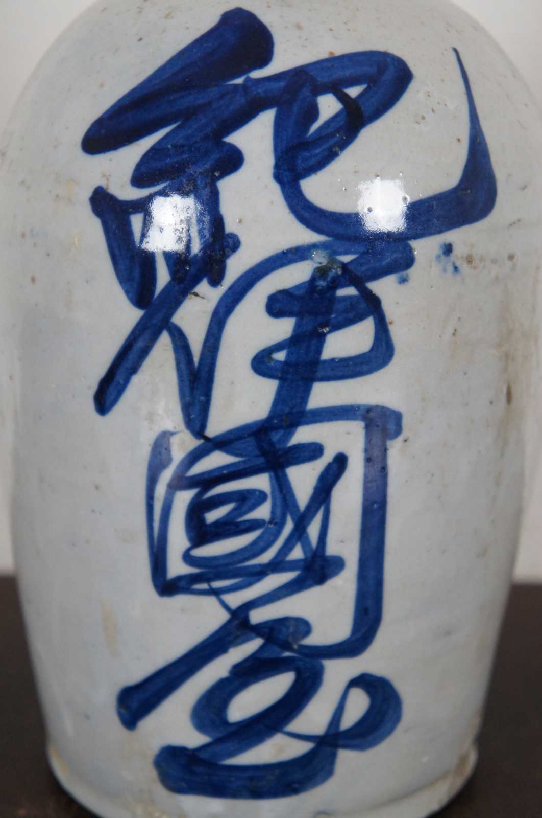 Antique Japanese stoneware tokkuri or sake bottle with painted blue characters.