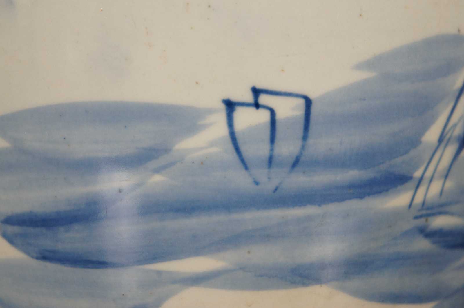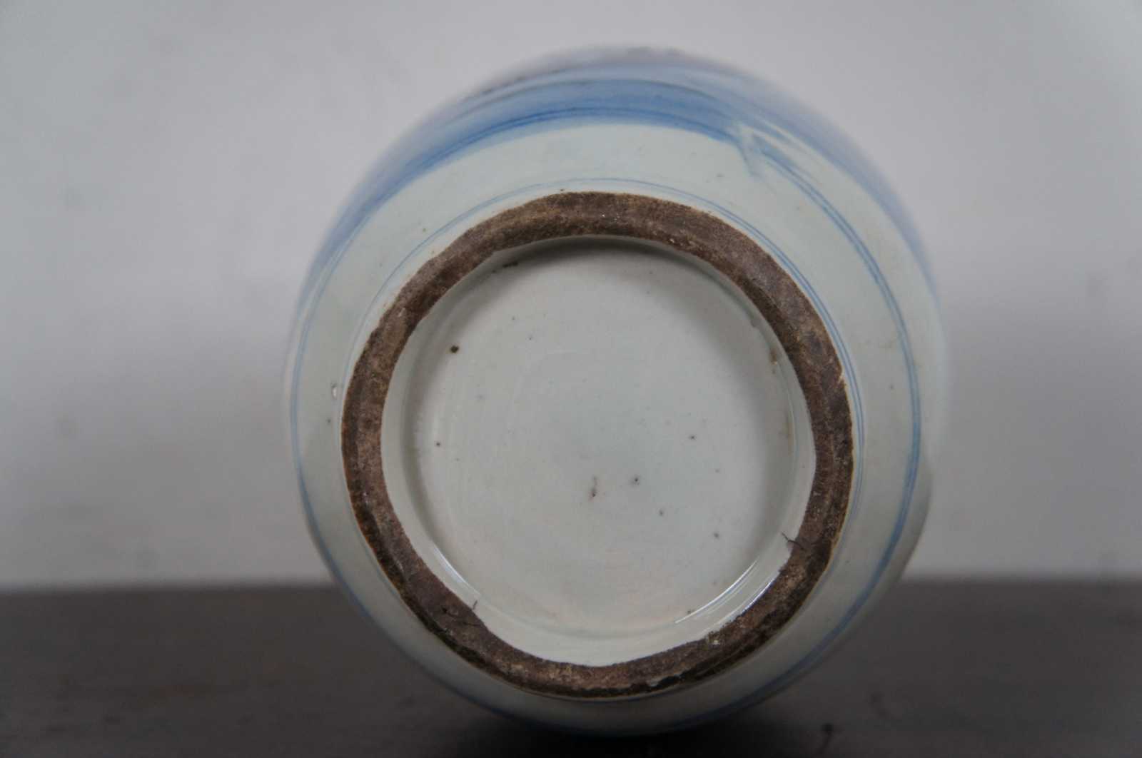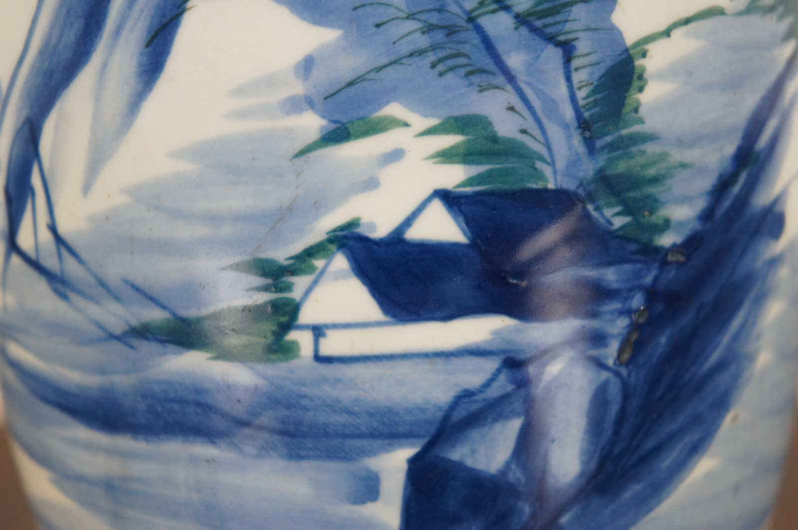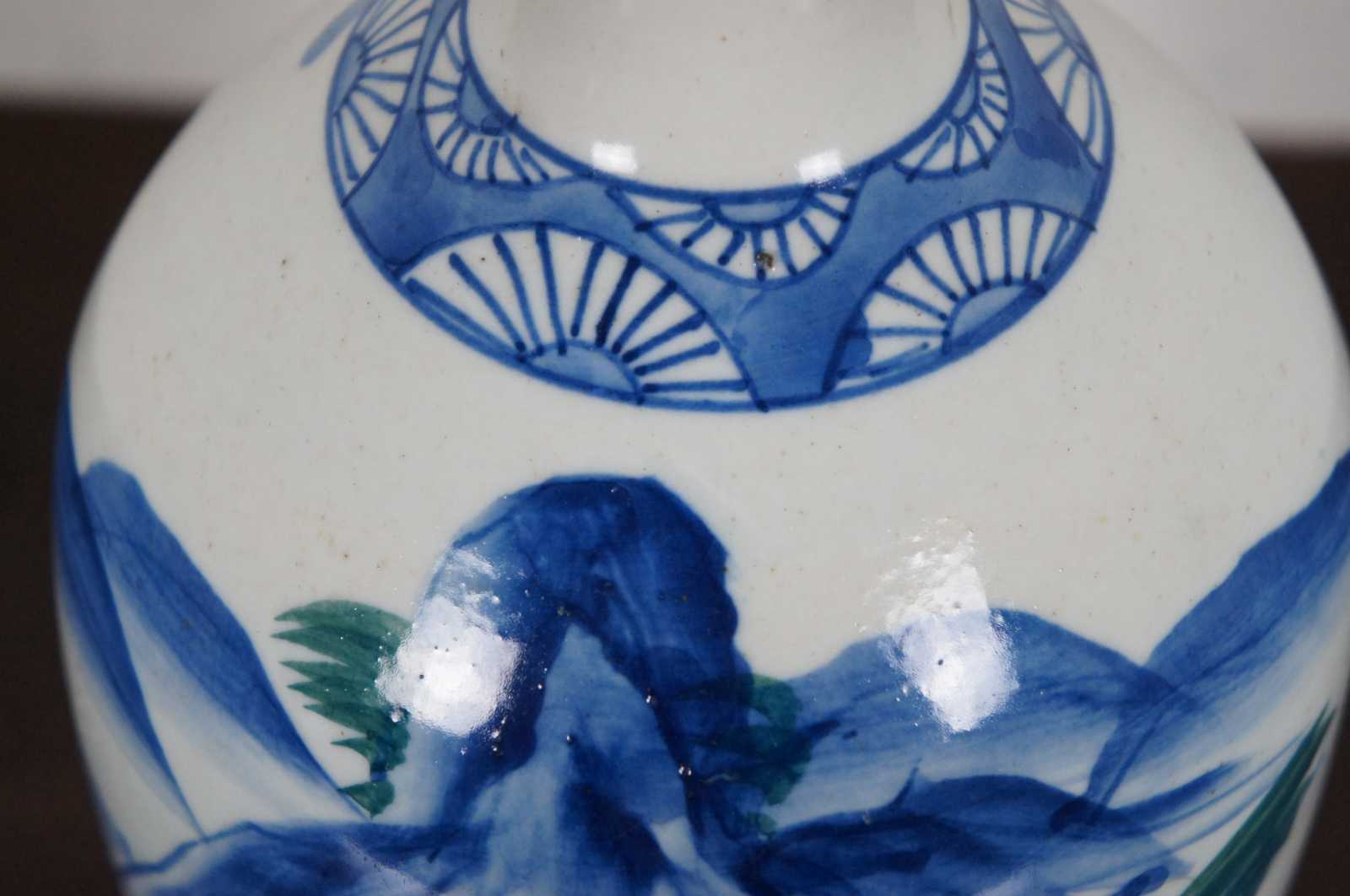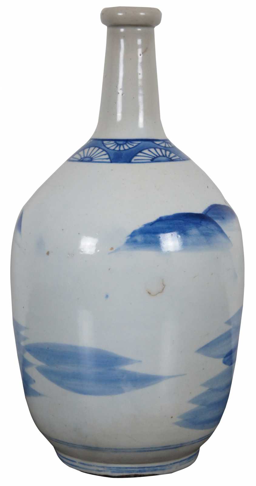 Antique Japanese ceramic tokkuri or sake bottle with a blue painted landscape.