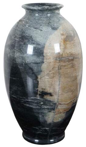 Heavy natural polished marble vase in dark gray with a light brown patch.