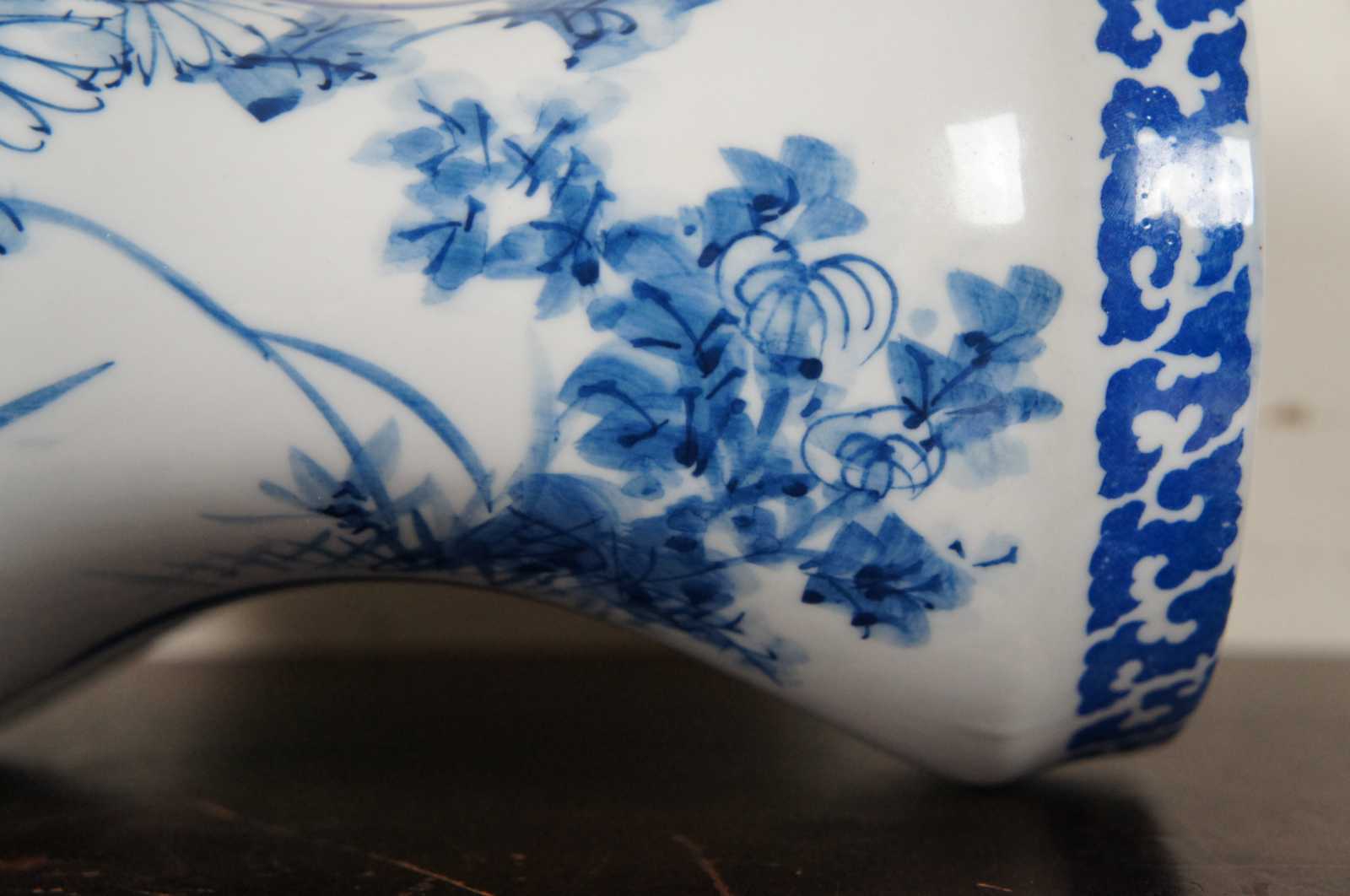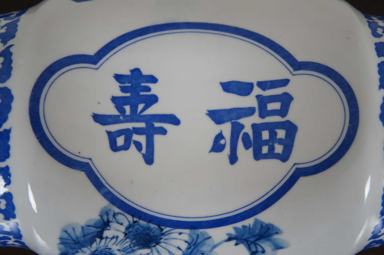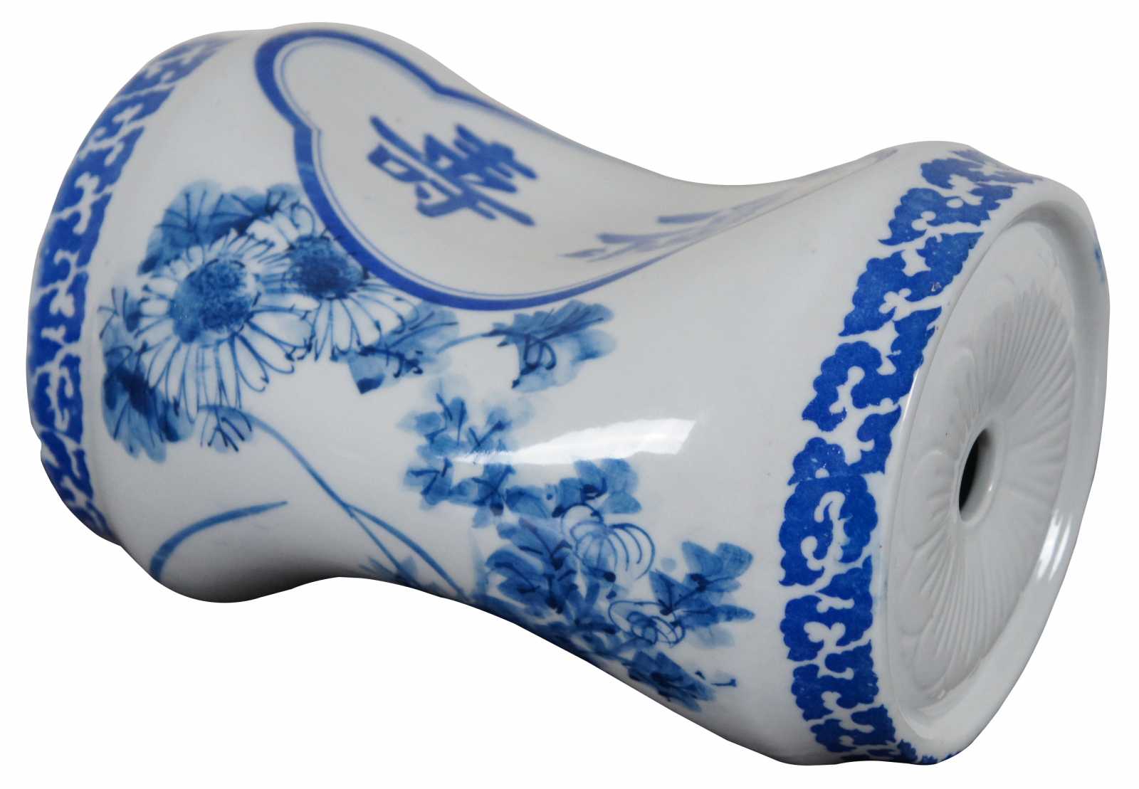 Vintage blue and white painted porcelain Chinese head or neck rest decorated with calligraphy, flowers and branches.