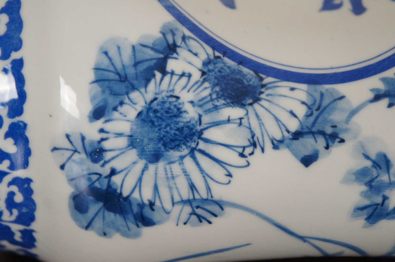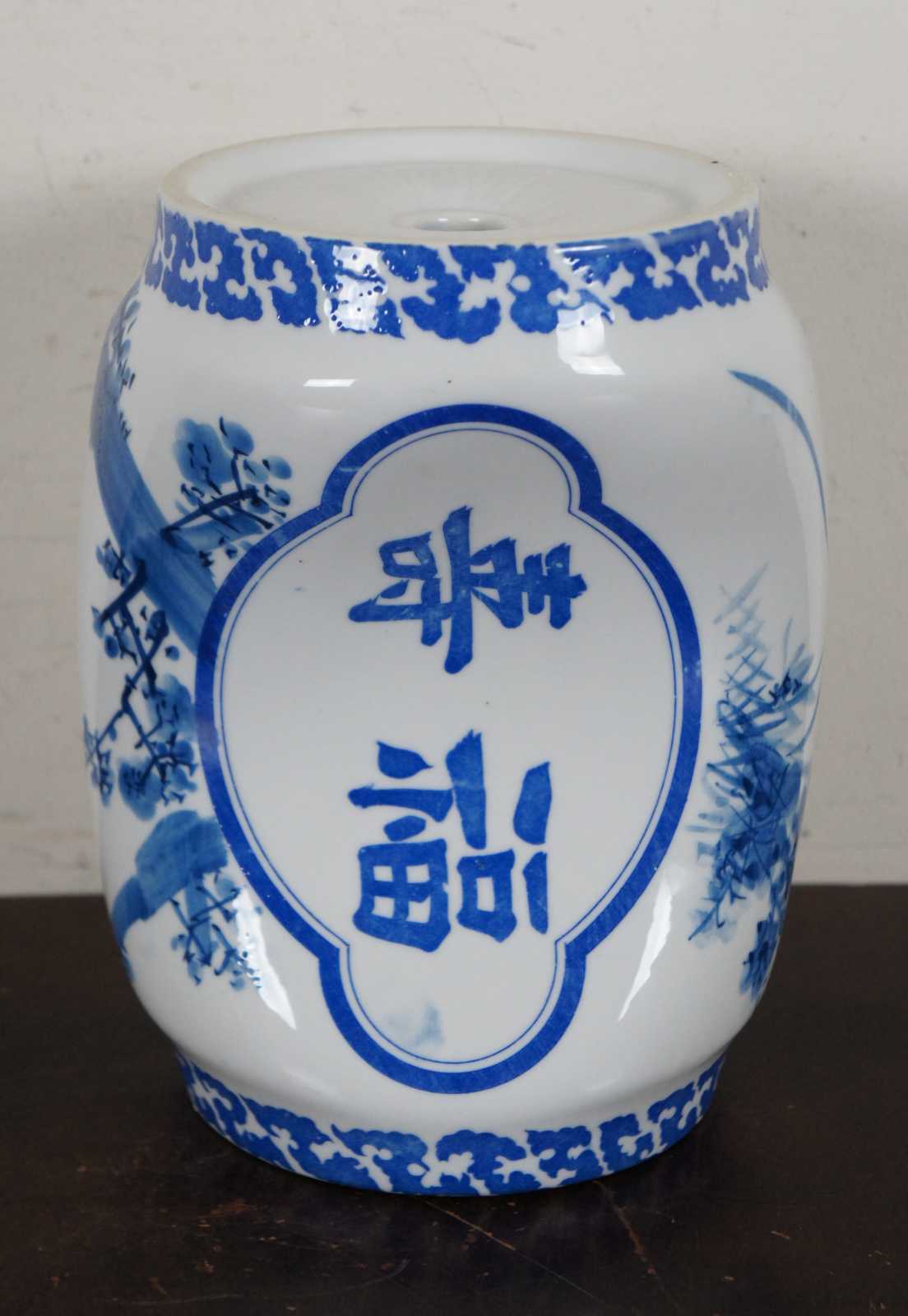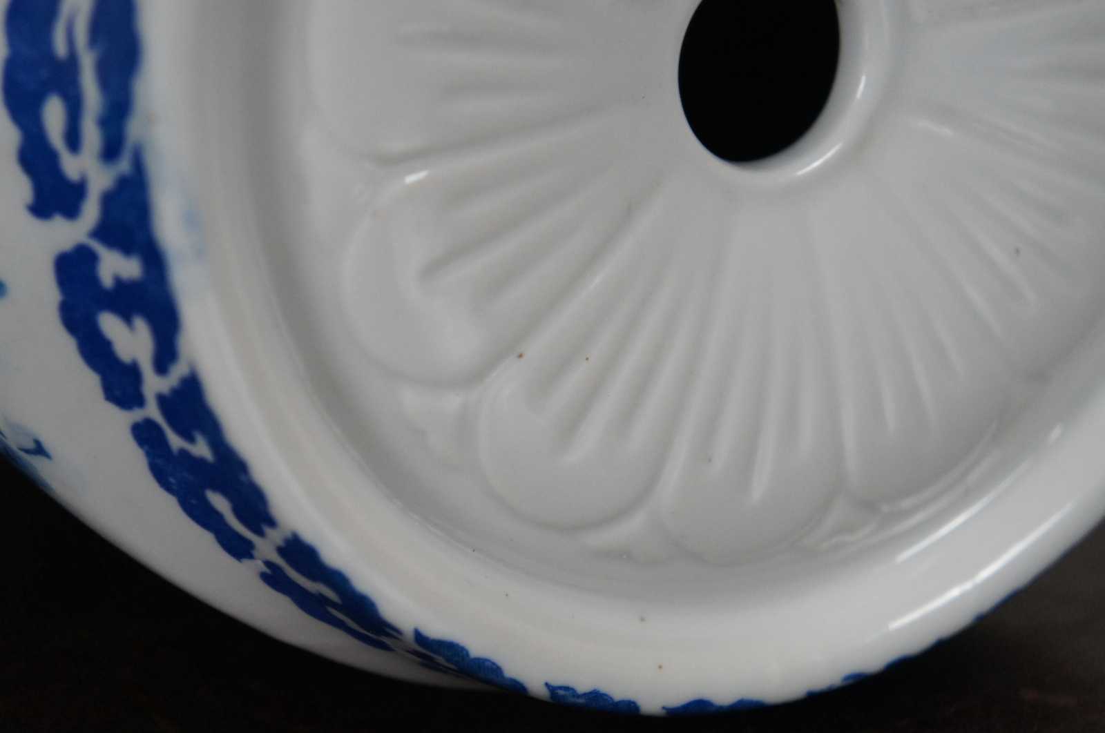 Vintage blue and white painted porcelain Chinese head or neck rest decorated with calligraphy, flowers and branches.