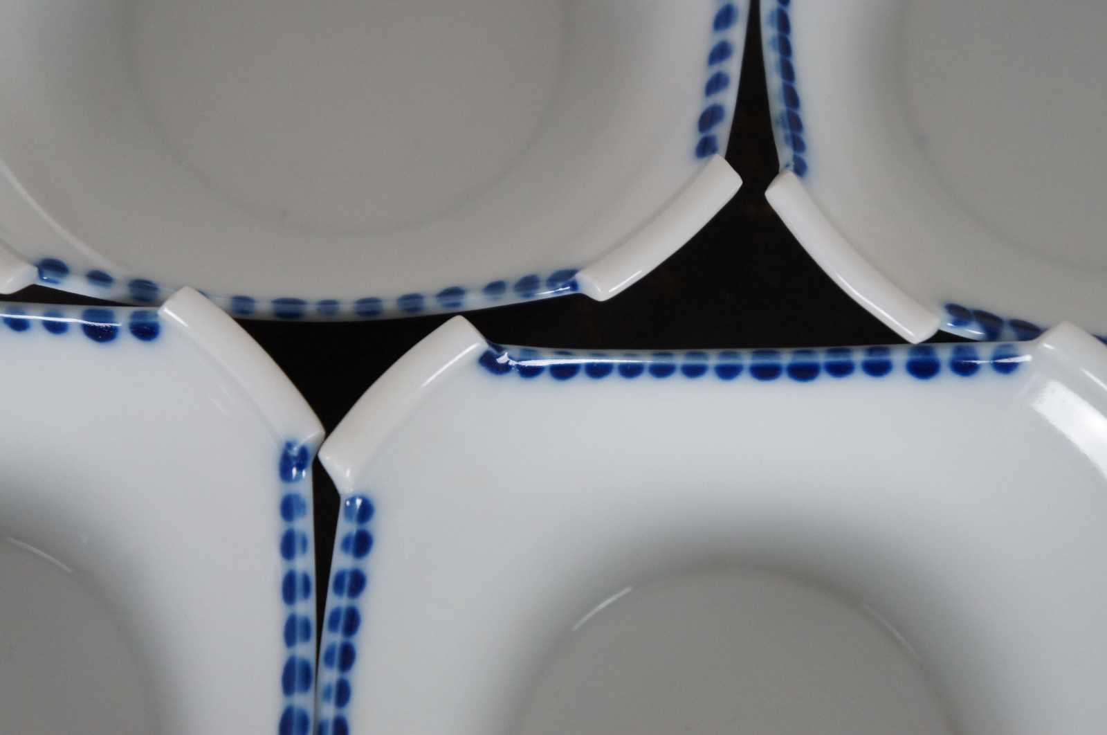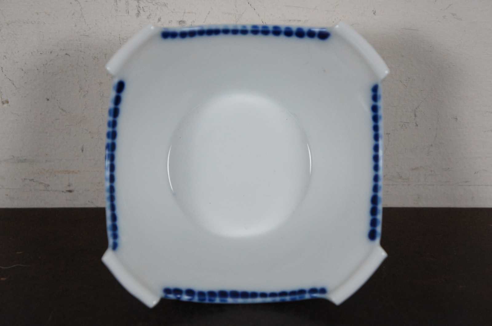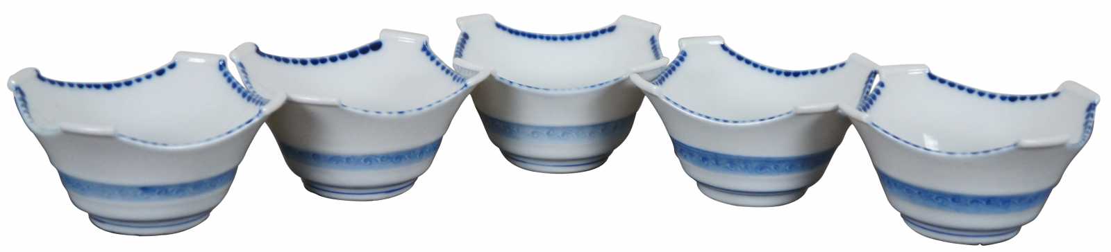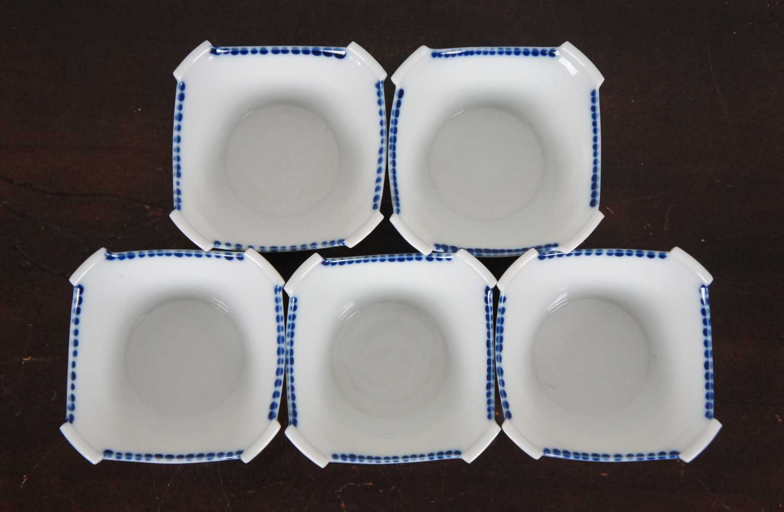 Set of five vintage Japanese porcelain square shaped rice or soup bowls with blue designs.