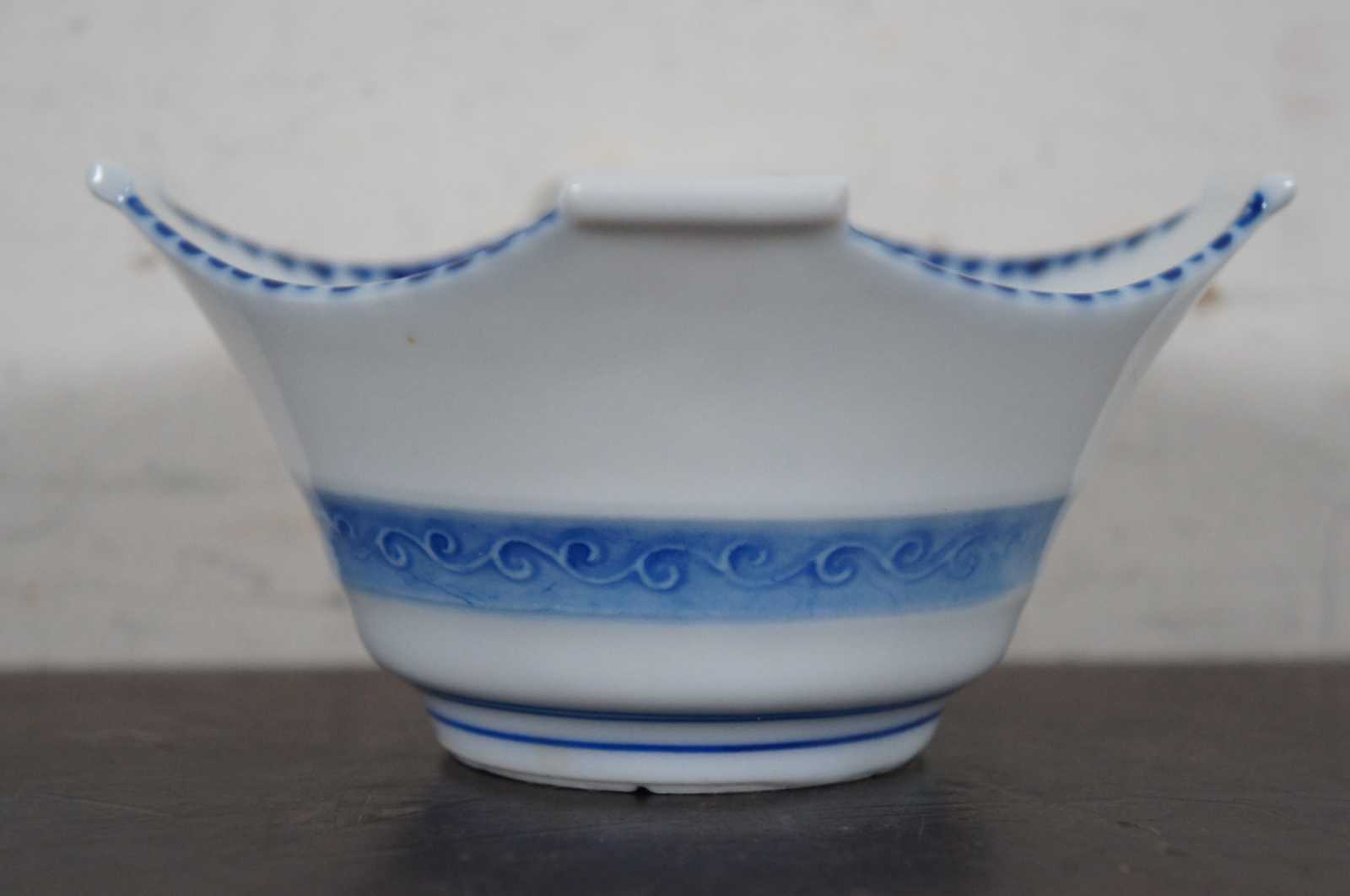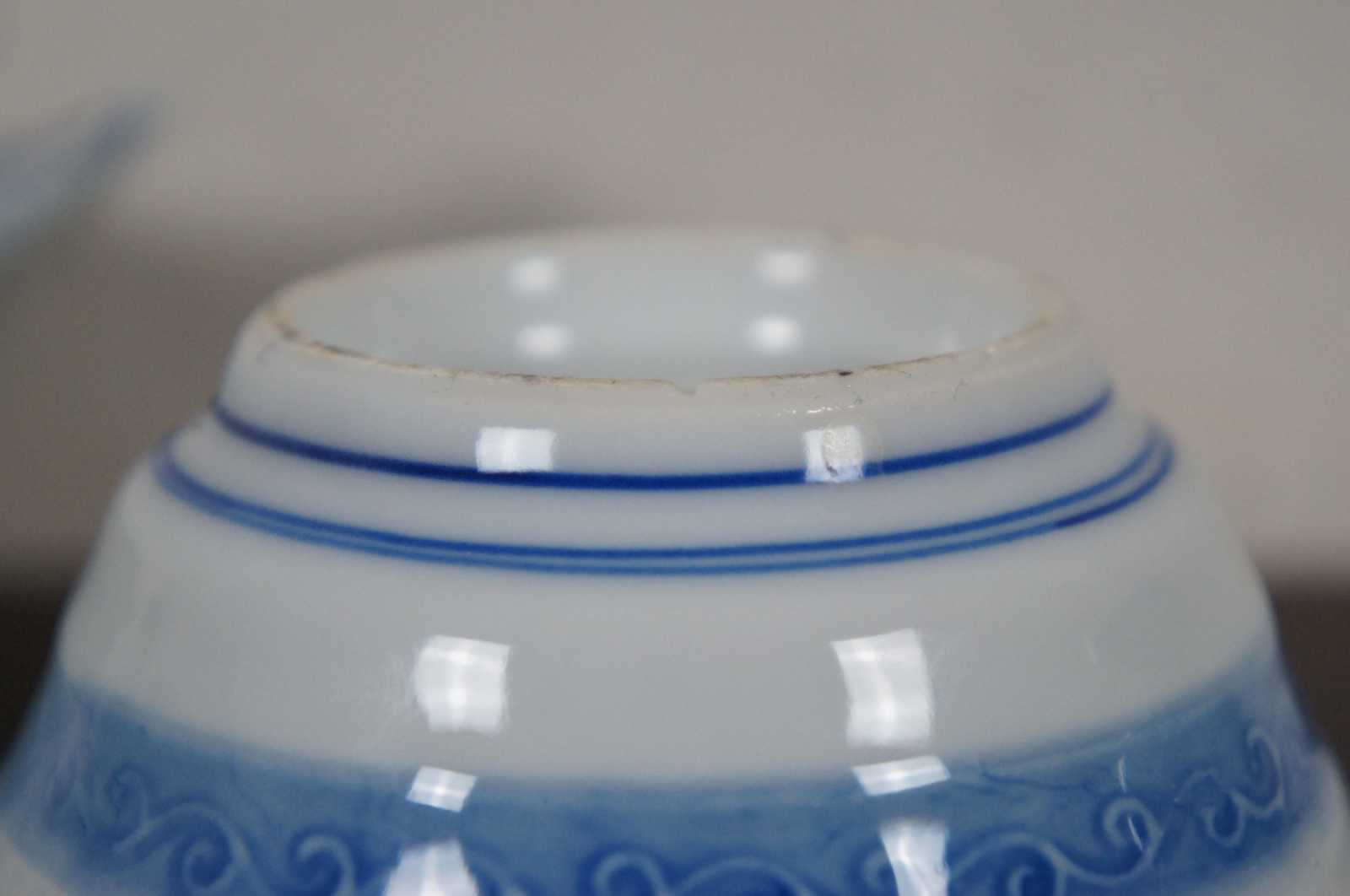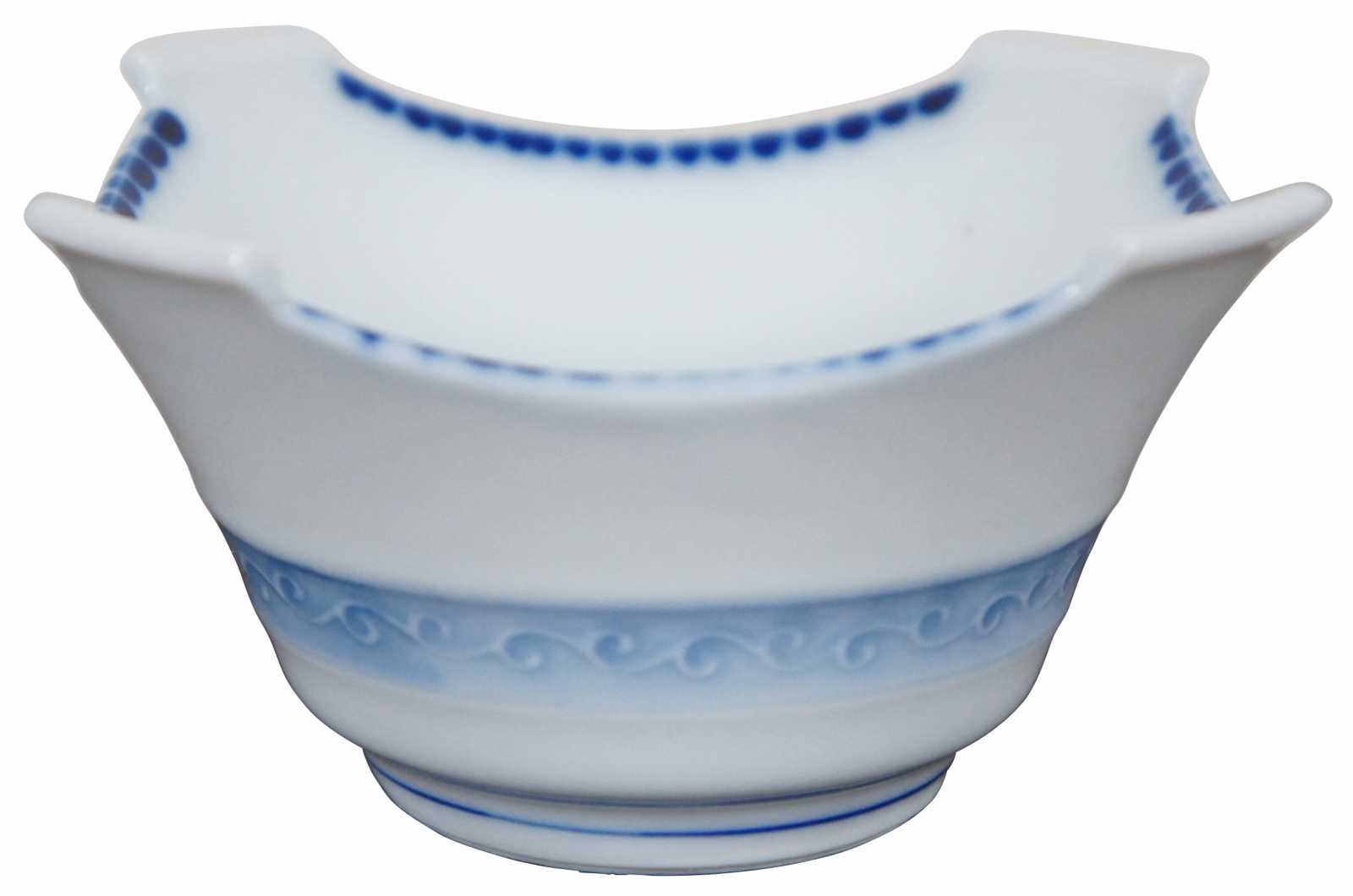 Set of five vintage Japanese porcelain square shaped rice or soup bowls with blue designs.