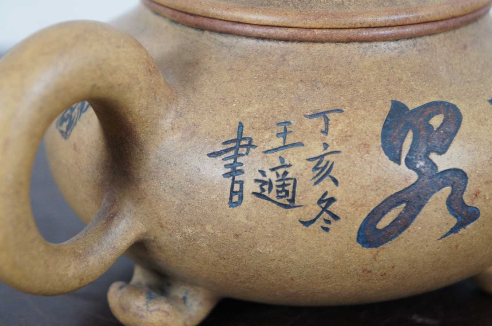 Vintage Chinese yixing zisha ceramic teapot with three feet, carved landscape and calligraphy on the sides and a lizard handle on the lid.