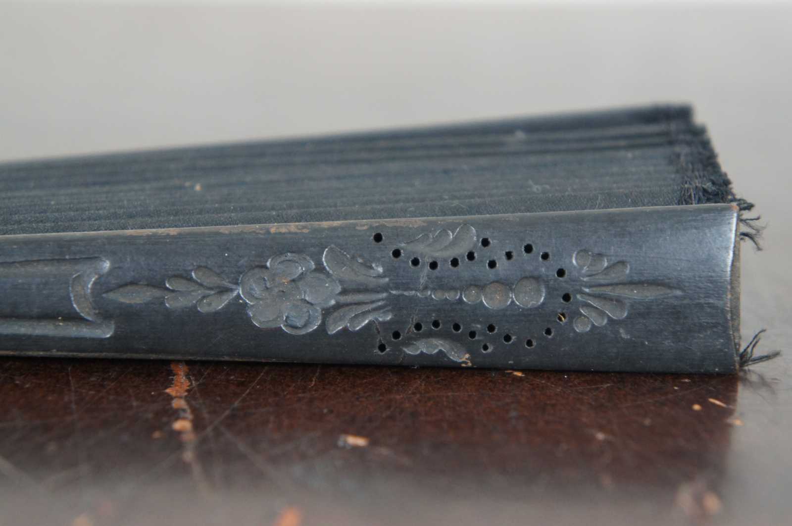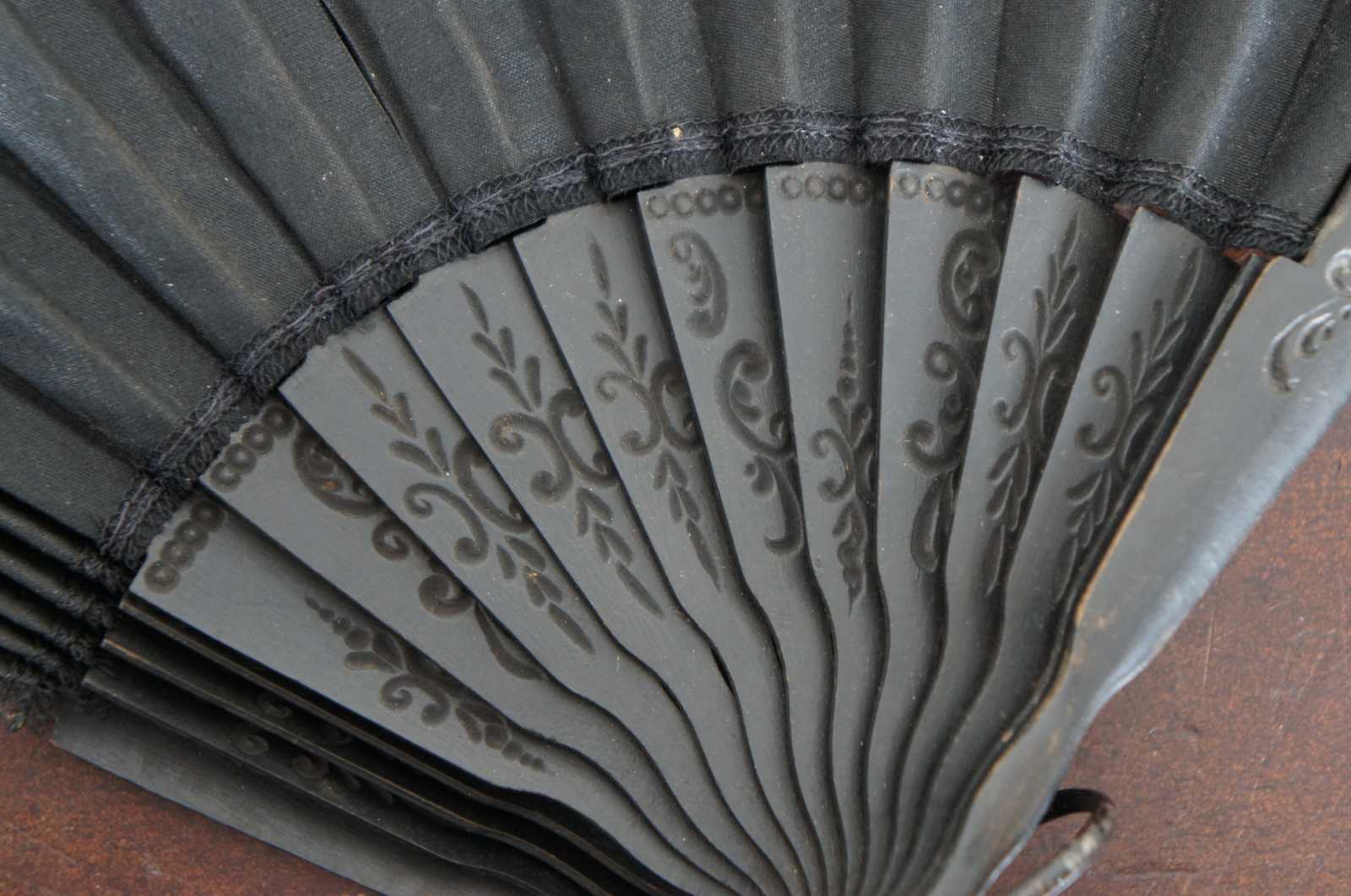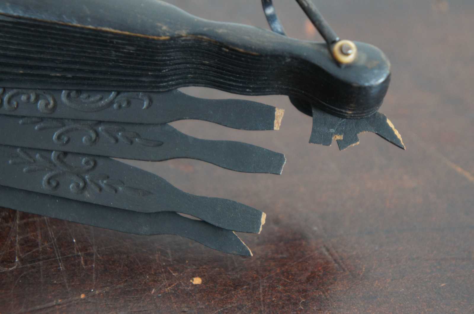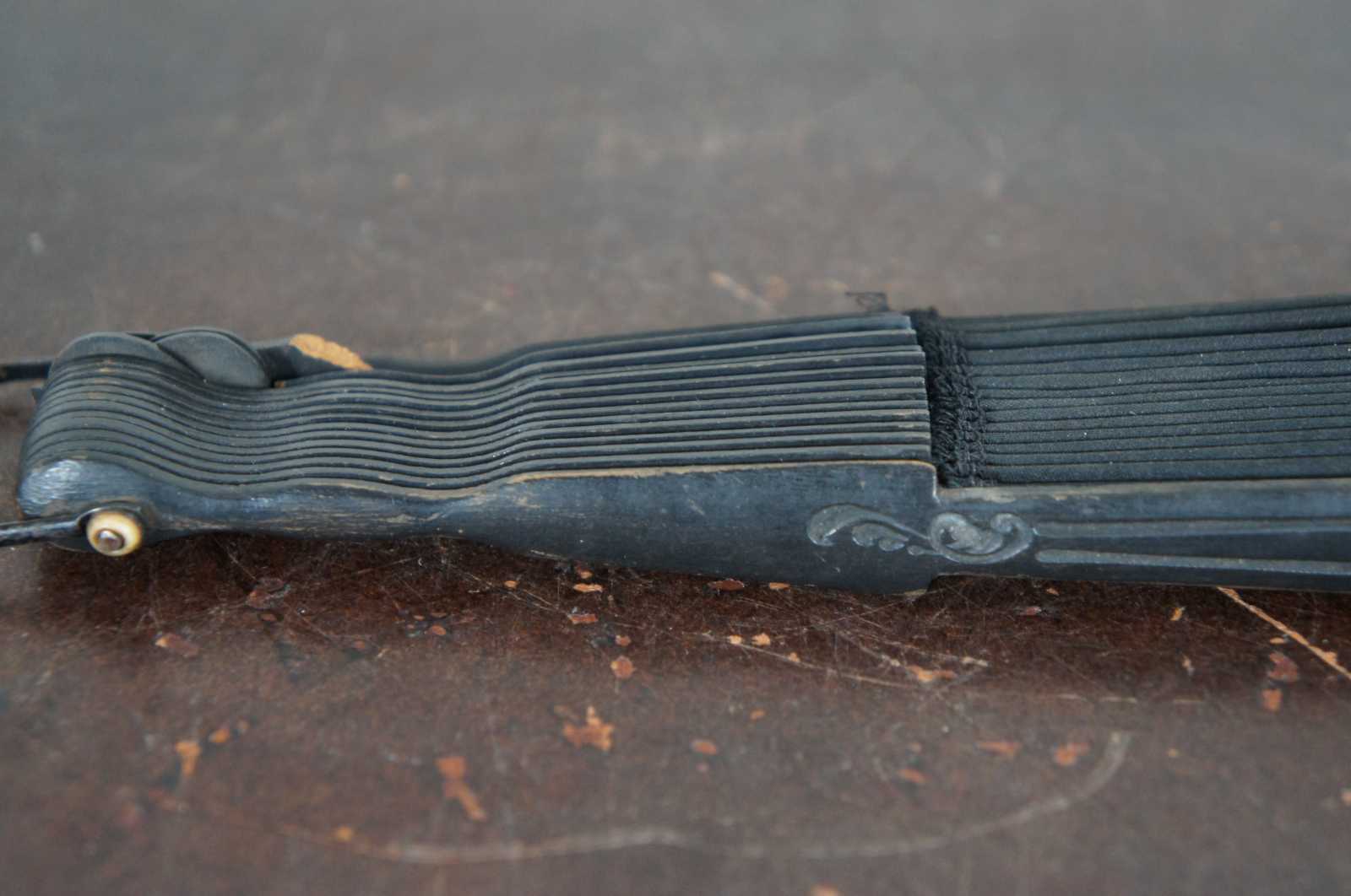 Antique Victorian folding fan with carved wood sticks and black fabric. Stored by previous owner in an empty vintage Bulova Accutron for Women box. Includes handwritten notes from the early 1860’s.