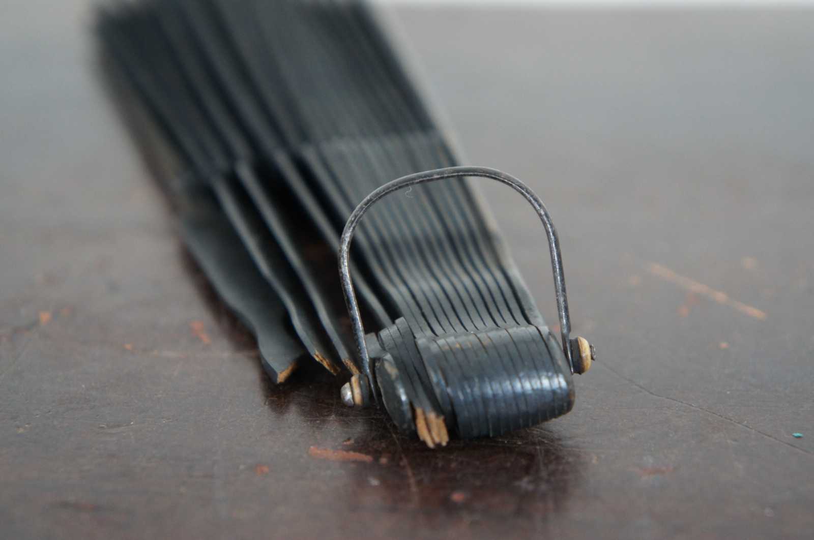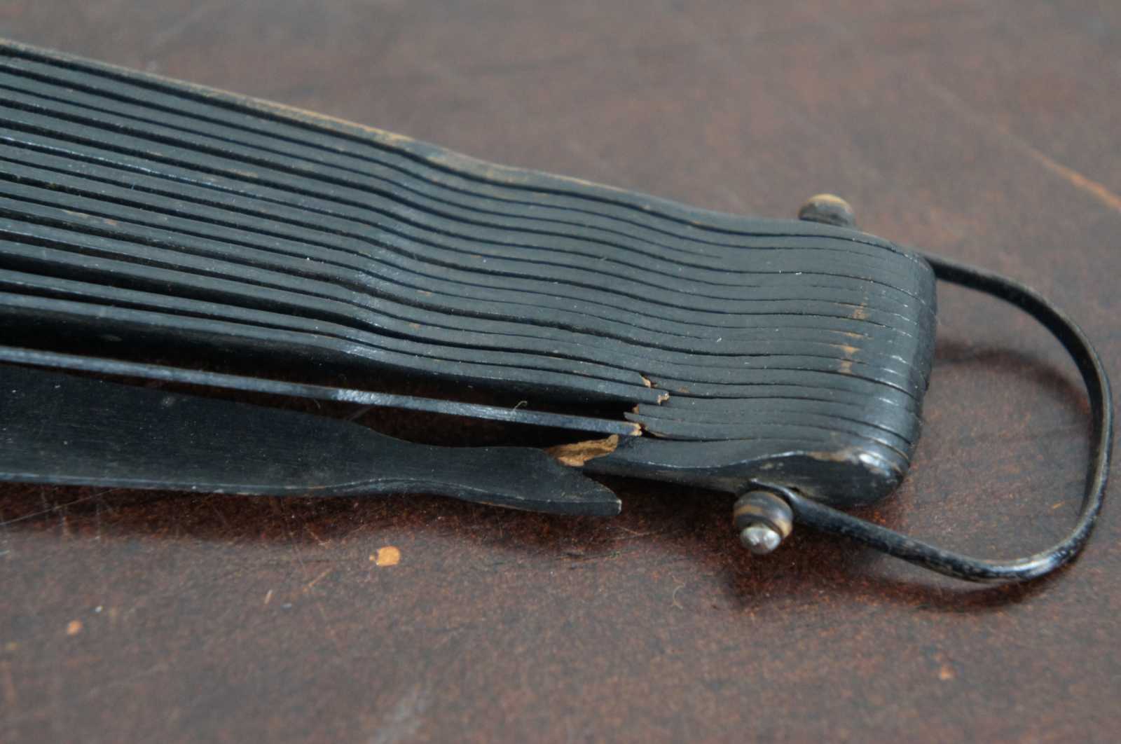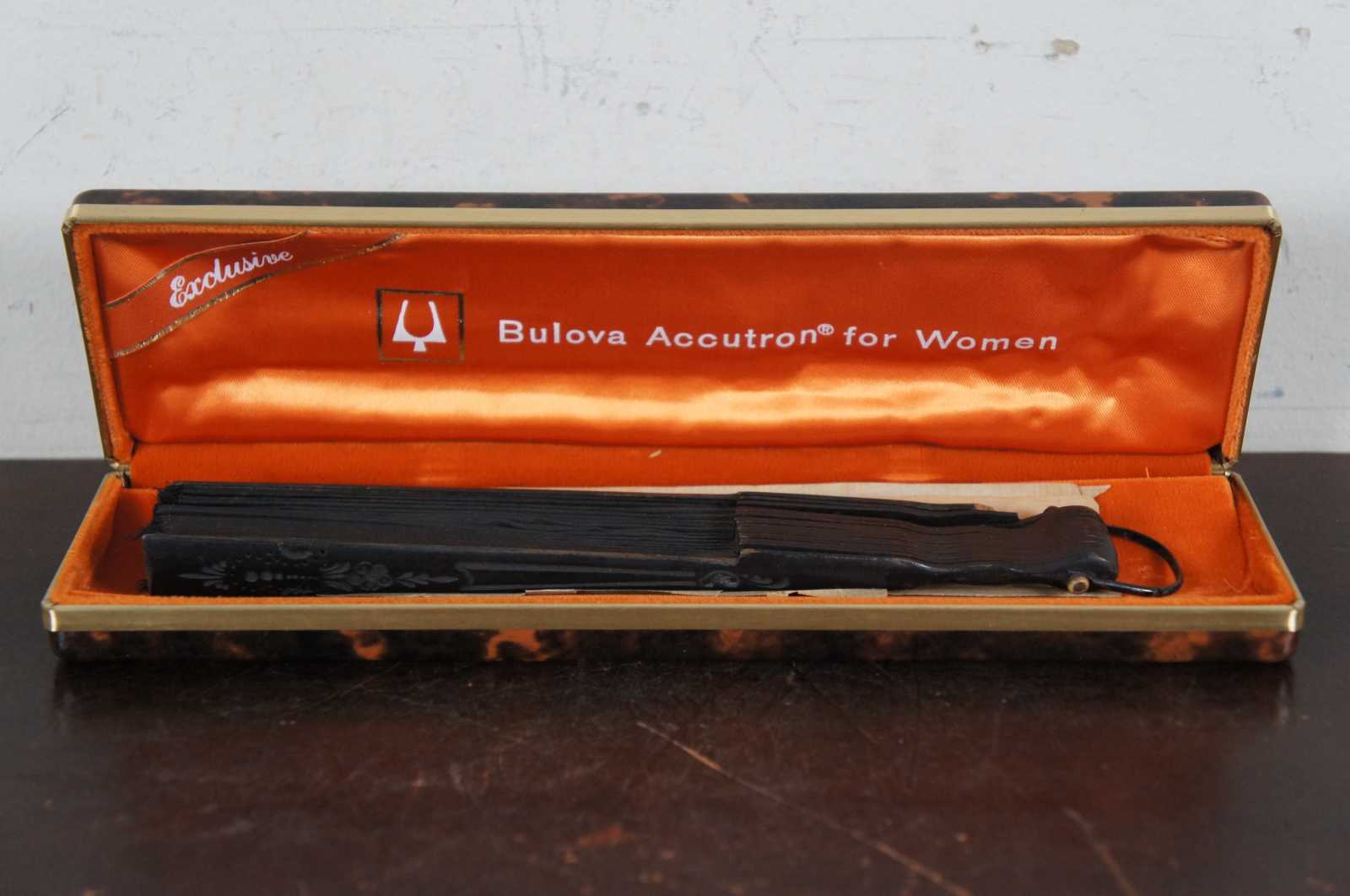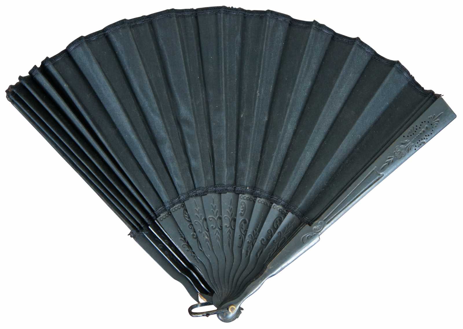 Antique Victorian folding fan with carved wood sticks and black fabric. Stored by previous owner in an empty vintage Bulova Accutron for Women box. Includes handwritten notes from the early 1860’s.