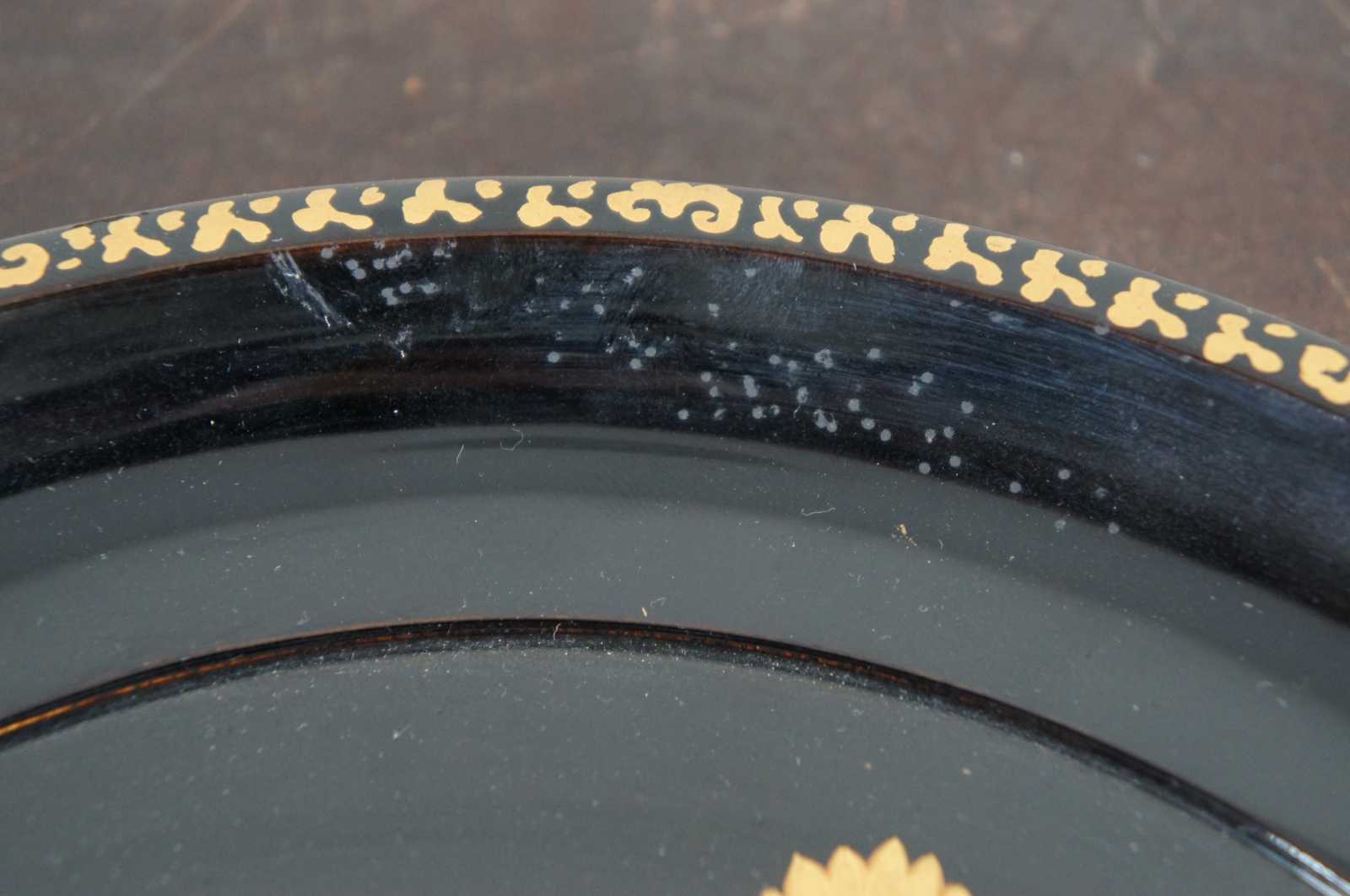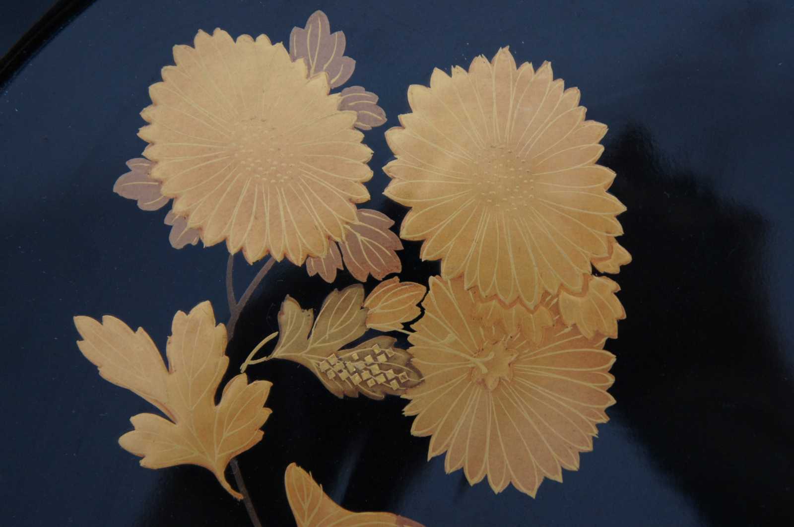 Vintage Japanese black lacquered wood and painted gold floral serving plate.