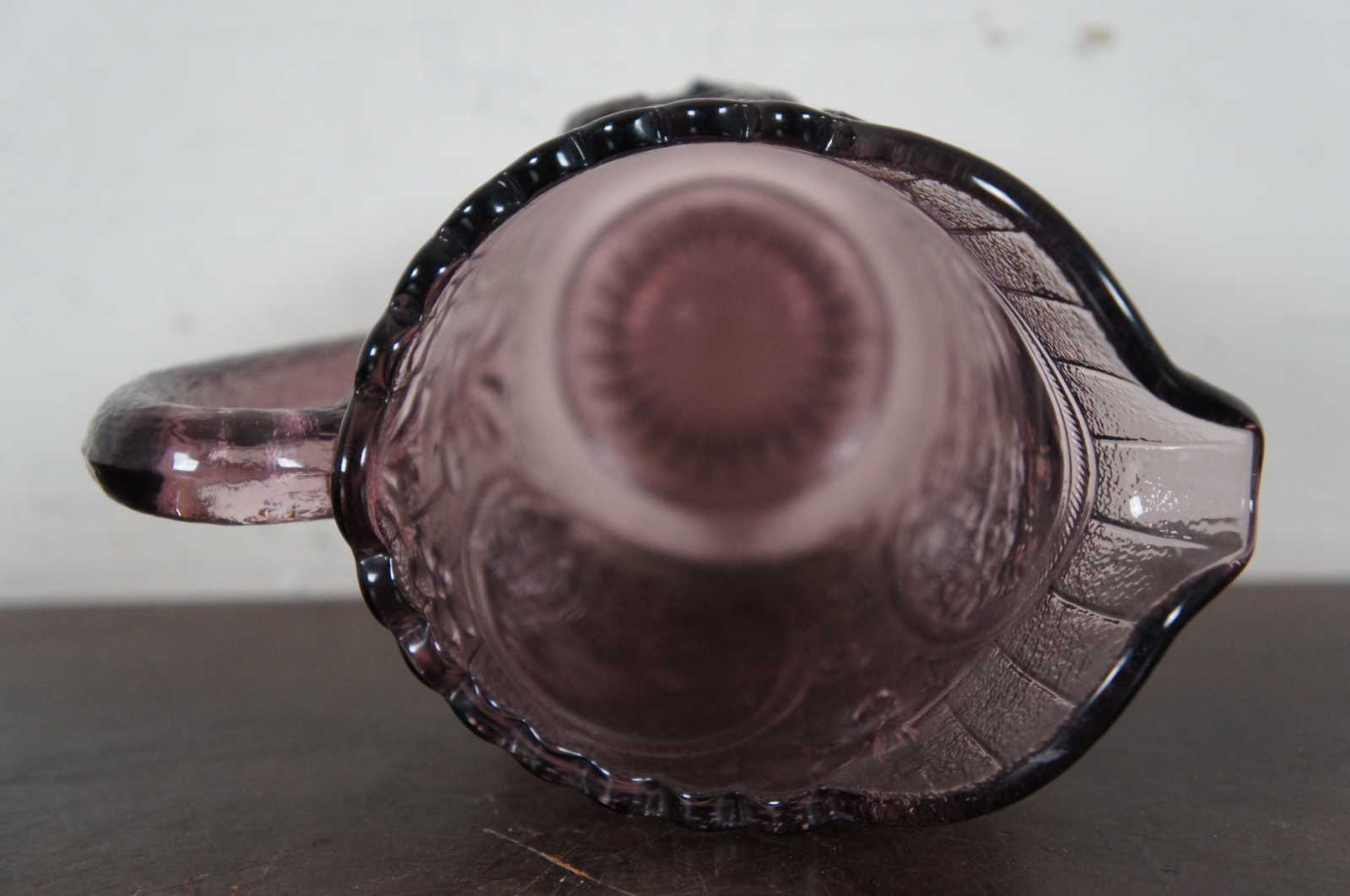 Vintage Imperial glass purple drink pitcher with pressed design of flowers, windmills and a lake landscape.