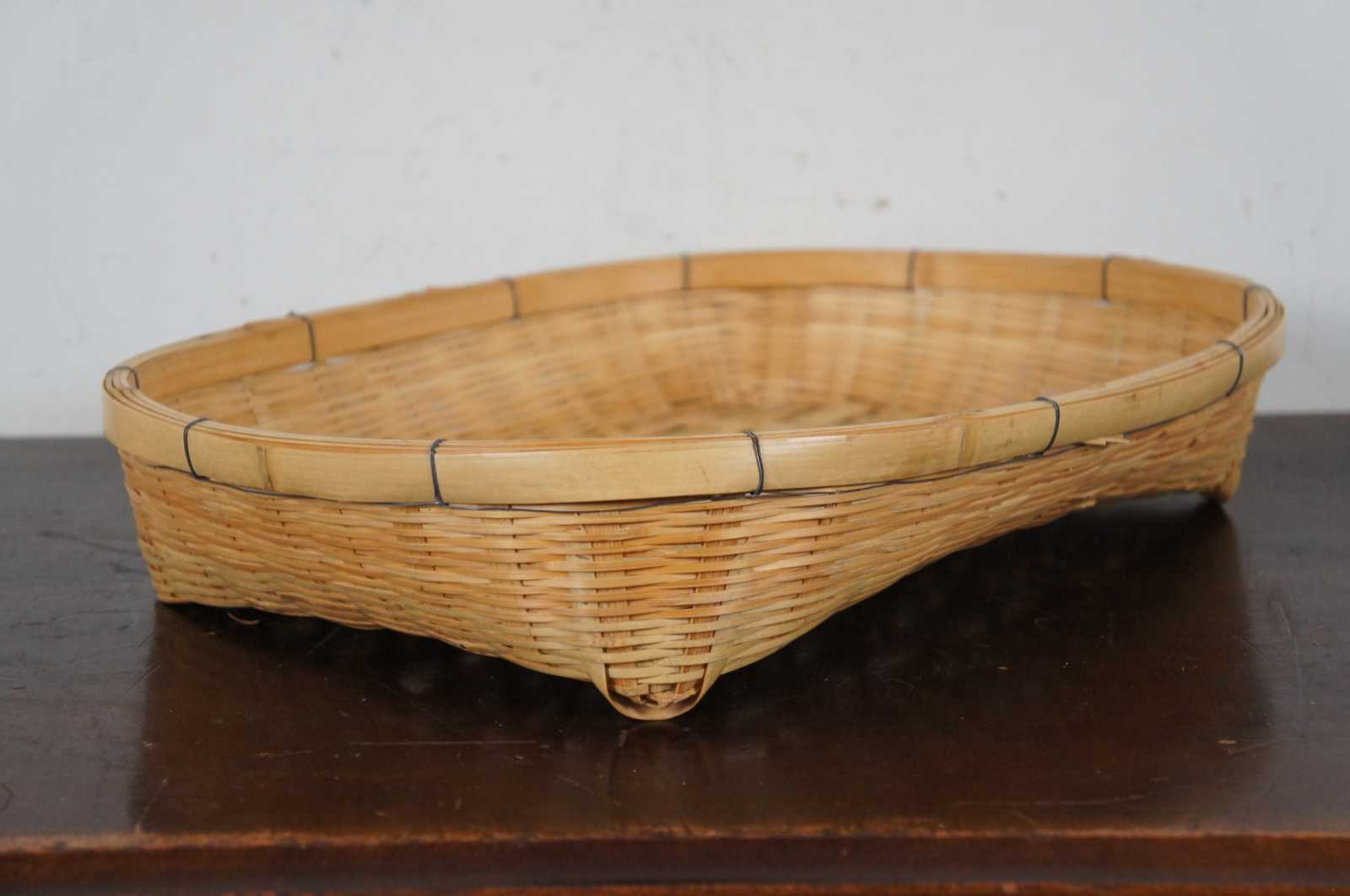 Lot of five vintage woven bamboo and wicker shallow basket trays or bowls in a variety of shapes and shades.