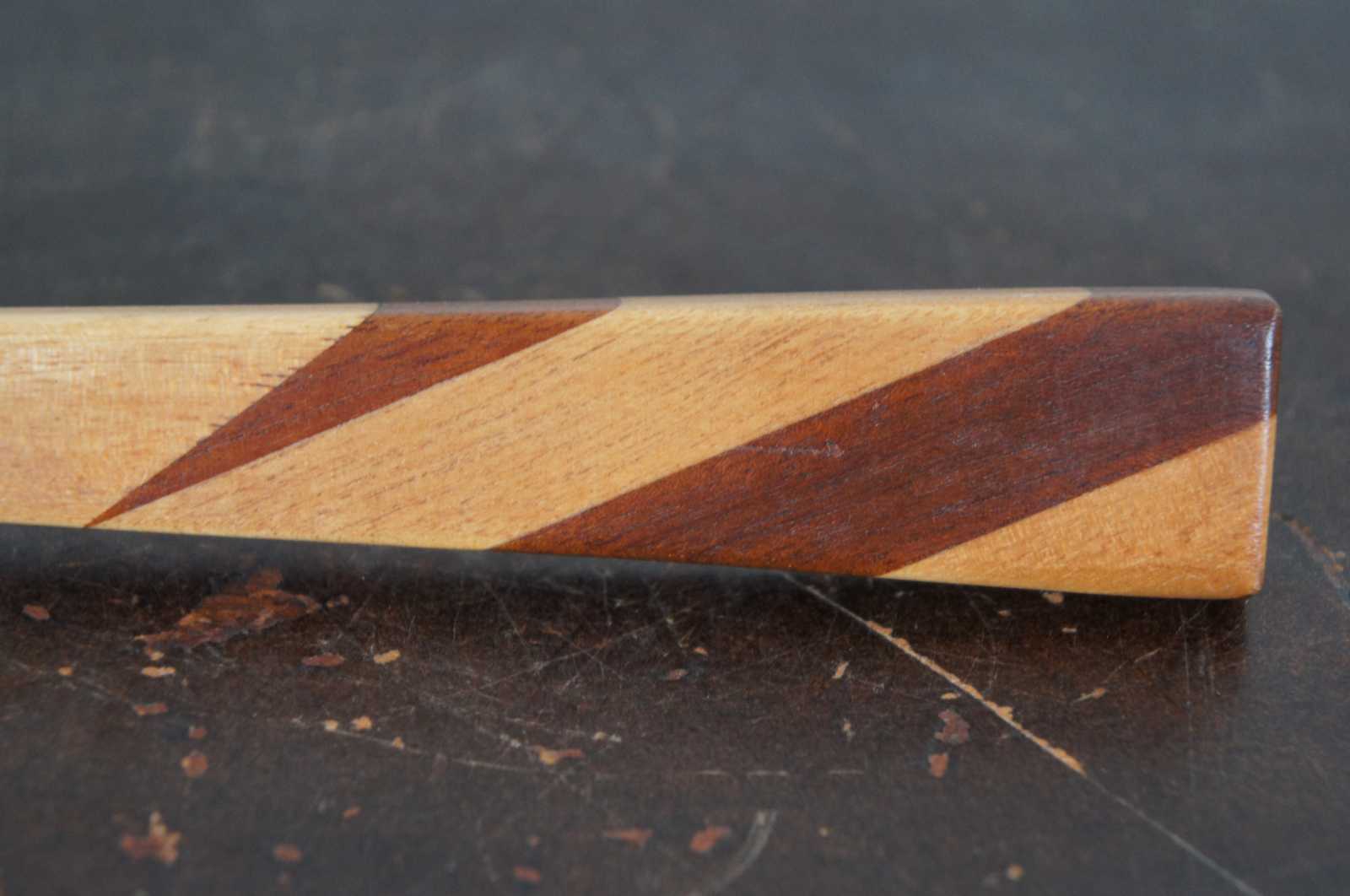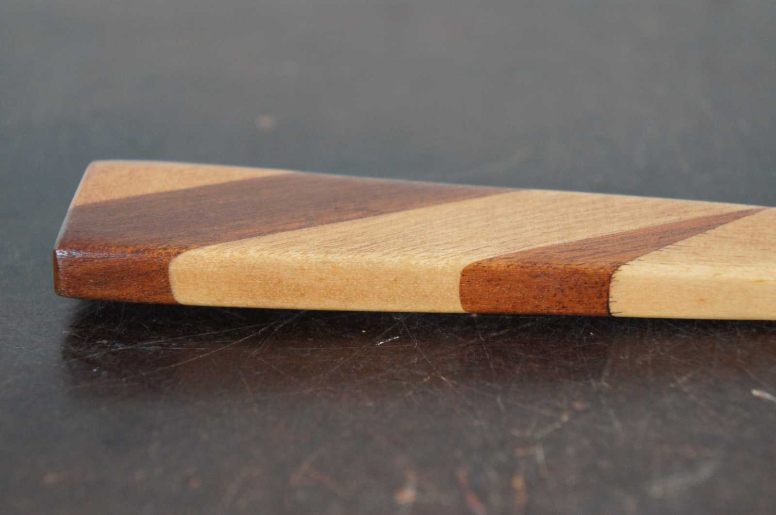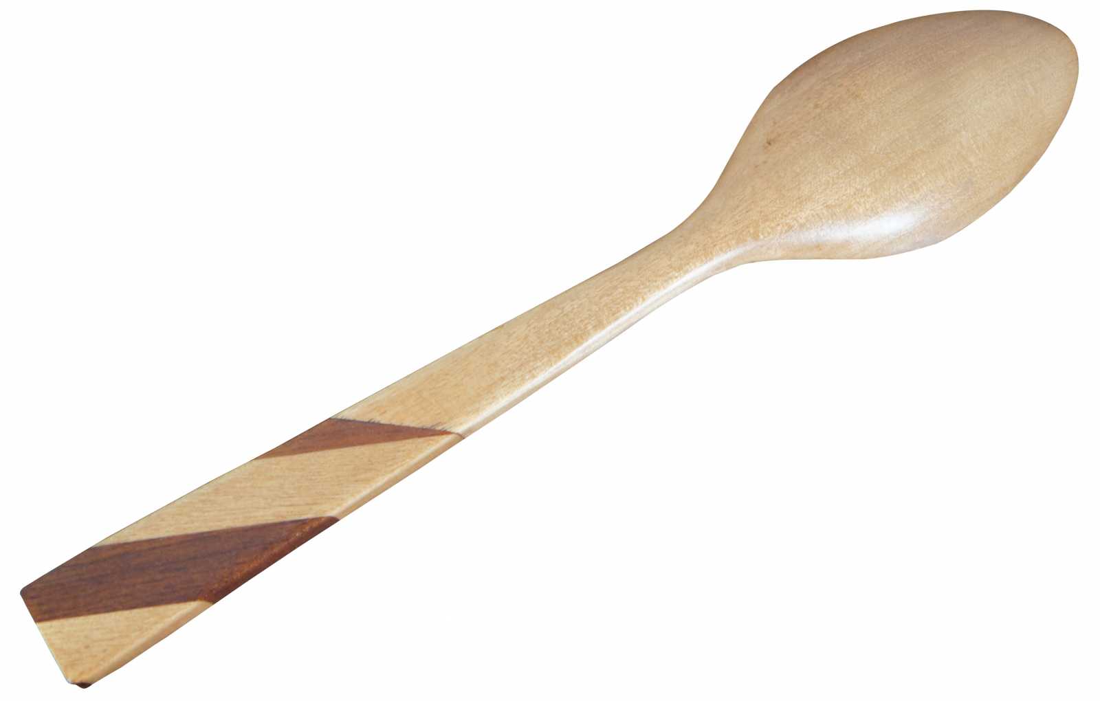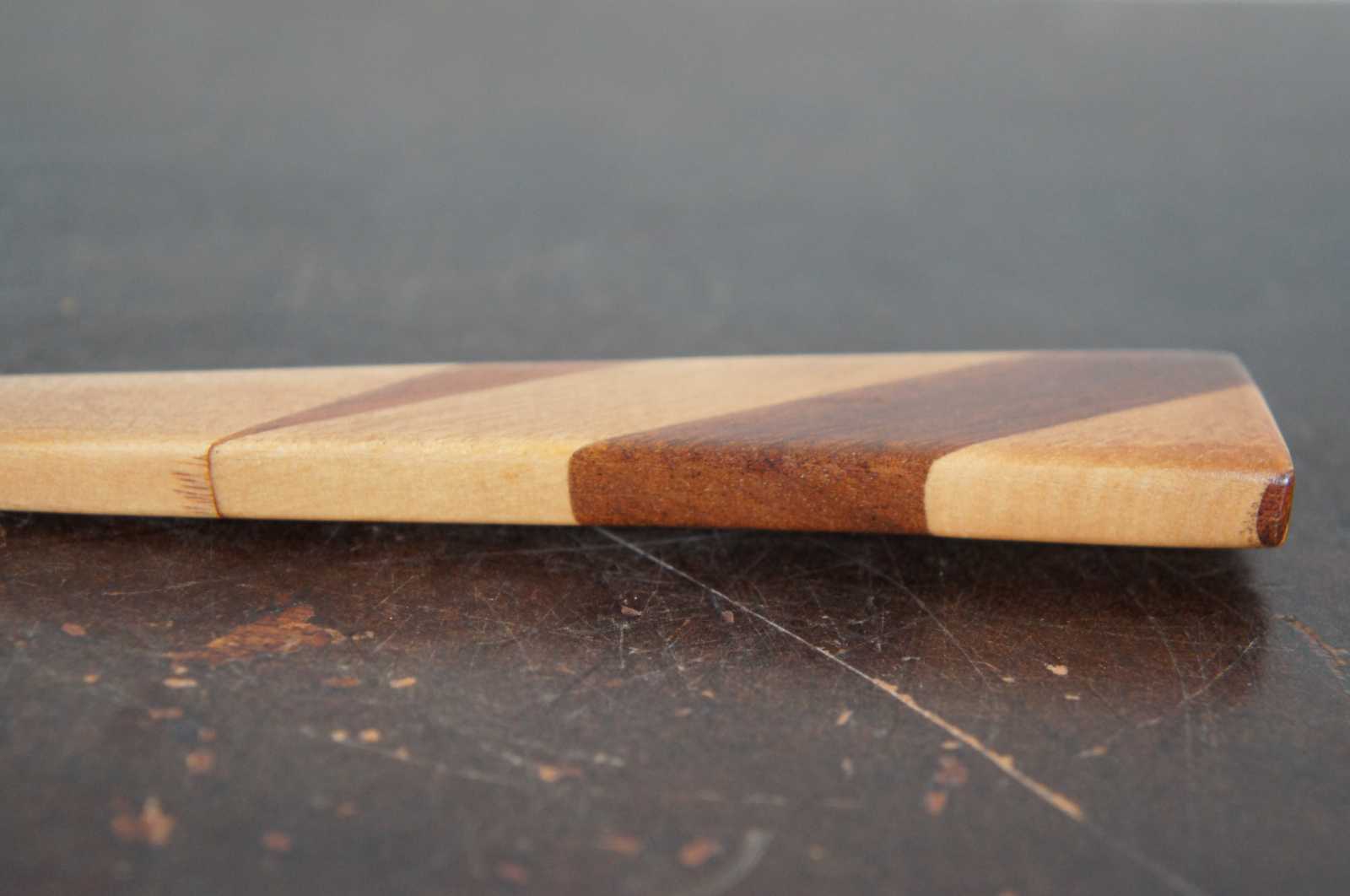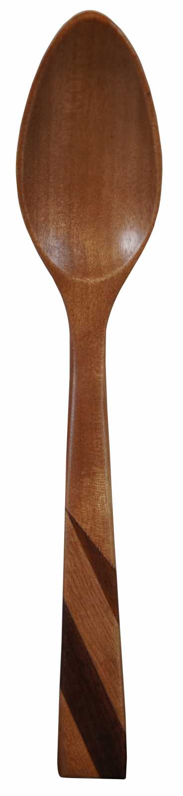 Vintage hand carved two tone wooden serving spoon with artistic diagonal bands across the handle.