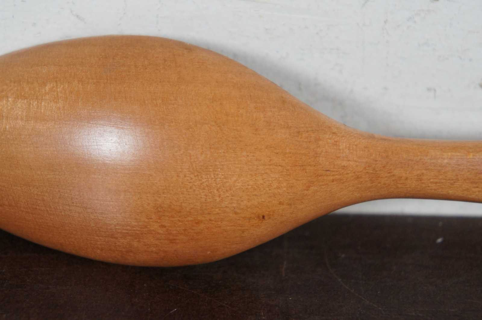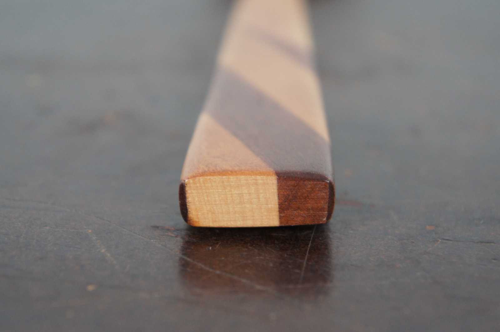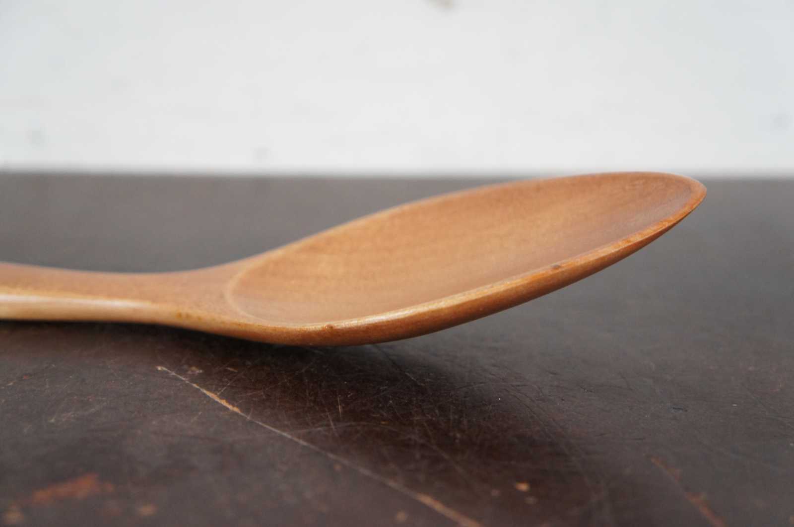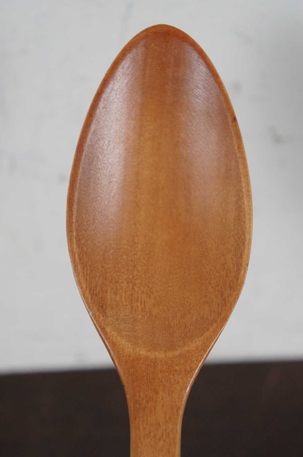 Vintage hand carved two tone wooden serving spoon with artistic diagonal bands across the handle.