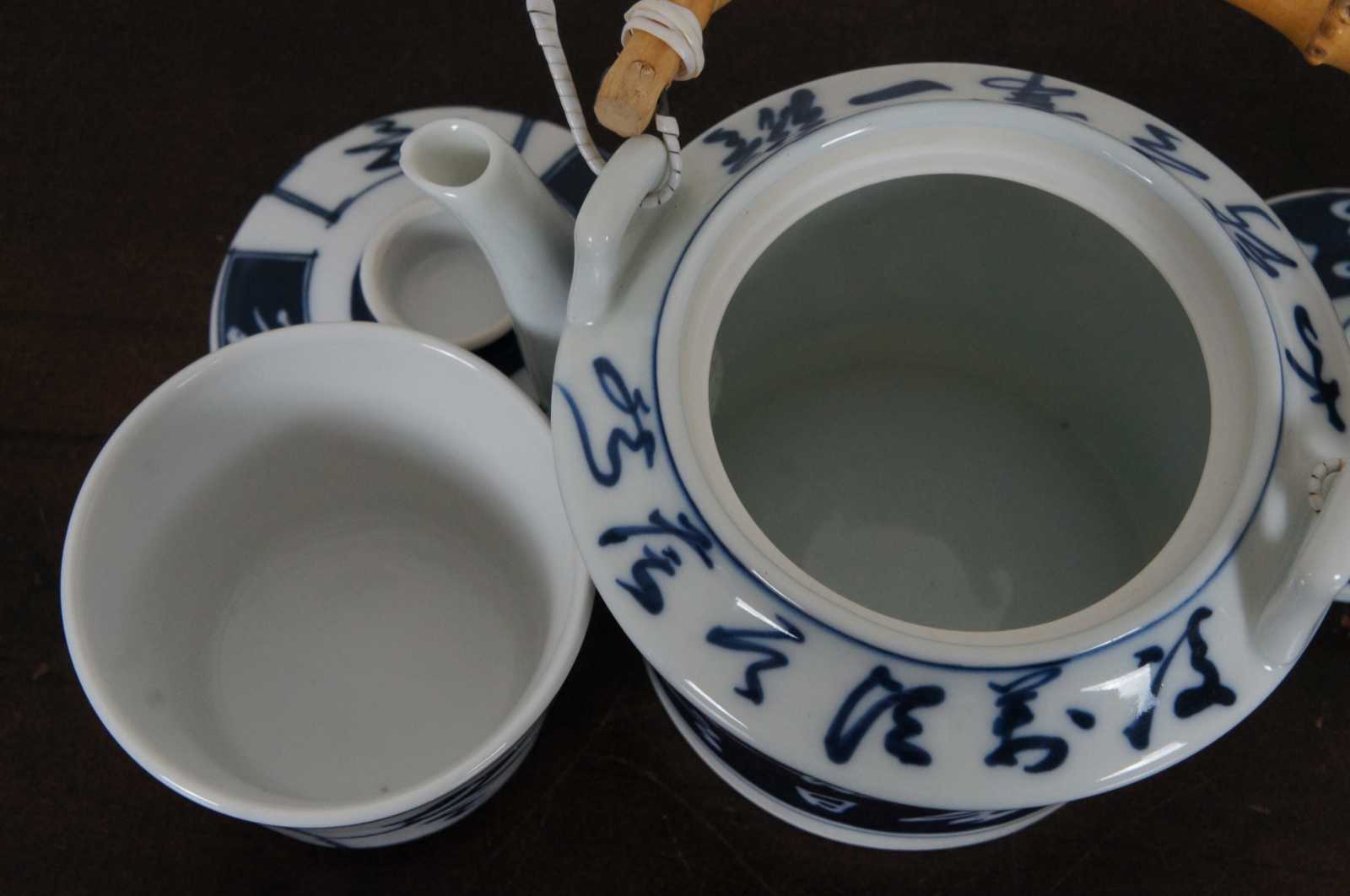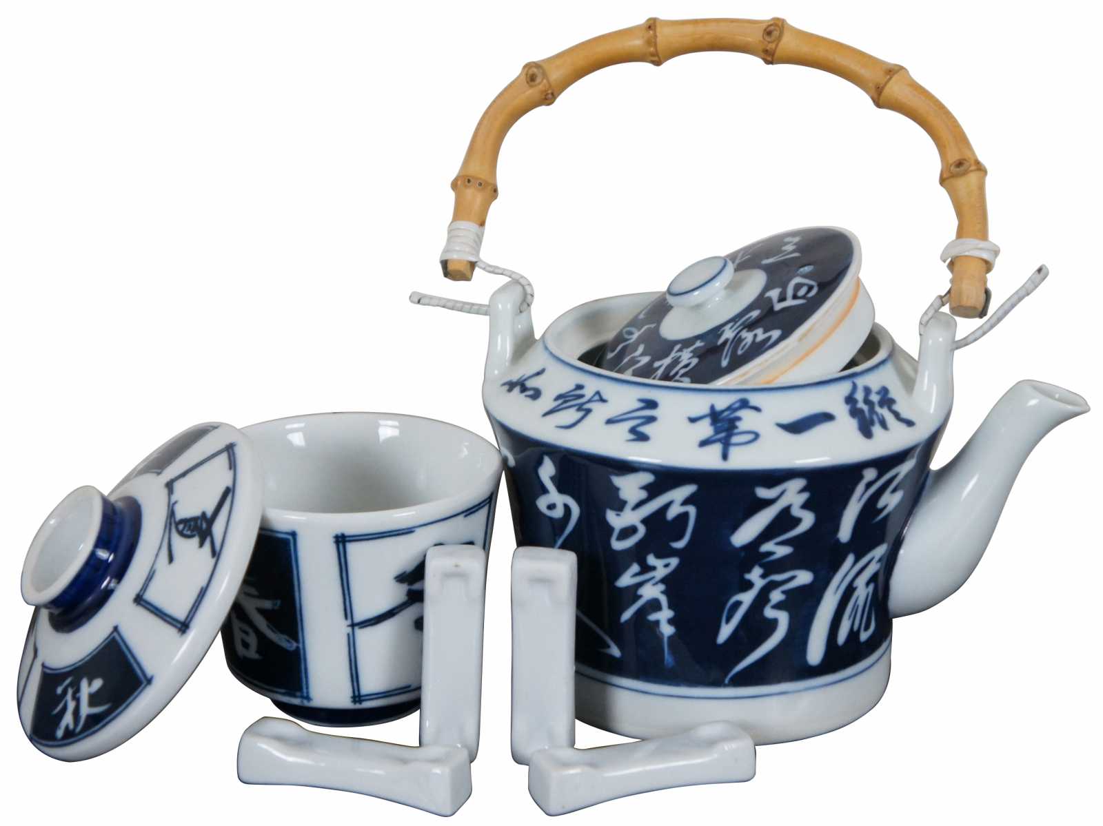 Vintage blue and white Japanese calligraphy decorated set of porcelain – a teapot with bamboo handle, a lidded miso or rice bowl and four plain chopstick or spoon rests.