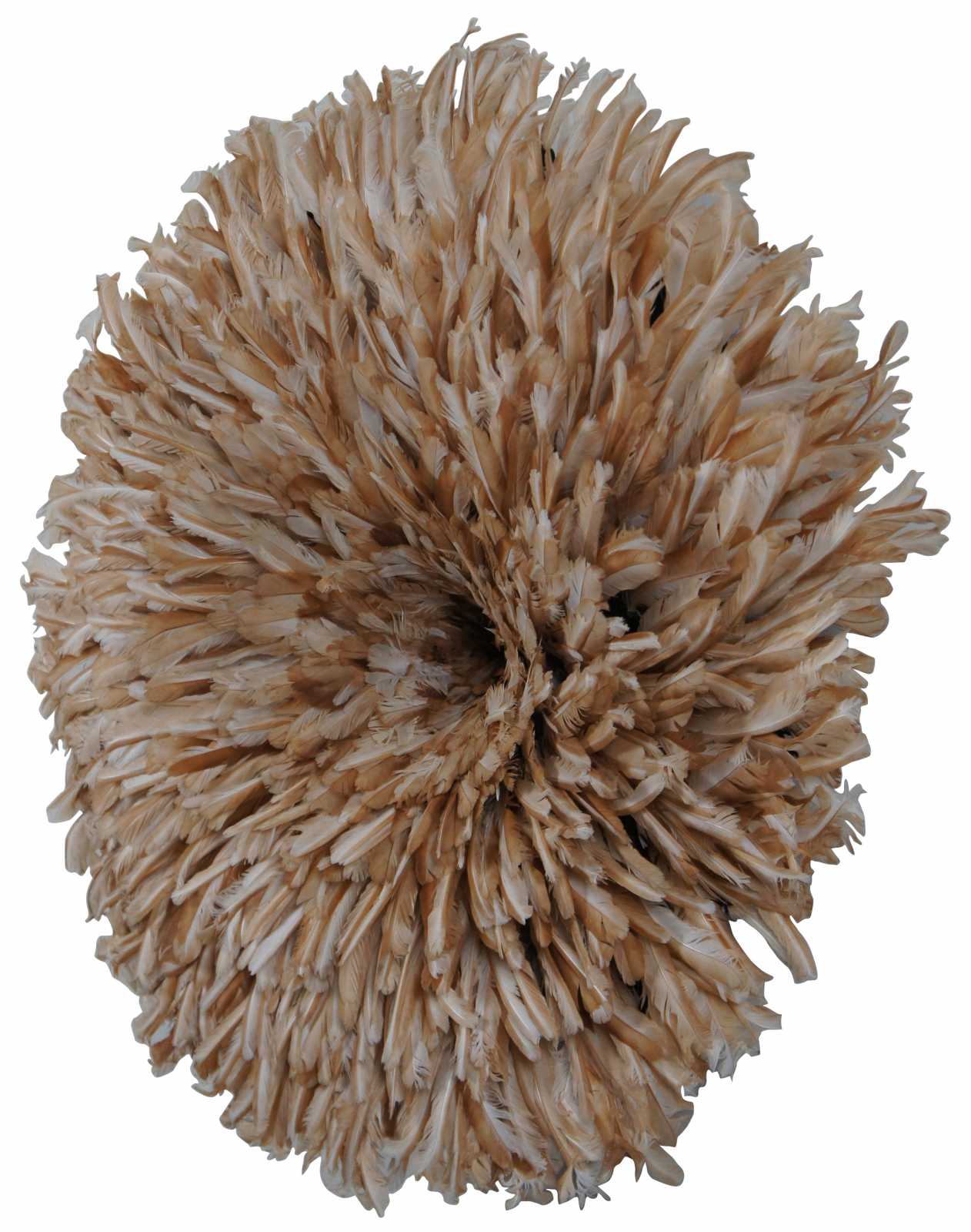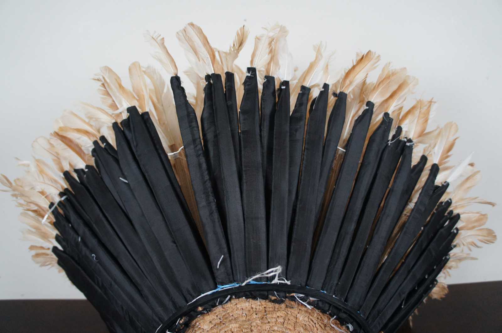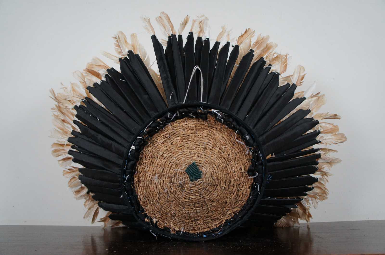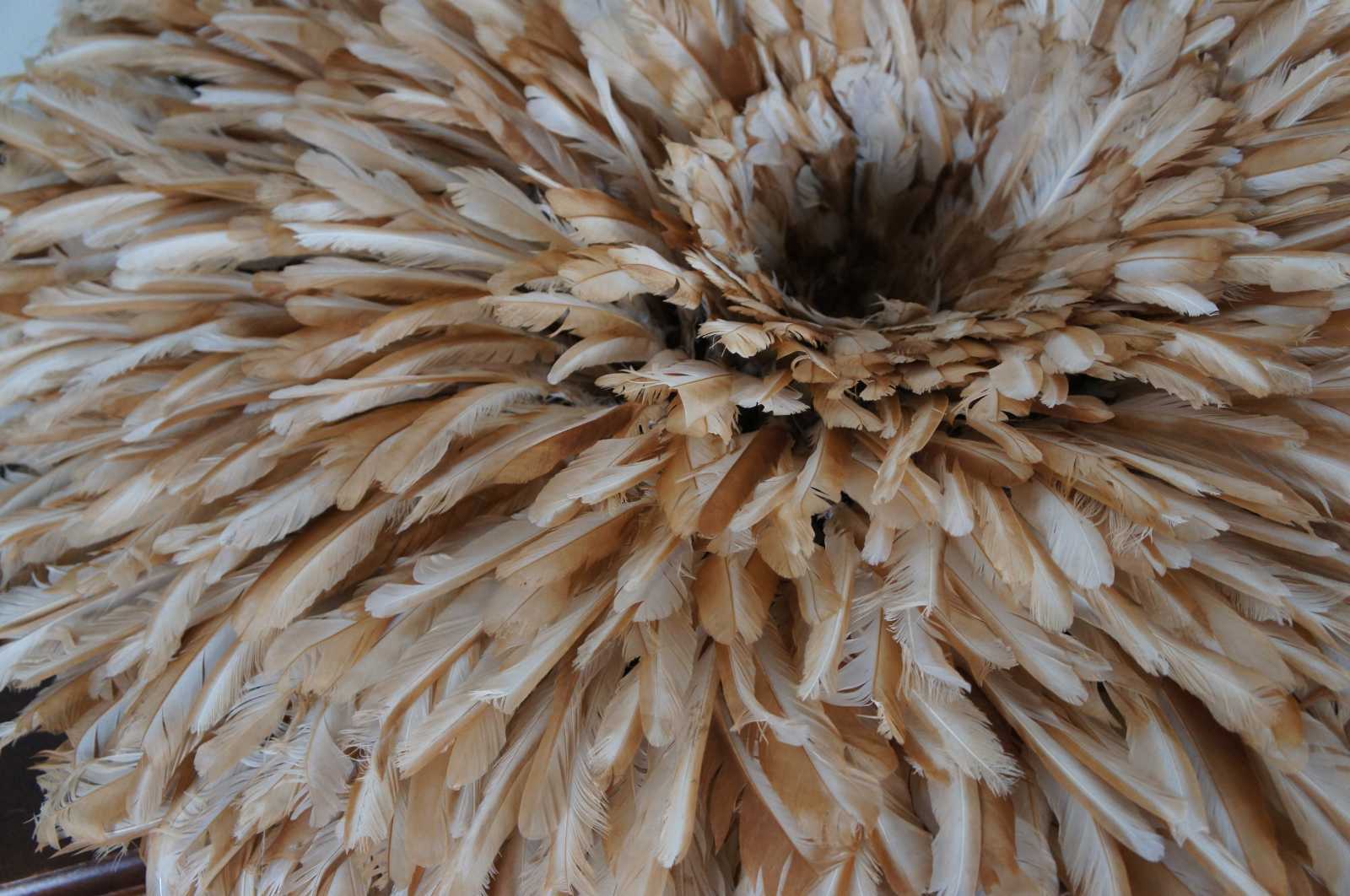 Vintage handmade African Juju feather hat, made of brown and white feathers.