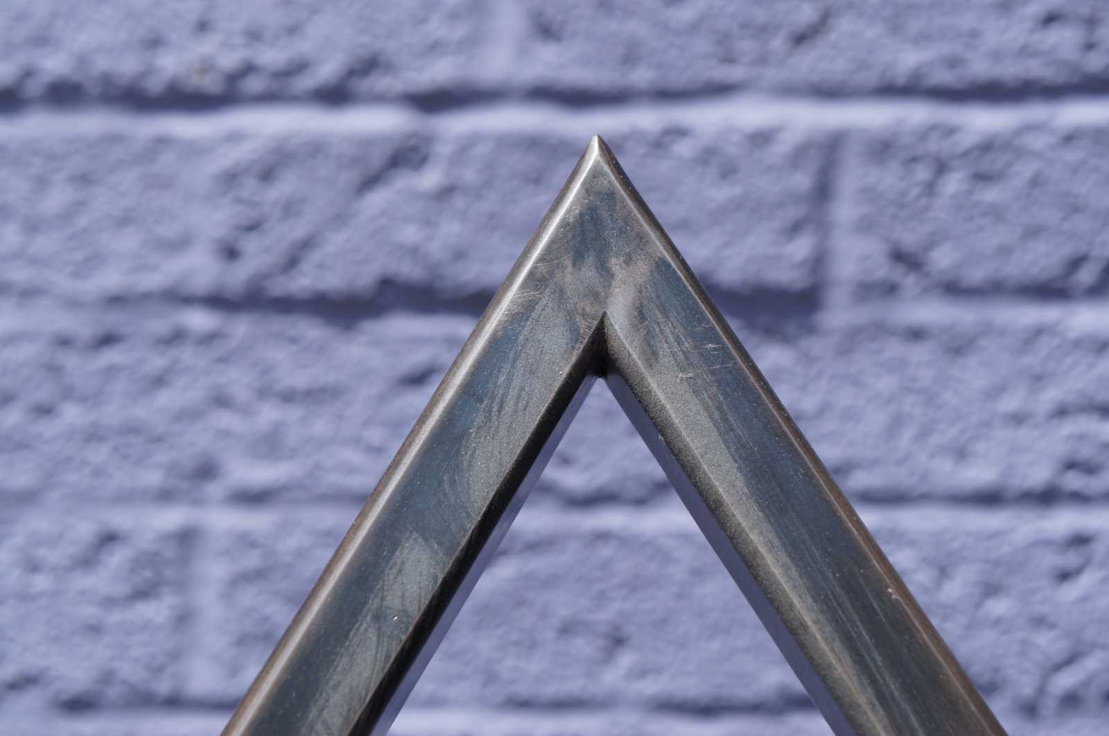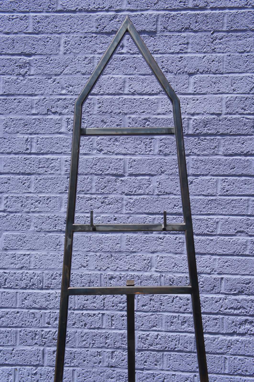 Black metal obelisk shaped display stand with two easel shelves for displaying multiple pieces of art.