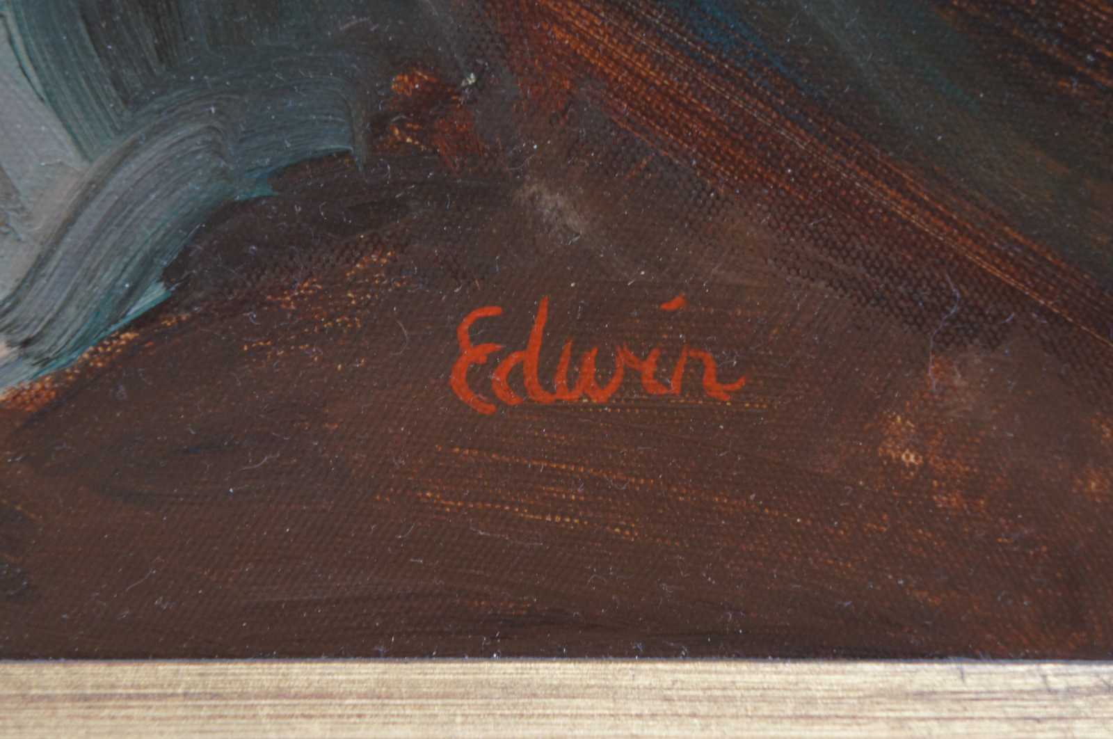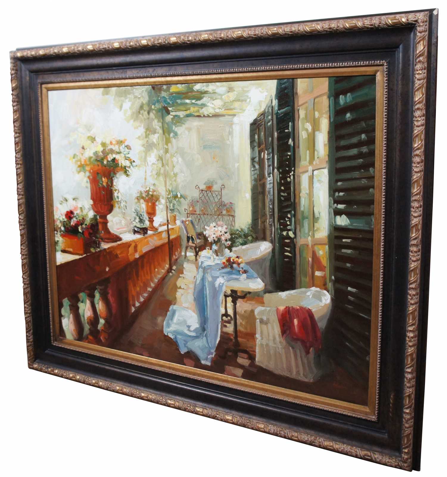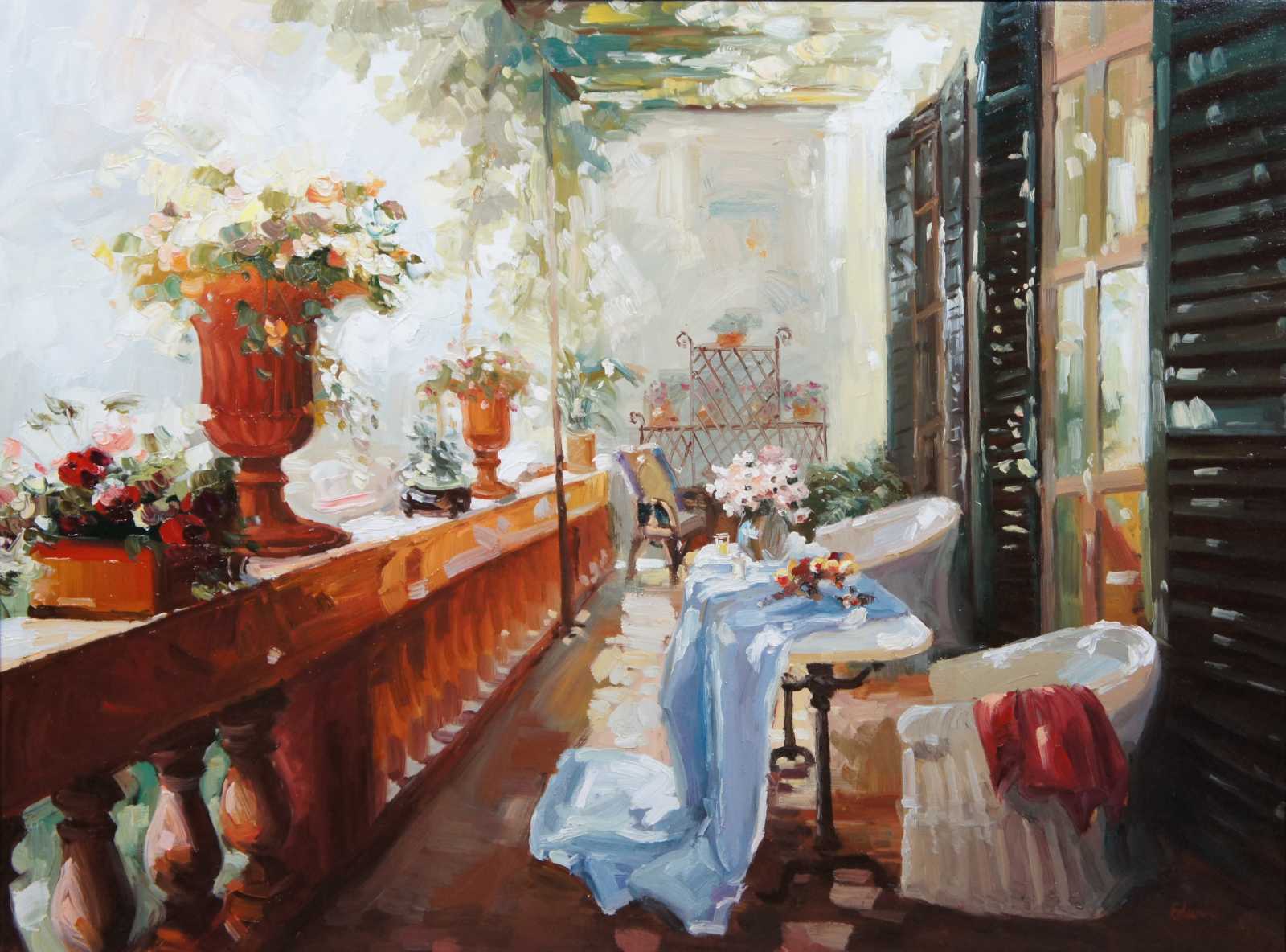 Signed impressionist style oil on canvas painting of an elegant patio or balcony, signed Edwin in lower corner.