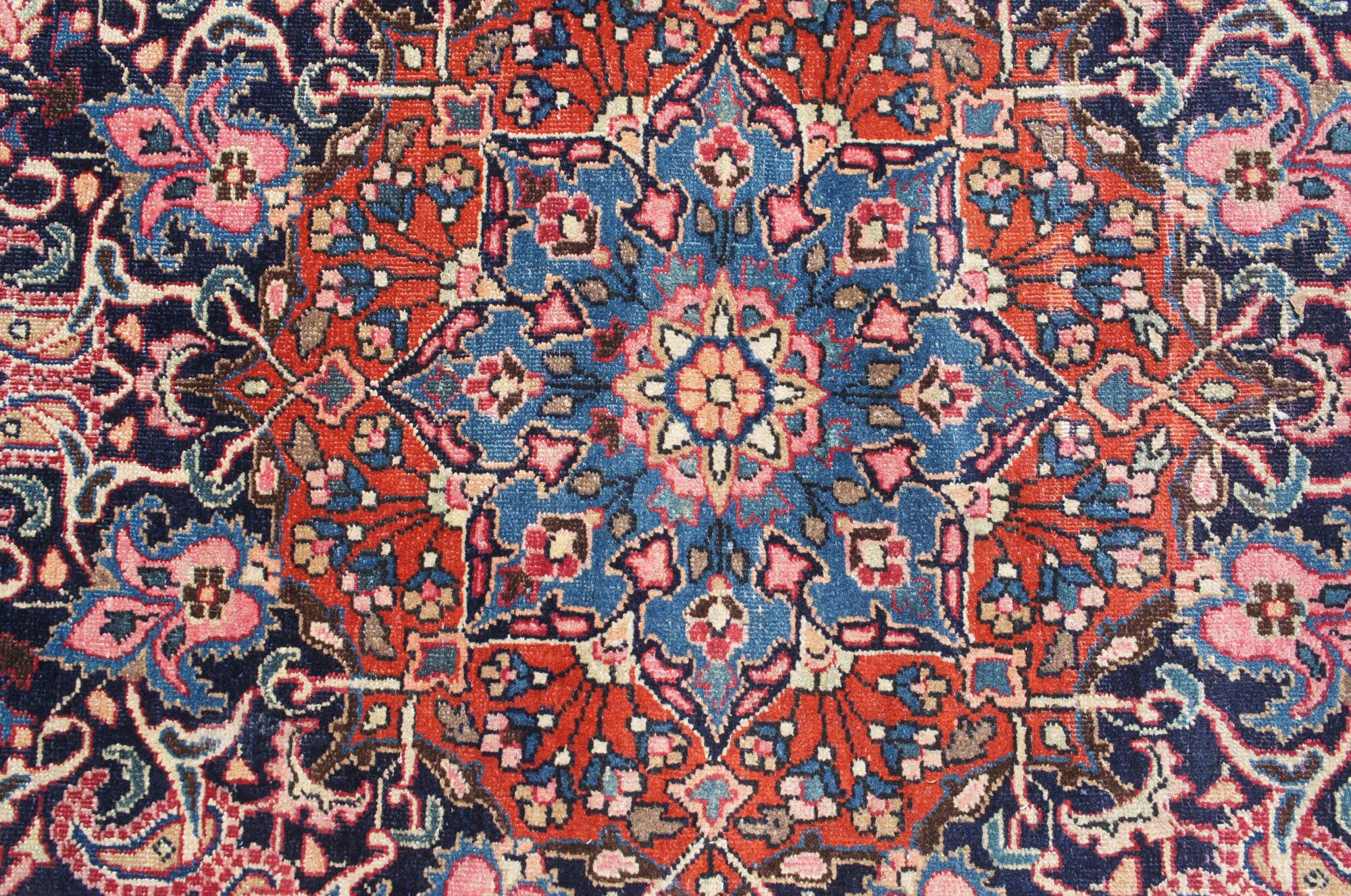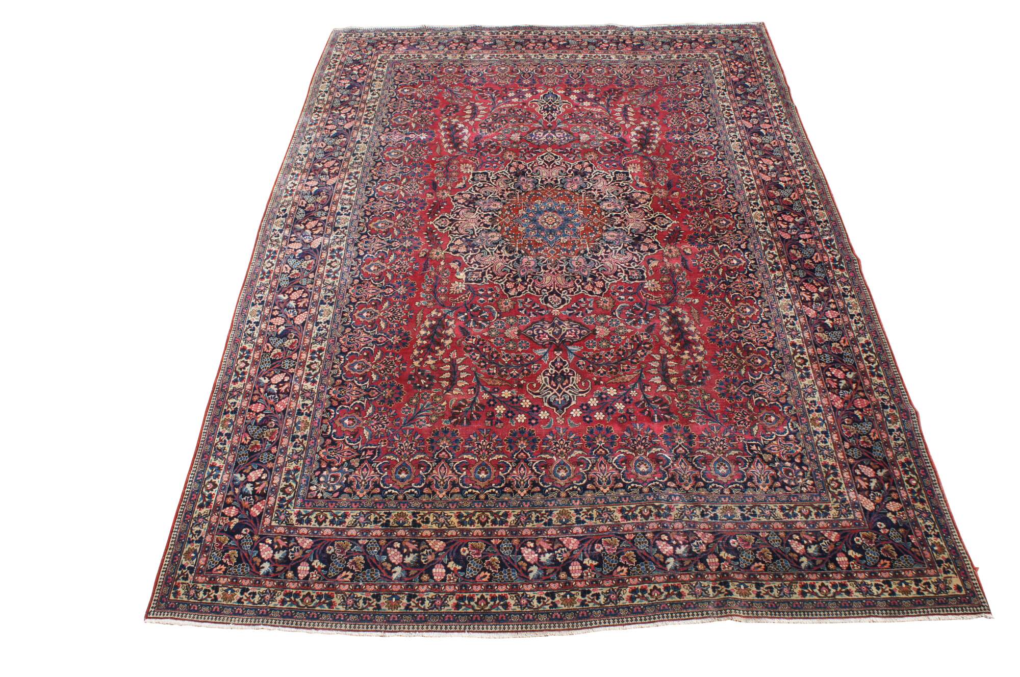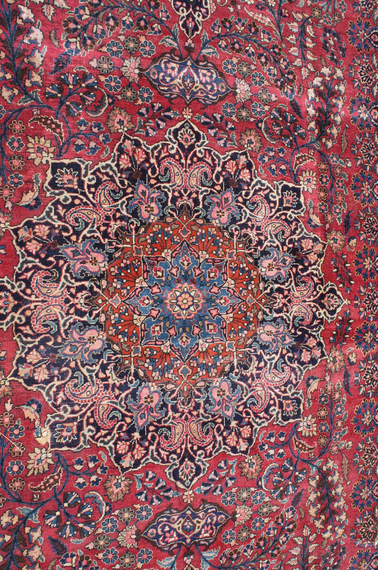 A classic old oriental rug. Features a tight weave in fine soft wool with deep red and dark blue colors. The carpet has a brilliant central medallion and is accented my meticulous floral sprays and a layered border with grape vine motif. 144kpsi (knots per square inch)