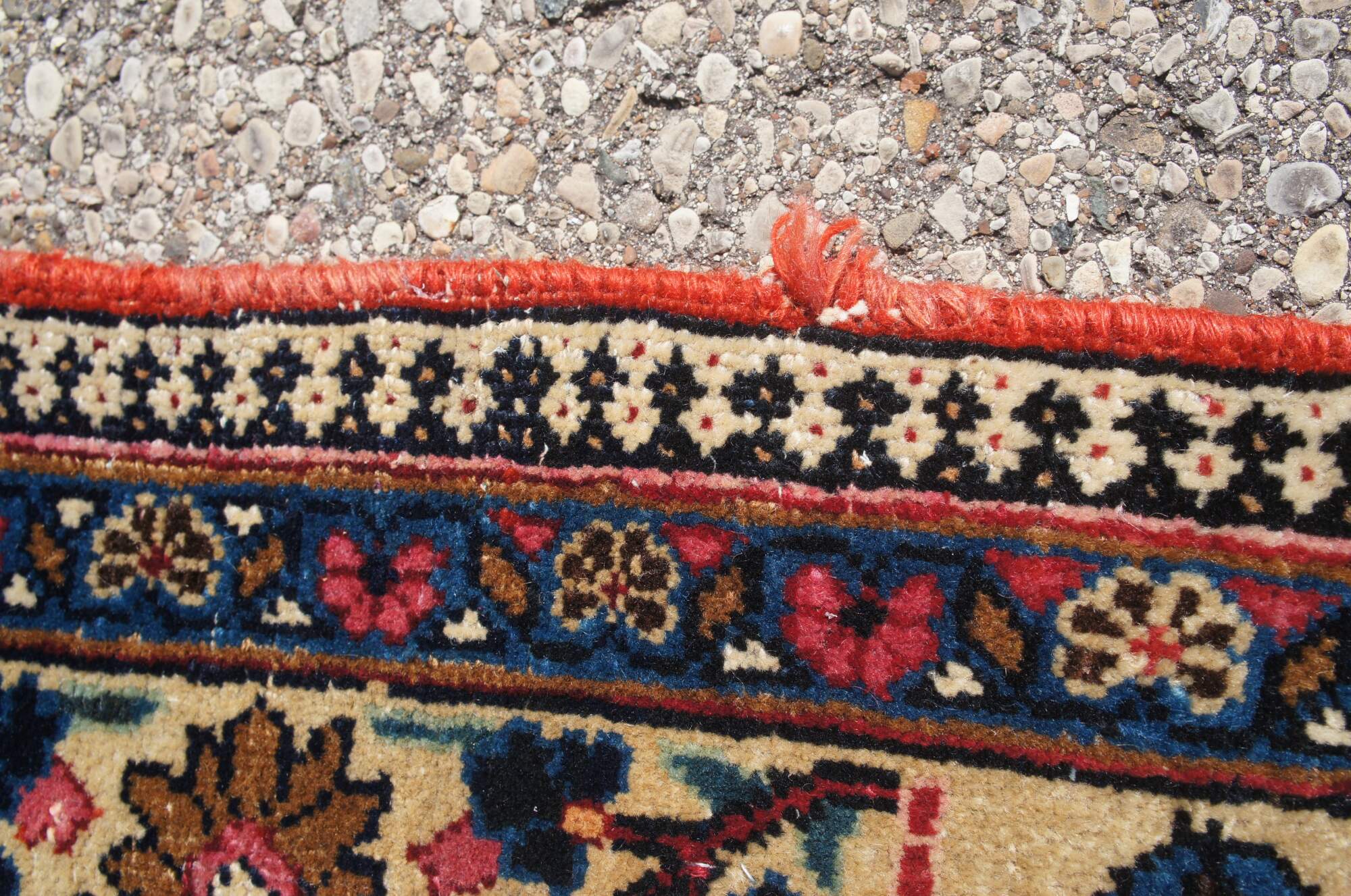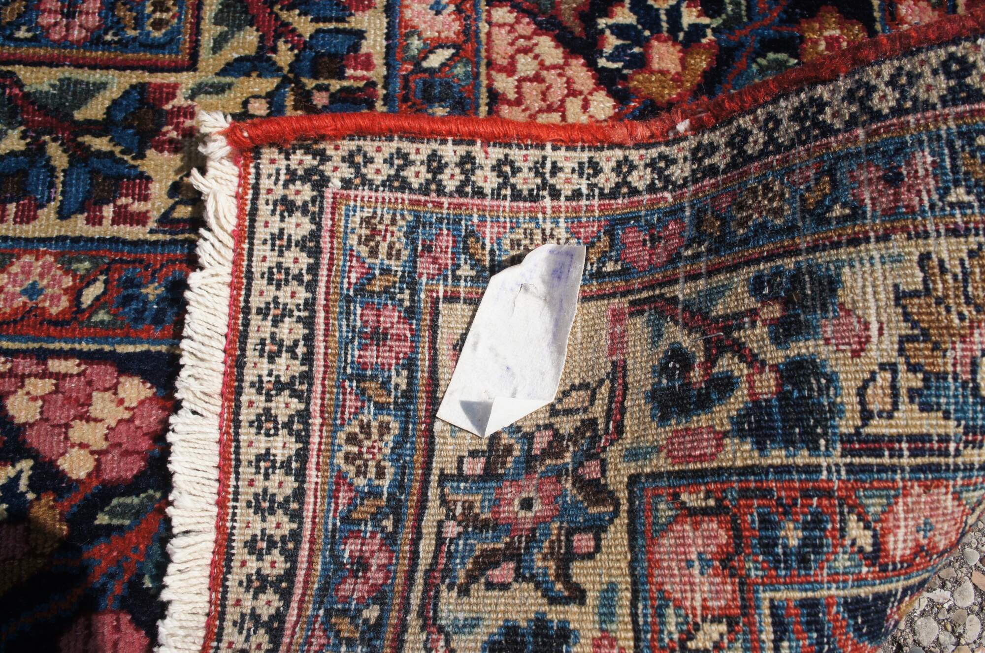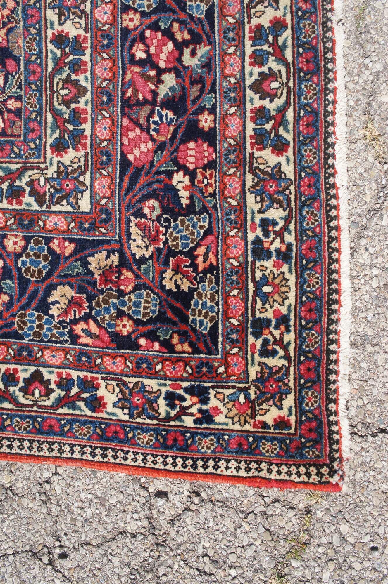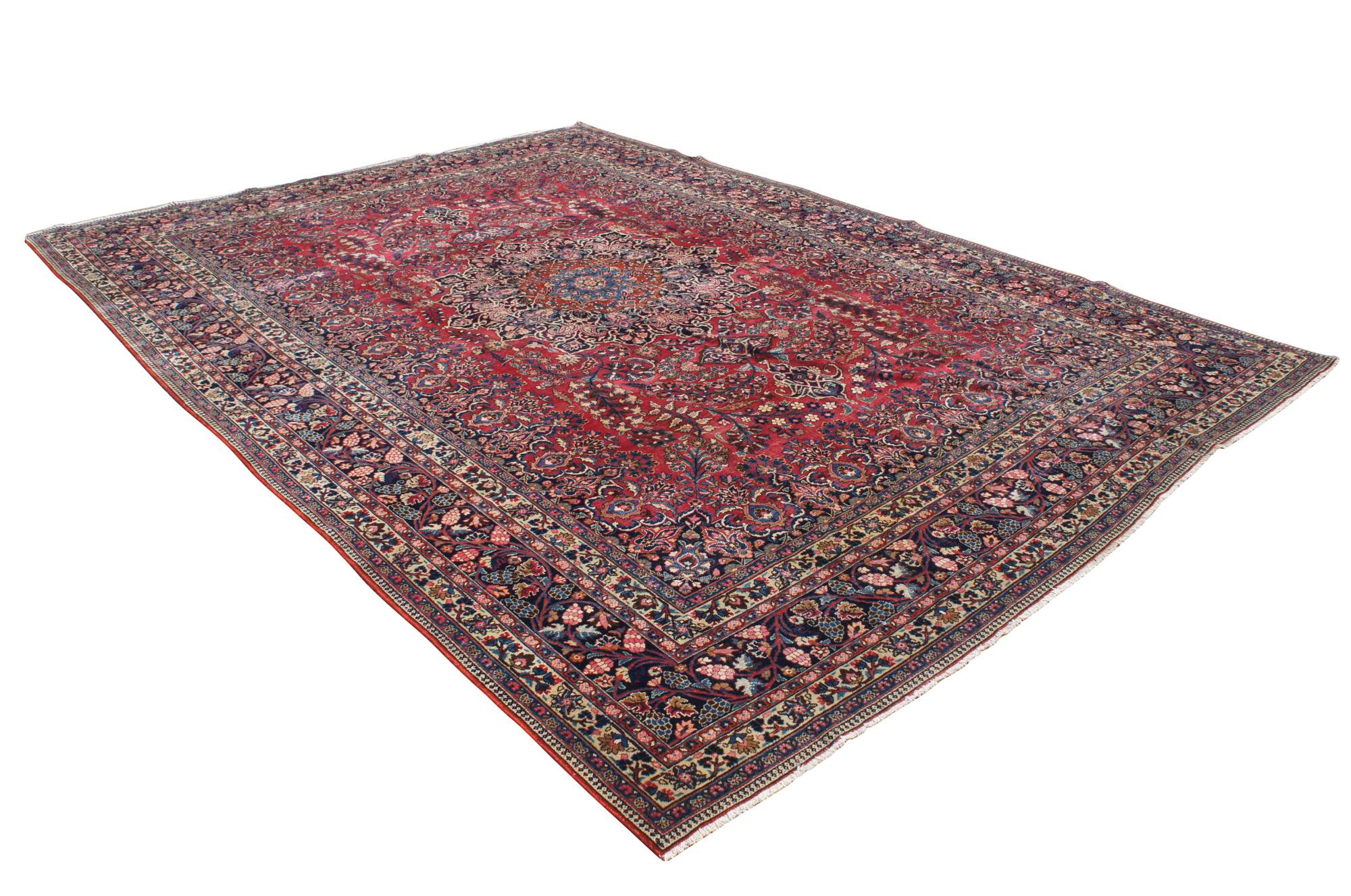 A classic old oriental rug. Features a tight weave in fine soft wool with deep red and dark blue colors. The carpet has a brilliant central medallion and is accented my meticulous floral sprays and a layered border with grape vine motif. 144kpsi (knots per square inch)